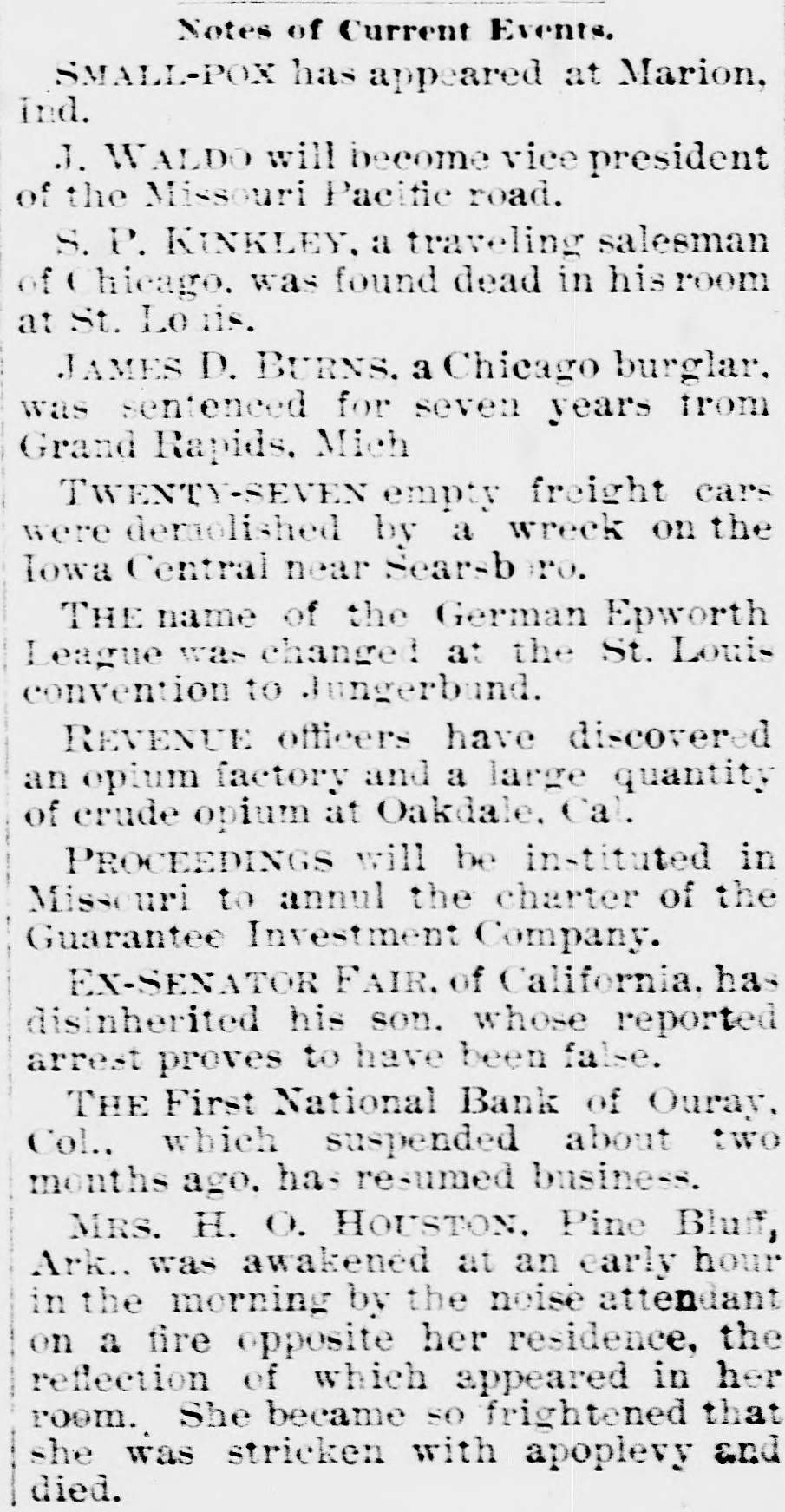 Notes of Current Events. SMALL-POX has appeared at Marion, Ind. J. WALDO will become vice president of the Missouri Pacific road. S. P. KINKLEY, a traveling salesman of Chicago, was found dead in his room at St. Lo ris. JAMES D. BURNS. a Chicago burglar, was sentenced for seven years from Grand Rapids, Mich TWENTY-SEVEN empty freight cars were demolished by a wreck on the Iowa Central near Searsbero. THE name of the German Epworth League was changed at the St. Louis convention to Jungerbund. REVENUE officers have discovered an opium factory and a large quantity of crude opium at Oakdale. Cal. PROCEEDINGS will be instituted in Missouri to annul the charter of the Guarantee Investment Company. EX-SENATOR FAIR. of California. has disinherited his son. whose reported arrest proves to have been false. THE First National Bank of Ouray, Col., which suspended about two months ago, has resumed business. MRS. H. O. HOUSTON. Pine Bluff, Ark.. was awakened at an early hour in the morning by the noise attendant on a fire opposite her residence, the reflection of which appeared in her room. She became so frightened that she was stricken with apoplevy and died.