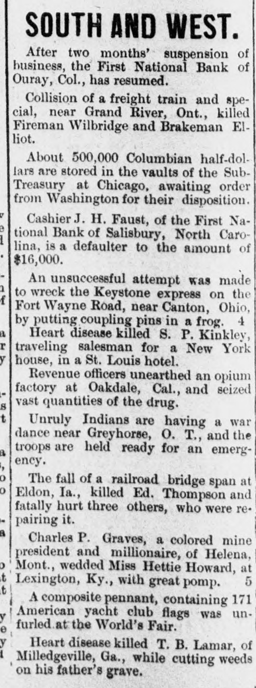 SOUTH AND WEST. After two months' suspension of business, the First National Bank of Ouray, Col., has resumed. Collision of a freight train and special, near Grand River, Ont., killed Fireman Wilbridge and Brakeman Elliot. About 500,000 Columbian half-dollars are stored in the vaults of the SubTreasury at Chicago, awaiting order from Washington for their disposition. Cashier J. H. Faust, of the First National Bank of Salisbury, North Carolina, is a defaulter to the amount of $16,000. An unsuccessful attempt was made to wreck the Keystone express on the f Fort Wayne Road, near Canton, Ohio, by putting coupling pins in a frog. 4 Heart disease killed S. P. Kinkley, r traveling salesman for a New York y house, in a St. Louis hotel. Revenue officers unearthed an opium factory at Oakdale, Cal., and seized vast quantities of the drug. S Unruly Indians are having a war dance near Greyhorse, O. T., and the troops are held ready for an emergency. The fall of a railroad bridge span at Eldon, Ia., killed Ed. Thompson and fatally hurt three others, who were repairing it. a Charles P. Graves, a colored mine president and millionaire, of Helena, Mont., wedded Miss Hettie Howard, at 5 Lexington, Ky., with great pomp. A composite pennant, containing 171 American yacht club flags was unfurled at the World's Fair. Heart disease killed T. B. Lamar, of Milledgeville, Ga., while cutting weeds on his father's grave.