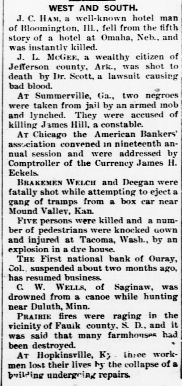 WEST AND SOUTH. J. C. HAM, a well-known hotel man of Bloomington, III., fell from the fifth story of a hotel at Omaha, Neb., and was instantly killed. J. L. McGEE, a wealthy citizen of Jefferson county, Ark., was shot to death by Dr. Scott, a lawsuit causing bad blood. AT Summerville, Ga., two negroes were taken from jail by an armed mob and lynched. They were accused of killing James Hill, a constable. AT Chicago the American Bankers' association convened in nineteenth annual session and were addressed by Comptroller of the Currency James H. Eckels. BRAKEMEN WELCH and Deegan were fatally shot while attempting to eject a gang of tramps from a box car near Mound Valley, Kan. FIVE persons were killed and a number of pedestrians were knocked down and injured at Tacoma, Wash., by an explosion in a dye house. THE First national bank of Ouray, Col., suspended about two months ago, has resumed business. C. W. WELLS, of Saginaw, was drowned from a canoe while hunting near Duluth, Minn. PRAIRIE fires were raging in the vicinity of Fauik county. S. D., and it was said that many farmhouses had been destroyed. AT Hopkinsville, K; in:ee workmen lost their lives by the collapse of a building undergoing repairs.