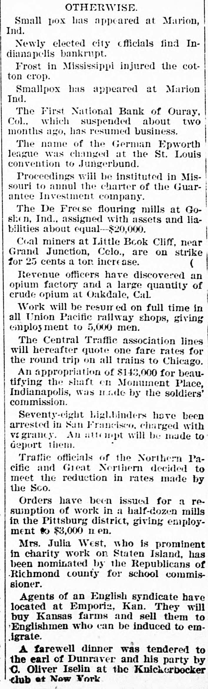 OTHERWISE. Small pox has appeared at Marion, Ind. Newly elected city officials find Indianapelis bankrupt. Frost in Mississippi injured the cotton crop. Smallpox has appeared at Marion Ind. The First National Bank of Ouray, Col., which suspended about two months ago, has resumed business. The name of the German Epworth league was changed at the St. Louis convention to Jungerbund. Proceedings will be instituted in Missouri to annul the charter of the Guarantee Investment company. The De Freese flouring mills at Goshon, Ind., assigned with assets and liabilities about equal-$20,000. Coal miners at Little Book Cliff, near Grand Junction, Celo., are on strike for 25 cents a ton increase. ( Revenue officers have discovered an opium factory and a large quantity of crude opium at Oakdale, Cal. Work will be resum on full time in all Union Pacific railway shops, giving employ ment to 5,000 men. The Central Traffic association lines will hereafter quote one fare rates for the round trip on all trains to Chicago. An appropriation of $143,000 for beautifying the shaft on Monument Place, Indianapolis, was made by the soldiers' commission. Seventy-eight highbinders have been arrested in San Francisco, charged with vagrancy. An atte mpt will be made to deport them. Traffic officials of the Northern Pacific and Great Northern decided to meet the reduction in rates made by the Sco. Orders have been issued for a resumption of work in a half-dozen mills in the Pittsburg district, giving employment to $3,000 II en. Mrs. Julia West, who is prominent in charity work on Staten Island, has been nominated by the Republicans of Richmond county for school commissioner. Agents of an English syndicate have located at Emporia, Kan. They will buy Kansas farms and sell them to Englishmen who can be induced to emligrate. A farewell dinner was tendered to the earl of Dunraver and his party by C. Oliver Iselin at the Knickerbocker club at New York