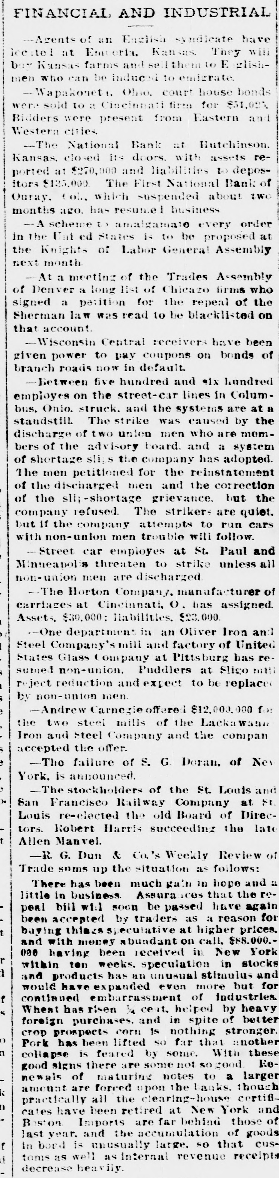 FINANCIAL AND INDUSTRIAL --Agents of an English syndicate have lecitel at Emuoria. Kansas. They will buy Kansas farms and sellthem to E glishmen who can be induced to emigrate. - Wapakoneti, Ohio. court house bonds were sold to a Cincinnati firm for $51,025 Bidders were present from Eastern and Western cities. -The National Bank at Hutchinson. Kansas. closed its doors. with assets reported at $270,000 and liabilities to depositors $135,000 The First National Bank of Ouray. Col., which suspended about two months ago, has resume business -A scheme to amalgamate every order in the Uni ed States is to be proposed at the Knights of Labor General Assembly next month At a meeting of the Trades Assembly of Denver a long list of Chicago firms who signed a patition for the repeal of the Sherman law was read to be blacklisted on that account. -Wisconsin Central receivers have been given power to pay coupons on bonds of branch roads now in default. -Between five hundred and six hundred employes on the street-car lines in Columbus. Onio. struck. and the systems are at a standstill. The strike was caused by the discharge of two union men who are members of the advisory board. and a system of shortage sli; the company has adopted. The men petitioned for the reinstatement of the discharged men and the correction of the slij-shortage grievance. but the company refused. The strikers are quiet. but if the company attempts to run cars with non-union men trouble will follow. -Street car employes at St. Paul and Minneapolis threaten to strike unless all non-union men are discharged -The Horton Company, manufacturer of carriages at Cincinnati, O. has assigned. Assets, $30,000: liabilities. $23,000. -One department in an Oliver Iron and Steel Company's mill and factory of United States Glass Company at Pittsburg has resumed non-union. Puddlers at Sligo mil reject reduction and expect to be replace by non-union men. -Andrew Carnegie $12,000.000 for the two steel mills of the Lackawann Iron and Steel Company and the compan accepted the offer. -The failure of S. G. Doran, of Nev York, is announced. -The stockholders of the St. Louis and San Francisco Railway Company at 51 Louis re-elected the old Board of Direc tors. Robert Harris succeeding the late Allen Manvel. -R. G. Dun & Co.'s Weekly Review o Trade sums up the situation as follows: There has been much gain In hope and : little in business. Assura ices that the re peal bill will soon be passed have again been accepted by traders as a reason fo buying things speculative at higher prices t and with money abundant on call, $88.000. 000 having been received in New York r within ton weeks. speculation in stock 1 and products has an unusual stimulus and would have expanded even more but fo continued embarrassment of industries f Whest has risen ½ ceat. helped by heavy foreign purchases. and in spite of bette crop prospects corn Is nothing stronger Pork has been lifted SO far that anothe collapse is feared by some. With thes good signs there are some not sogood. Re newals of maturing notes to a large