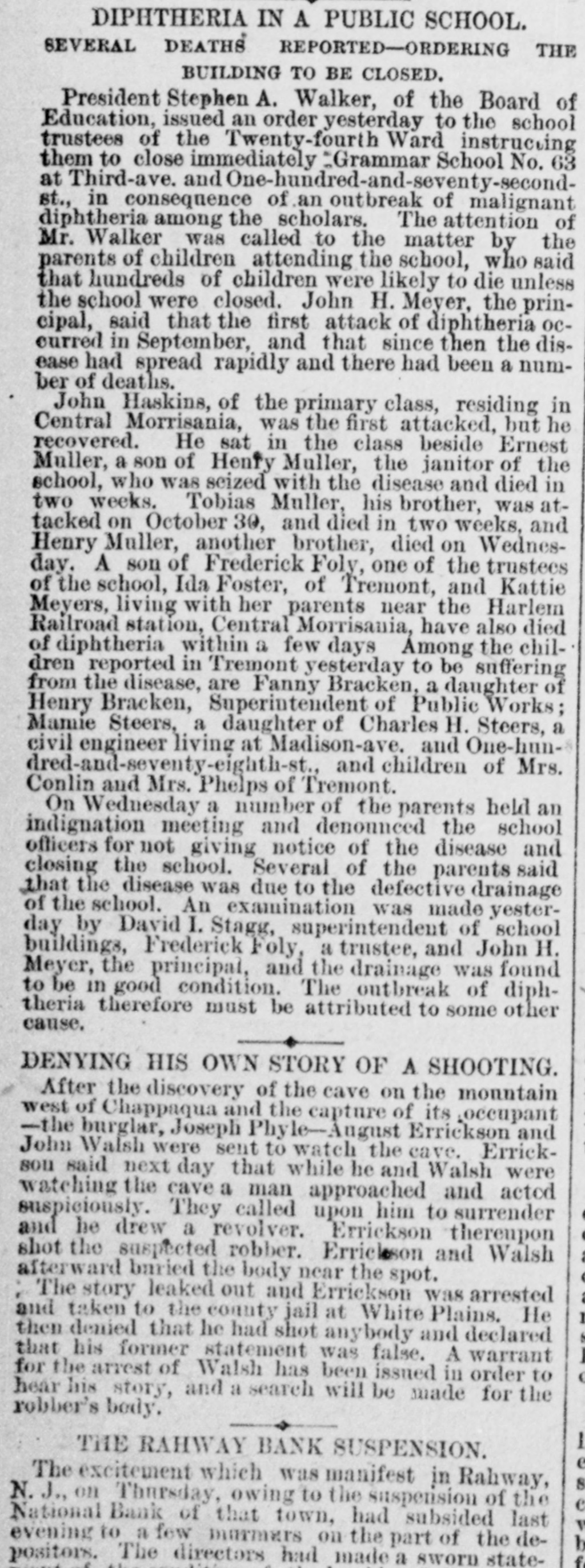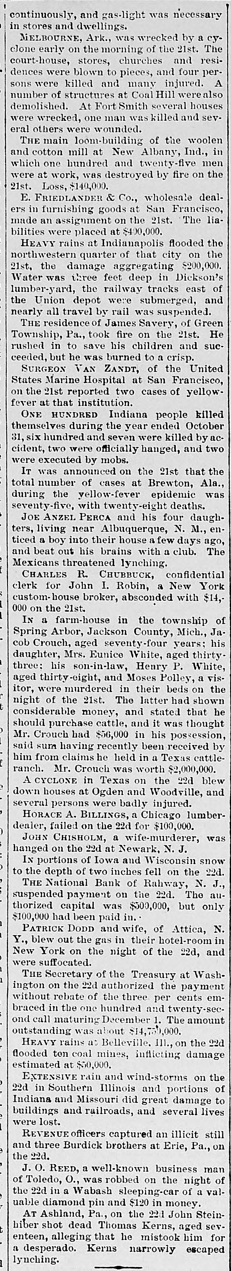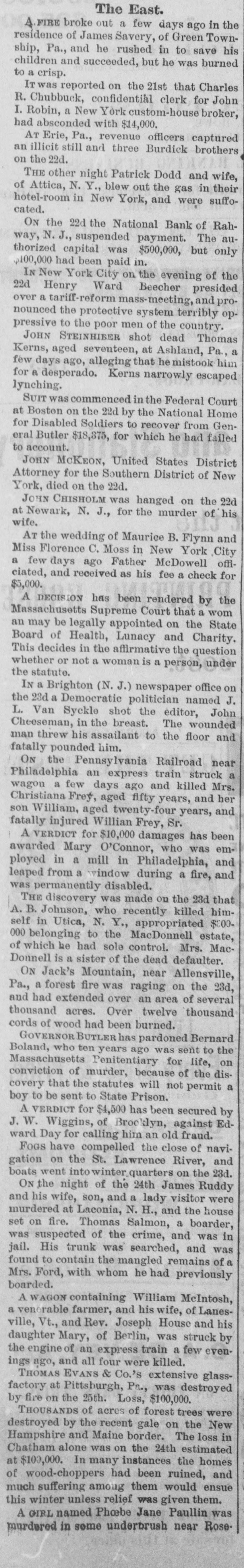 The East. 4 FIRE broke out a few days ago in the residence of James Savery, of Green Township, Pa., and he rushed in to save his children and succeeded, but he was burned to a crisp. IT was reported on the 21st that Charles R. Chubbuck, confidential clerk for John I. Robin, a New York custom-house broker, had absconded with $14,000. AT Erie, Pa., revenue officers captured an illicit still and three Burdick brothers on the 22d. THE other night Patrick Dodd and wife, of Attica, N. Y., blew out the gas in their hotel-room in New York, and were suffocated. ON the 22d the National Bank of Rahway, N. J., suspended payment. The authorized capital was $500,000, but only $100,000 had been paid in. IN New York City on the evening of the 22d Henry Ward Beecher presided over a tariff-reform meeting, and pronounced the protective system terribly oppressive to the poor men of the country. JOHN STEINHIBER shot dead Thomas Kerns, aged seventeen, at Ashland, Pa., a few days ago, alleging that he mistook him for a desperado. Kerns narrowly escaped lynching. SUIT was commenced in the Federal Court at Boston on the 22d by the National Home for Disabled Soldiers to recover from General Butler $18,375, for which he had failed to account. JOHN MCKEON, United States District Attorney for the Southern District of New York, died on the 22d. JOHN CHISHOLM was hanged on the 22d at Newark, N. J., for the murder of his wife. AT the wedding of Maurice B. Flynn and Miss Florence C. Moss in New York City a few days ago Father McDowell officiated, and received as his fee a check for $5,000. A DECISION has been rendered by the Massachusetts Supreme Court that a wom an may be legally appointed on the State Board of Health, Lunacy and Charity. This decides in the affirmative the question whether or not a woman is a person, under the statute. IN a Brighton (N. J.) newspaper office on the 23d a Democratic politician named J. L. Van Syckle shot the èditor, John Cheeseman, in the breast. The wounded man threw his assailant to the floor and fatally pounded him. ON the Pennsylvania Railroad near Philadelphia an express train struck a wagon a few days ago and killed Mrs. Christiana Frey, aged fifty years, and her son William, aged twenty-four years, and fatally injured Willian Frey, Sr. A VERDICT for $10,000 damages has been awarded Mary O'Connor, who was employed in a mill in Philadelphia, and leaped from a window during a fire, and was permanently disabled. THE discovery was made on the 23d that A. B. Johnson, who recently killed himself in Utica, N. Y., appropriated $800000 belonging to the MacDonnell estate, of which he had sole control. Mrs. MacDonnell is a sister of the dead defaulter. ON Jack's Mountain, near Allensville, Pa., a forest fire was raging on the 23d, and had extended over an area of several thousand acres. Over twelve thousand cords of wood had been burned. GOVERNOR BUTLER has pardoned Bernard Boland, who ten years ago was sent to the Massachusetts Penitentiary for life, on conviction of murder, because of the discovery that the statutes will not permit a boy to be sent to State Prison. A VERDICT for $4,500 has been secured by J. W. Wiggins, of klyn, against Edward Day for calling him an old fraud. Fogs have compelled the close of navigation on the St. Lawrence River, and boats went intowinter quarters on the 23d. ON the night of the 24th James Ruddy and his wife, son, and a lady visitor were murdered at Laconia, N. H., and the house set on fire. Thomas Salmon, a boarder, was suspected of the crime, and was in jail. His trunk was searched, and was found to contain the mangled remains of a Mrs. Ford, with whom he had previously boarded. A WAGON containing William McIntosh, a venerable farmer, and his wife, of Lanesville, Vt., and Rev. Joseph House and his daughter Mary, of Berlin, was struck by the engine of an express train a few evenings ago, and all four were killed. THOMAS EVANS & Co.'s extensive glassfactory at Pittsburgh, Pa., was destroyed by fire on the 25th. Loss, $100,000. THOUSANDS of acres of forest trees were destroyed by the recent gale on the New Hampshire and Maine border. The loss in Chatham alone was on the 24th estimated at $100,000. In many instances the homes of wood-choppers had been ruined, and much suffering among them would ensue this winter unless relief was given them. A GIRL named Phoebe Jane Paullin was murdered in some underbrush near Rose-