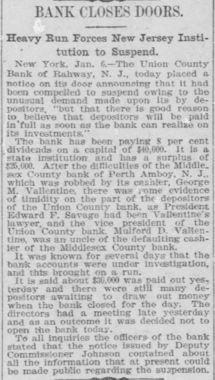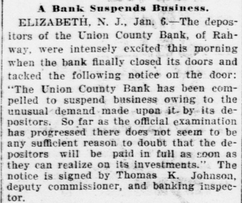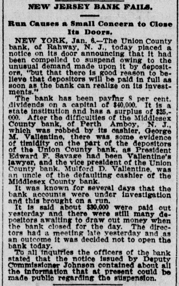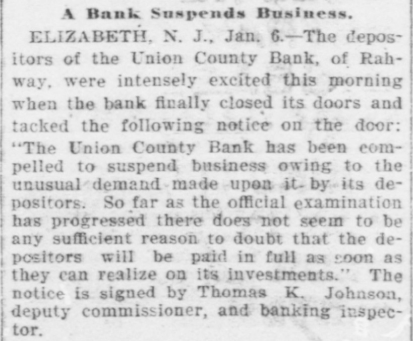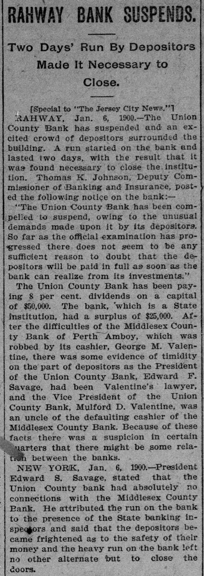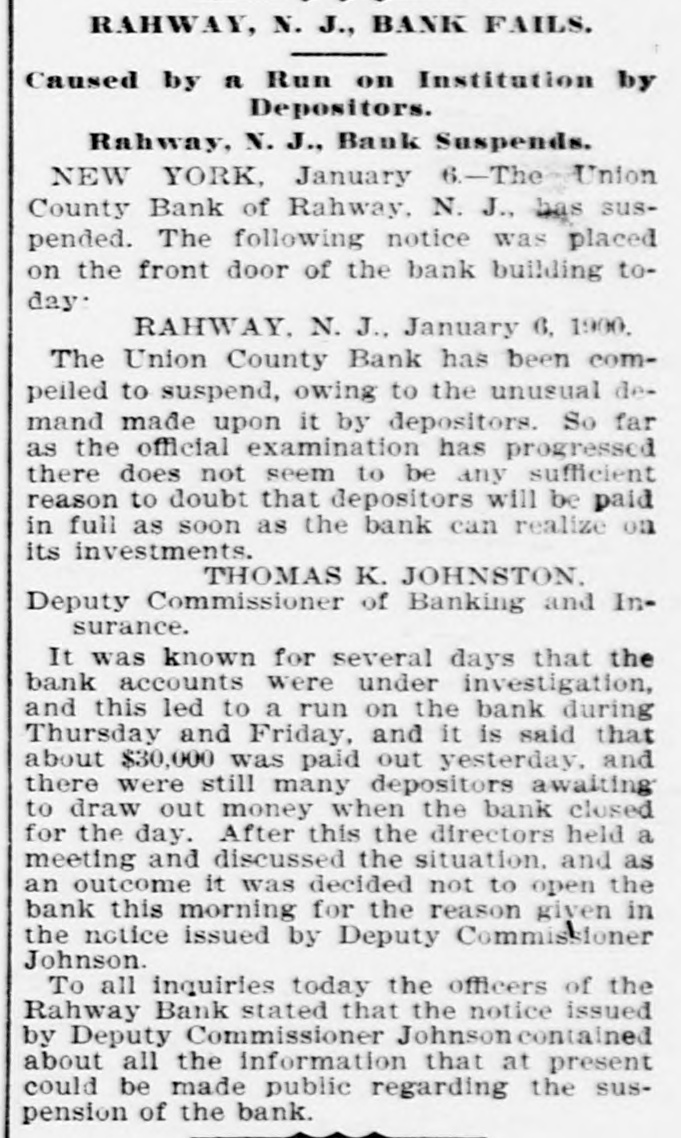 RAHWAY, N. J., BANK FAILS. Caused by a Run on Institution by Depositors. Rahway, N. J., Bank Suspends. NEW YORK, January 6.-The-Union County Bank of Rahway, N. J., has suspended. The following notice was placed on the front door of the bank building today RAHWAY, N. J., January 6. 1900. The Union County Bank has been compeiled to suspend, owing to the unusual demand made upon it by depositors. So far as the official examination has progressed there does not seem to be any sufficient reason to doubt that depositors will be paid in full as soon as the bank can realize on its investments. THOMAS K. JOHNSTON. Deputy Commissioner of Banking and Insurance. It was known for several days that the bank accounts were under investigation, and this led to a run on the bank during Thursday and Friday, and it is said that about $30,000 was paid out yesterday, and there were still many depositors awaiting to draw out money when the bank closed for the day. After this the directors held a meeting and discussed the situation. and as an outcome it was decided not to open the bank this morning for the reason given in the notice issued by Deputy Commissioner Johnson. To all inquiries today the officers of the Rahway Bank stated that the notice issued by Deputy Commissioner Johnson contained about all the information that at present could be made public regarding the suspension of the bank.
