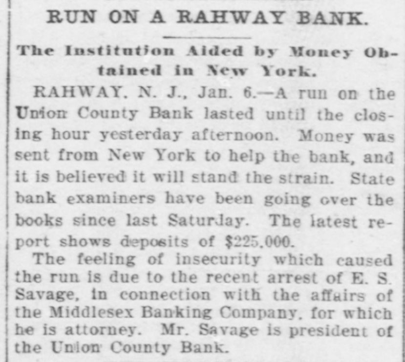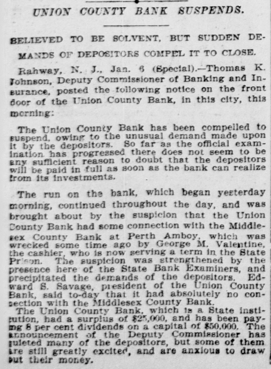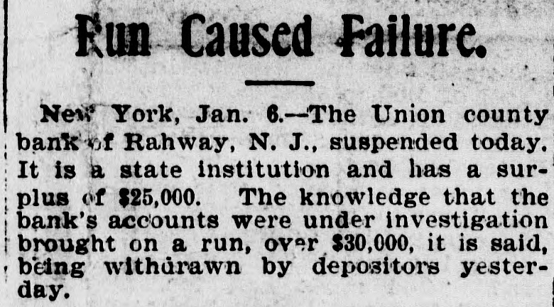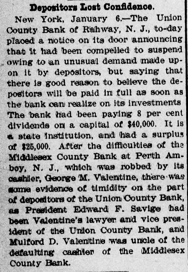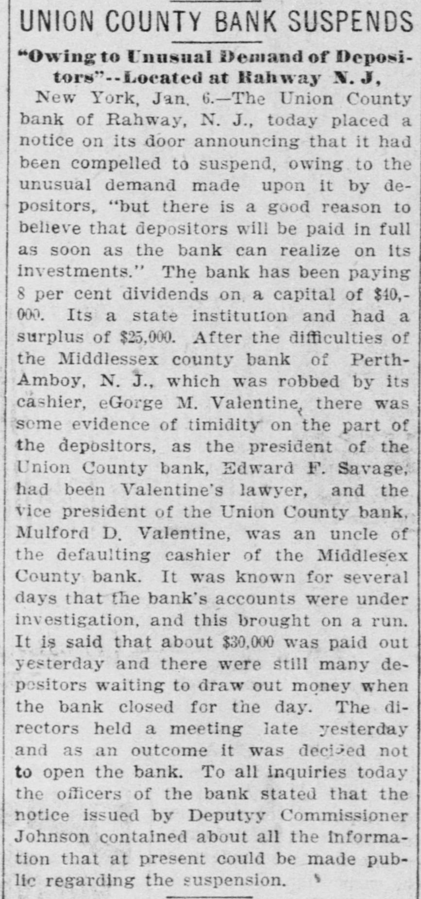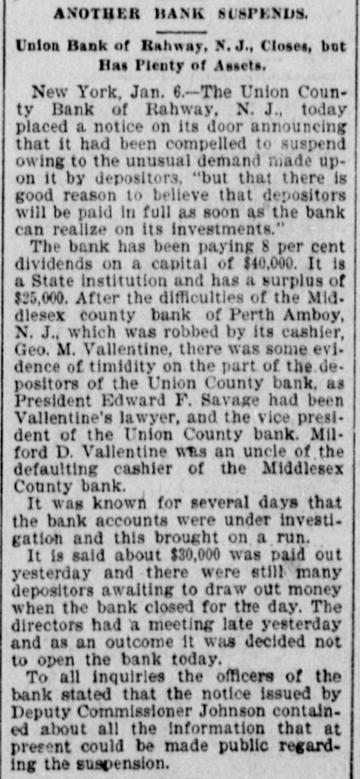 RAHWAY, N. J., BANK FAILS. Caused by a Run on Institution by Depositors. Rahway, N. J., Bank Suspends. NEW YORK, January 6.-The-Union County Bank of Rahway, N. J., has suspended. The following notice was placed on the front door of the bank building today RAHWAY, N. J., January 6. 1900. The Union County Bank has been compeiled to suspend, owing to the unusual demand made upon it by depositors. So far as the official examination has progressed there does not seem to be any sufficient reason to doubt that depositors will be paid in full as soon as the bank can realize on its investments. THOMAS K. JOHNSTON. Deputy Commissioner of Banking and Insurance. It was known for several days that the bank accounts were under investigation, and this led to a run on the bank during Thursday and Friday, and it is said that about $30,000 was paid out yesterday, and there were still many depositors awaiting to draw out money when the bank closed for the day. After this the directors held a meeting and discussed the situation. and as an outcome it was decided not to open the bank this morning for the reason given in the notice issued by Deputy Commissioner Johnson. To all inquiries today the officers of the Rahway Bank stated that the notice issued by Deputy Commissioner Johnson contained about all the information that at present could be made public regarding the suspension of the bank.