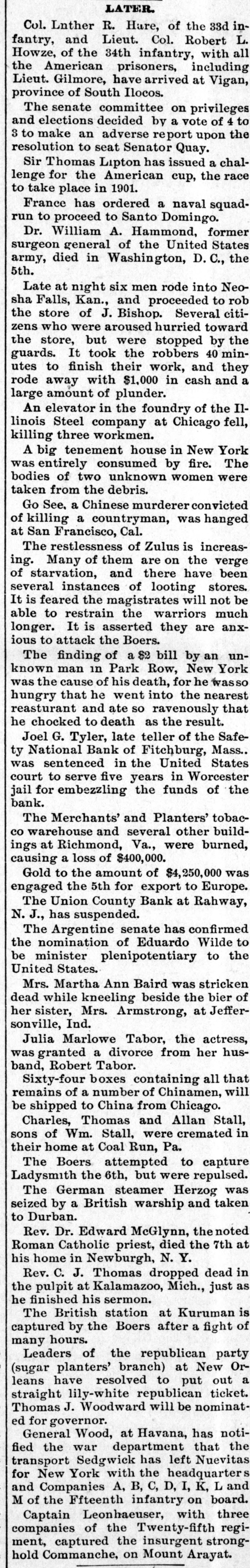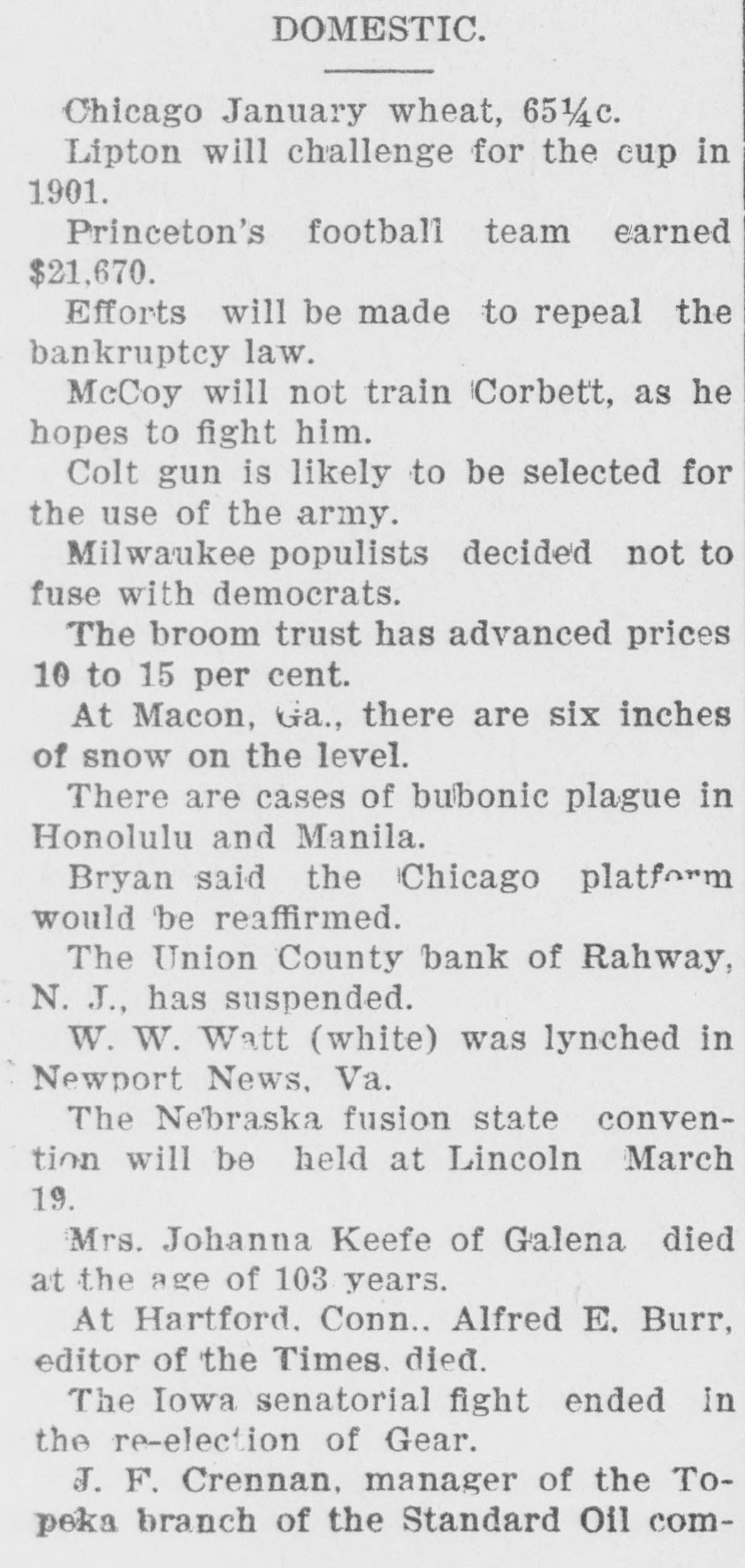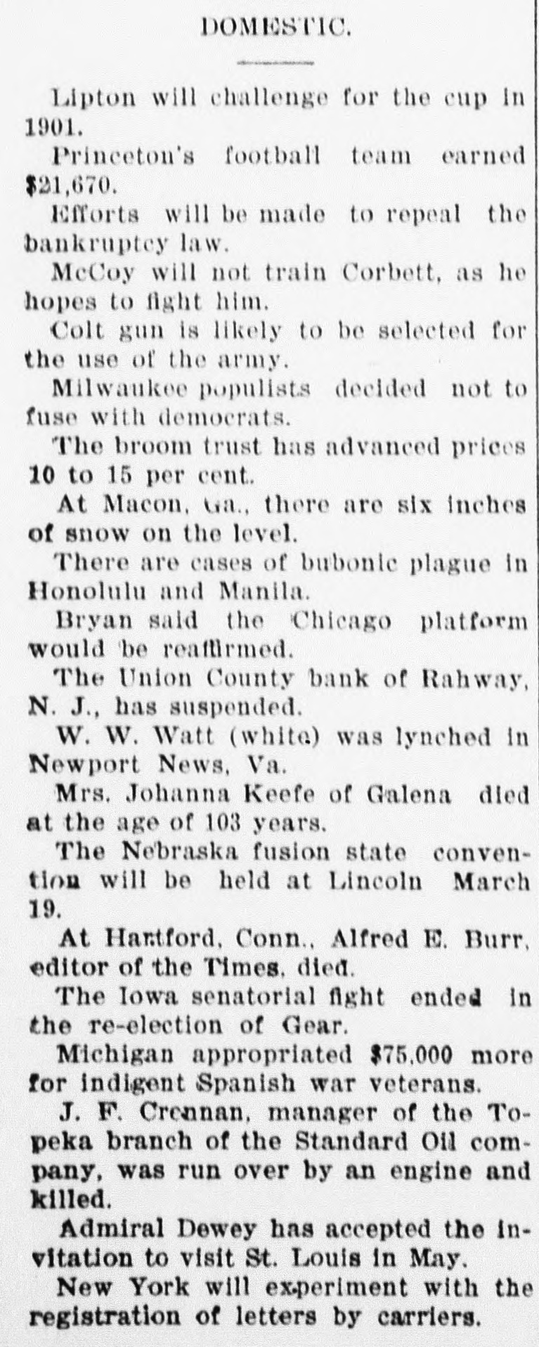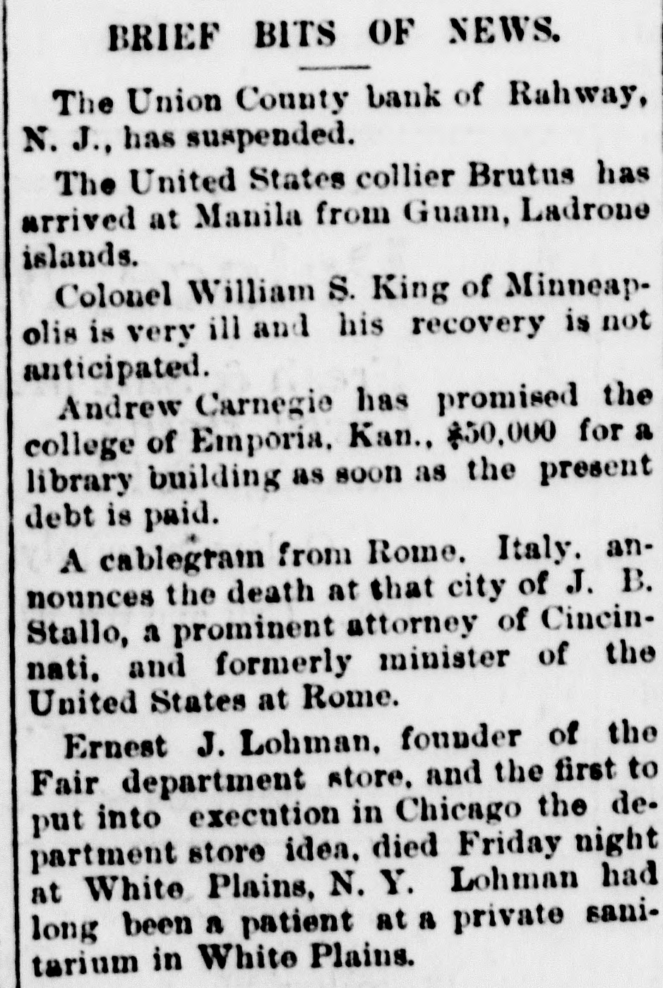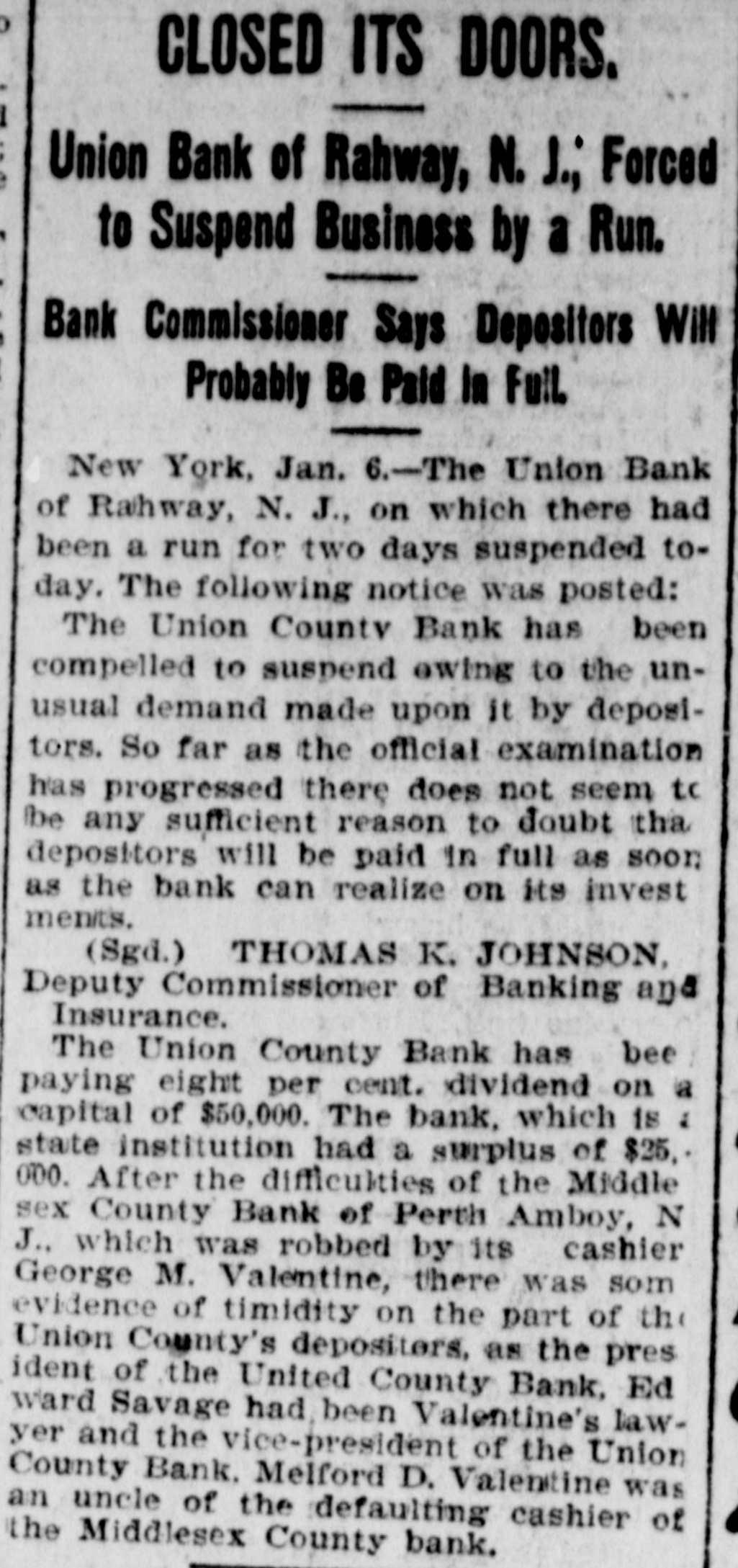 RAHWAY, N. J., BANK FAILS. Caused by a Run on Institution by Depositors. Rahway, N. J., Bank Suspends. NEW YORK, January 6.-The-Union County Bank of Rahway, N. J., has suspended. The following notice was placed on the front door of the bank building today RAHWAY, N. J., January 6. 1900. The Union County Bank has been compeiled to suspend, owing to the unusual demand made upon it by depositors. So far as the official examination has progressed there does not seem to be any sufficient reason to doubt that depositors will be paid in full as soon as the bank can realize on its investments. THOMAS K. JOHNSTON. Deputy Commissioner of Banking and Insurance. It was known for several days that the bank accounts were under investigation, and this led to a run on the bank during Thursday and Friday, and it is said that about $30,000 was paid out yesterday, and there were still many depositors awaiting to draw out money when the bank closed for the day. After this the directors held a meeting and discussed the situation. and as an outcome it was decided not to open the bank this morning for the reason given in the notice issued by Deputy Commissioner Johnson. To all inquiries today the officers of the Rahway Bank stated that the notice issued by Deputy Commissioner Johnson contained about all the information that at present could be made public regarding the suspension of the bank.