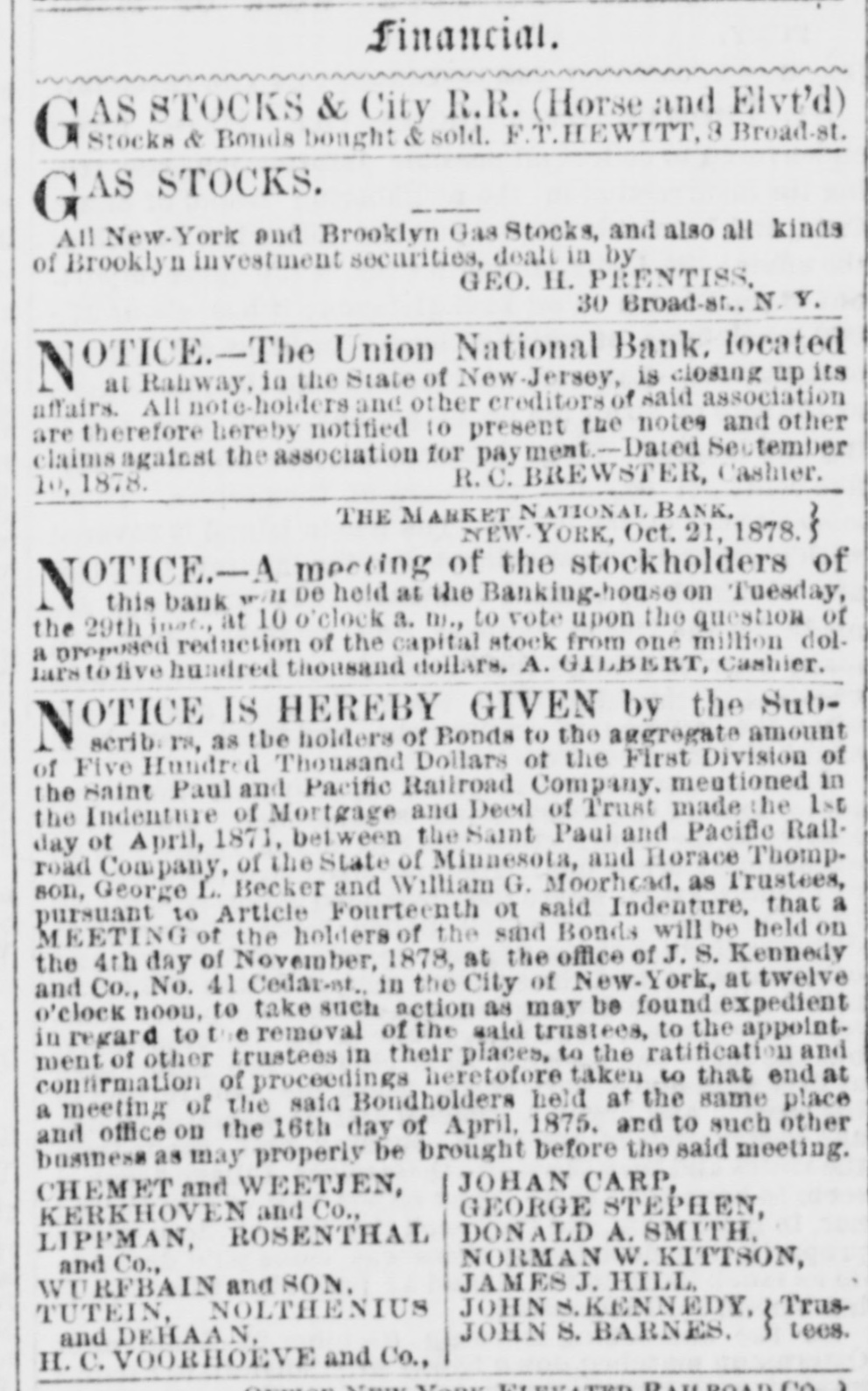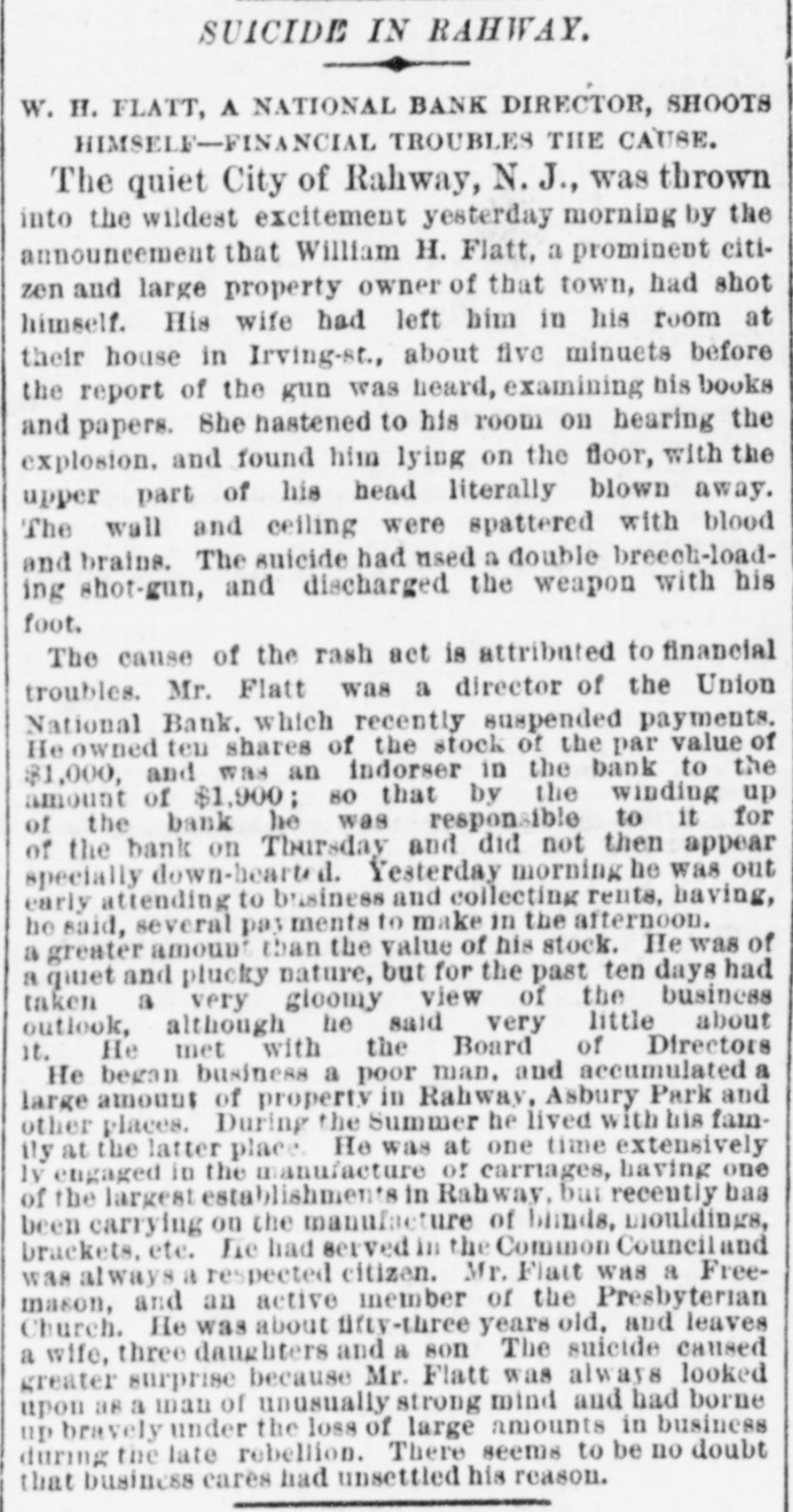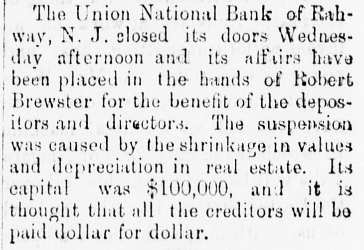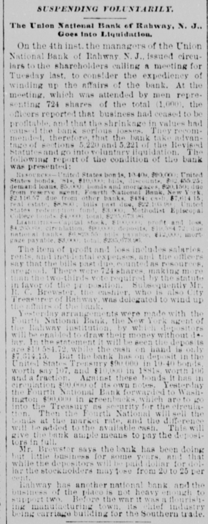 A NATIONAL BANK CLOSED. VOLUNTARY LIQUIDATION OF THE UNION NATIONAL BANK OF RAHWAY. The Union National Bank of Rahway, N. J., decided, on Tuesday, by a unanimous vote of the stockholders present, 734 shares being represented, to go into voluntary liquidation. A reporter of THE TRIBUNE talked last night with Jonathan Woodruft and Robert Brewster, the pres ident and cashier of the bank, in regard to the matter. They stated emphatically that the story about the appointment of a receiver for the bank was without foundation; no such action had been taken or was con templated. For the past six months the directors hadbeen considering the advisability of going into voluntary liquidation and winding up the affairs of the bank. About two weeks ago, President Woodruff went to Washington and had an interview with the Controller of the Currency, and the result of their consultation was the issuing of a circular to the stockholders to attend a meeting on Tuesday, for the purpose of voting upon the question of going into voluntary liquidation, under the provisions of Sections 5,220 and 5,221 of the Revised Statutes of the United States. This course was decided upon, because the bank was not paying expenses. The bank was organizedin 1865, and up to a year ago was paying from 7 to 12 per cent dividends; but last Spring, for the tirst time, the dividend was passed. The deposits ran down from $100,000 a year to less than $20,000. This, with the high rate of taxation, local and Government, made it impossible for the bank to make any money, and it concluded to go out of business. The bank has ceased to do any business, and is prepared to pay all claims promptly on demand. The loss to stockholders will be from $20,000 to $25,000. or from 20 to 25 per cent of their capital stock. The bank has $7,614 15 in cash; the difference between circulation and the face of its Government bonds is $16,000; the redemption fund is $3,000, and its deposits are $19,584 72. This makes the bank abundantly able to meet all demands upon it. The assets, with care and some delay, may possibly bring more than is now estimated.