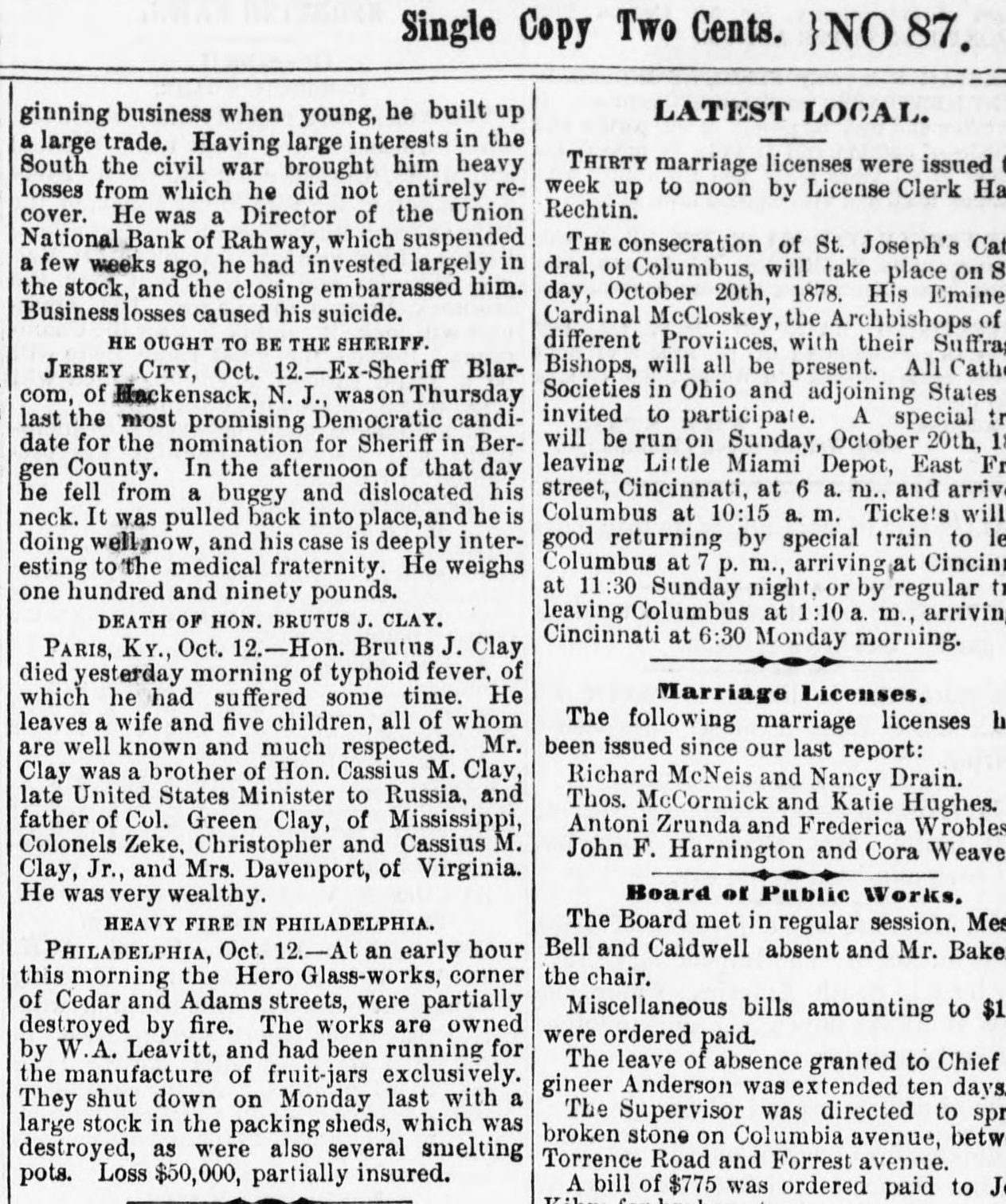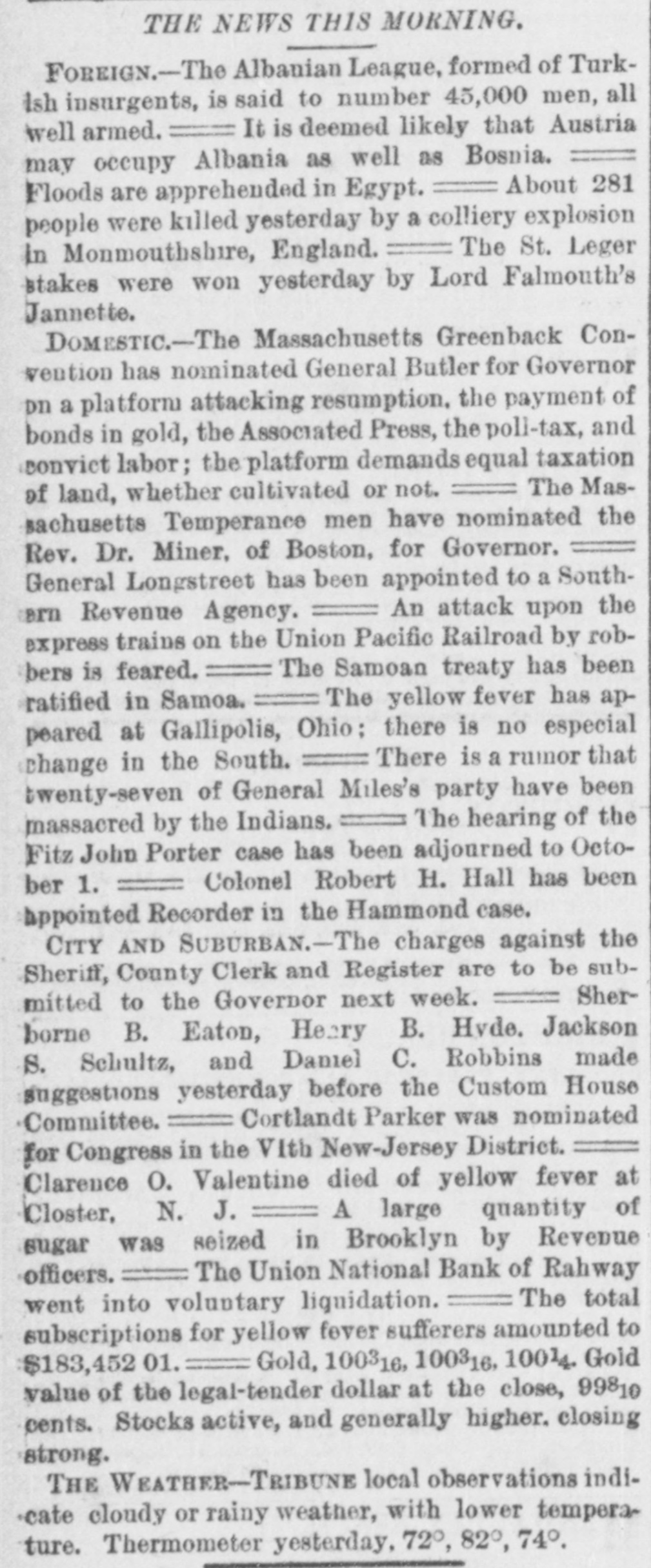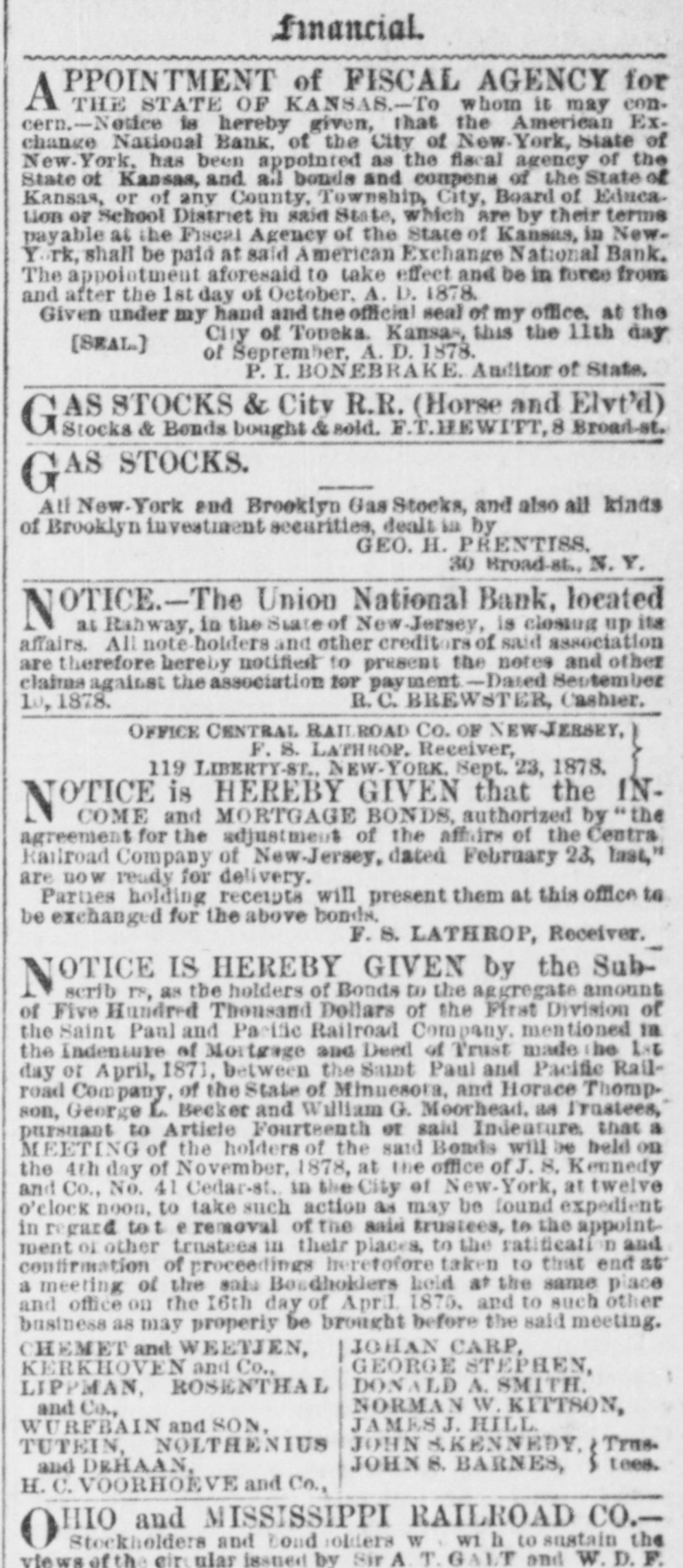 A NATIONAL BANK CLOSED. VOLUNTARY LIQUIDATION OF THE UNION NATIONAL BANK OF RAHWAY. The Union National Bank of Rahway, N. J., decided, on Tuesday, by a unanimous vote of the stockholders present, 734 shares being represented, to go into voluntary liquidation. A reporter of THE TRIBUNE talked last night with Jonathan Woodruft and Robert Brewster, the pres ident and cashier of the bank, in regard to the matter. They stated emphatically that the story about the appointment of a receiver for the bank was without foundation; no such action had been taken or was con templated. For the past six months the directors hadbeen considering the advisability of going into voluntary liquidation and winding up the affairs of the bank. About two weeks ago, President Woodruff went to Washington and had an interview with the Controller of the Currency, and the result of their consultation was the issuing of a circular to the stockholders to attend a meeting on Tuesday, for the purpose of voting upon the question of going into voluntary liquidation, under the provisions of Sections 5,220 and 5,221 of the Revised Statutes of the United States. This course was decided upon, because the bank was not paying expenses. The bank was organizedin 1865, and up to a year ago was paying from 7 to 12 per cent dividends; but last Spring, for the tirst time, the dividend was passed. The deposits ran down from $100,000 a year to less than $20,000. This, with the high rate of taxation, local and Government, made it impossible for the bank to make any money, and it concluded to go out of business. The bank has ceased to do any business, and is prepared to pay all claims promptly on demand. The loss to stockholders will be from $20,000 to $25,000. or from 20 to 25 per cent of their capital stock. The bank has $7,614 15 in cash; the difference between circulation and the face of its Government bonds is $16,000; the redemption fund is $3,000, and its deposits are $19,584 72. This makes the bank abundantly able to meet all demands upon it. The assets, with care and some delay, may possibly bring more than is now estimated.