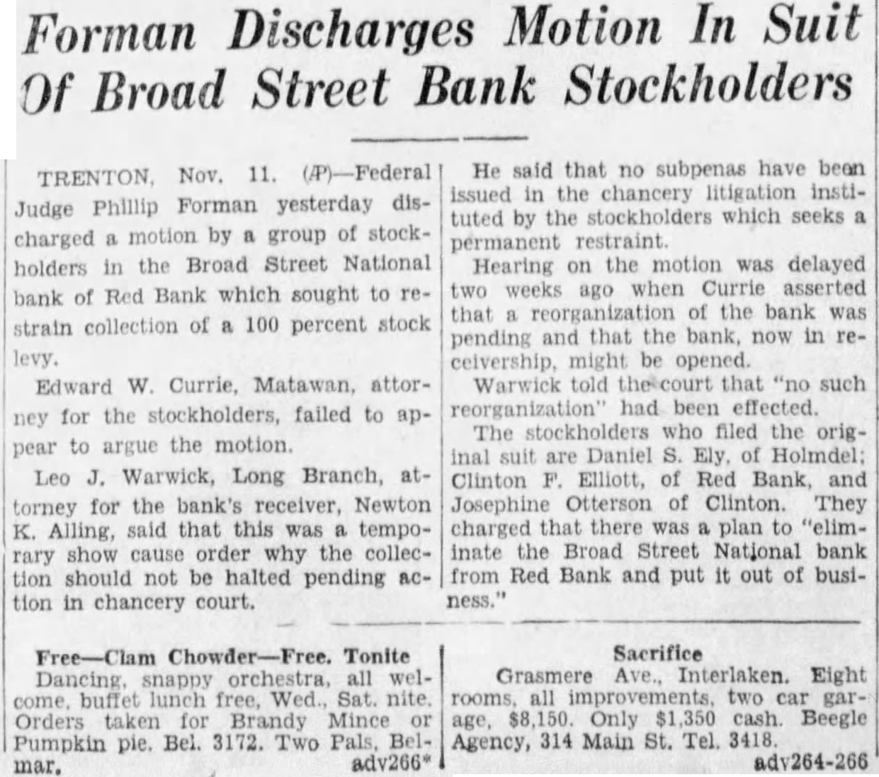 RED BANK, Nov. Judge Phillip Forman Trenton yesterday discharged group stockholders the Broad Street National Bank of Red Bank which sought to restrain collection 100 per stock levy. Edward Currie, Matawan, torney for the stockholders, failed to argue motion. Judge Leo Warwick, Long attorney for the bank's ceiver, Newton Alling, said that this temporary show cause order why the collection should not be halted pending action in chancery court. He said that no subpoenas have been issued the chancery litigainstituted by the stockholders which seeks permanent restraint. Hearing on the motion was delayed two weeks ago when Currie serted that reorganization the bank was pending and that bank, now receivership, might opened. Judge Warwick told the court that reorganization" effected. The stockholders who filed the original suit are Holmdel: Clinton Elliott, Red Bank, and Clinton. They charged that there plan "eliminate the Broad Street National Bank from Red Bank and out of business.'