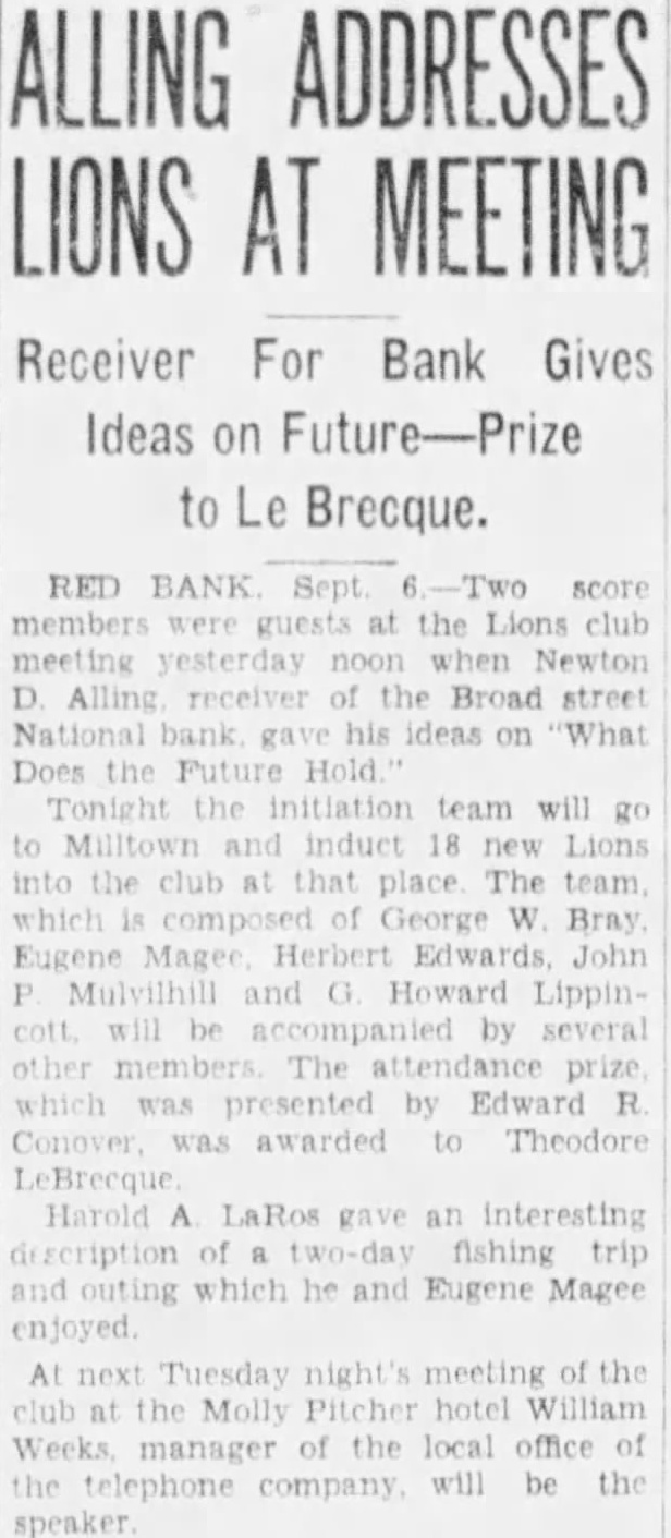 RED BANK score at the Lions club meeting yesterday Newton Alling receiver the Broad street National ideas on What Does the team will Milltown induct The George Bray Eugene Herbert John Howard Lippinseveral The attendance by Edward Conover was awarded Theodore LeBrecque Harold an interesting of two-day fishing trip which and Eugene Magee enjoyed.