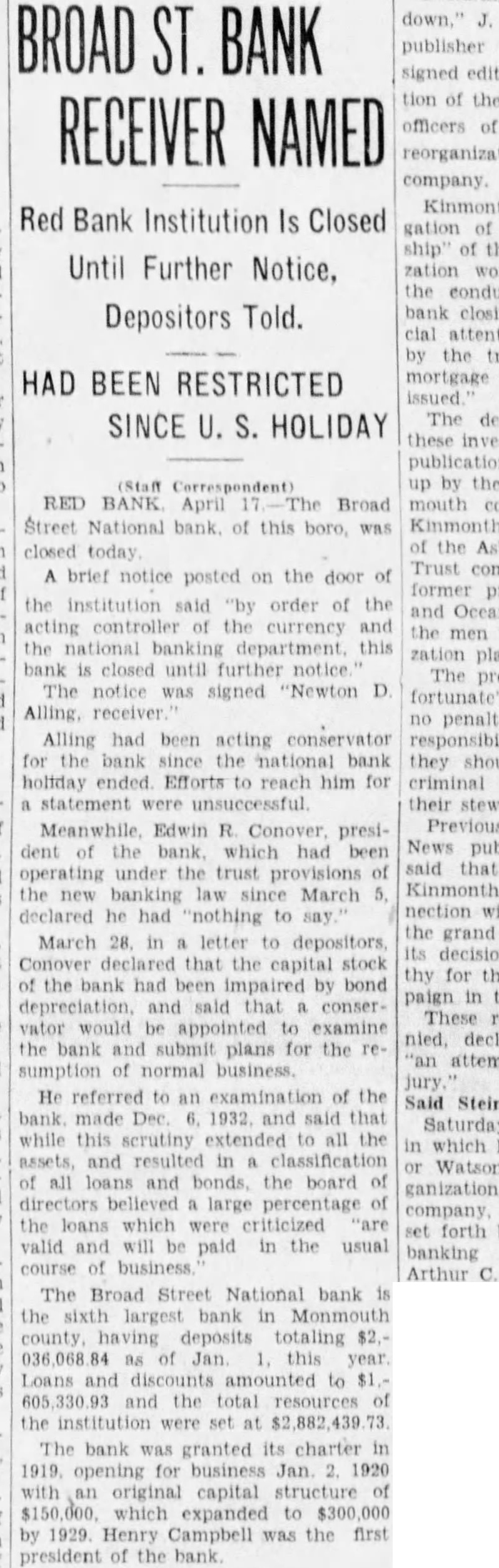 BANK April Broad Street National bank of this boro, closed today brief notice posted the door the said order of the the currency and the further notice notice was signed "Newton Alling had been acting responsibility Efforts Meanwhile Edwin presibeen operating under the banking March the grand March letter depositors decision Conover that the capital the bank had been impaired bond conser would appointed examine bank submit plans for the sumption normal He referred the and scrutiny extended and resulted classification and the board directors believed large which were criticized paid in the usual business