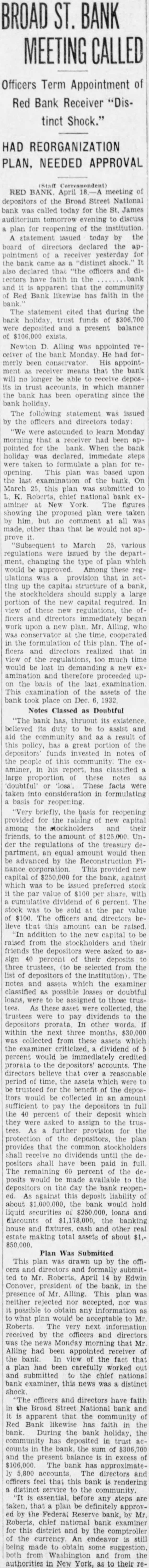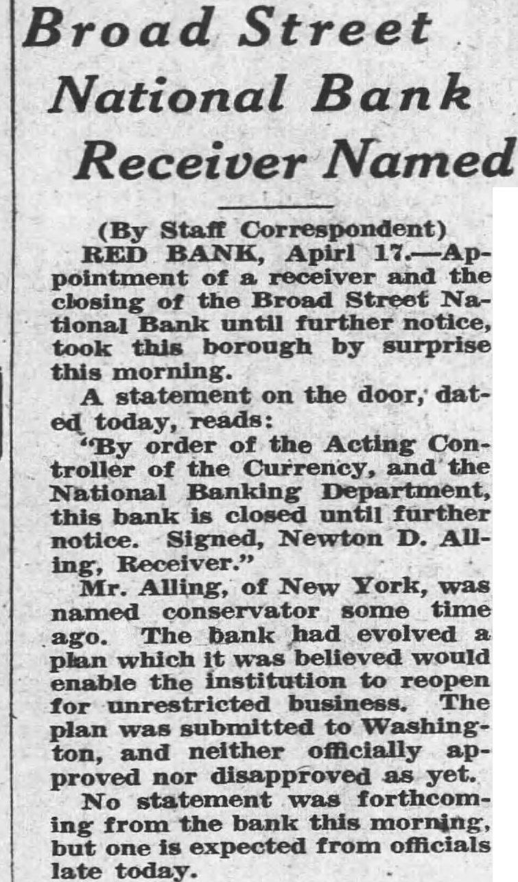 (By Staff RED BANK, Apirl pointment of receiver and the closing the Broad Street National Bank until further notice, took this borough by surprise this morning. statement on the door, dattoday, reads: order of the Acting Controller of the Currency, and the National Banking Department, this bank closed until further notice. Signed, Newton Alling, Receiver." Alling, of New York, named time The bank had evolved ago. plan which would enable the institution reopen for unrestricted The plan to Washington, and neither officially proved disapproved No statement was forthcoming from the bank this morning, expected from officials late today.