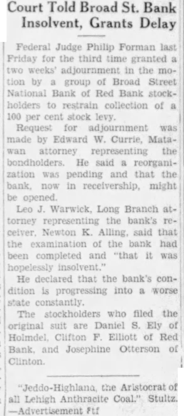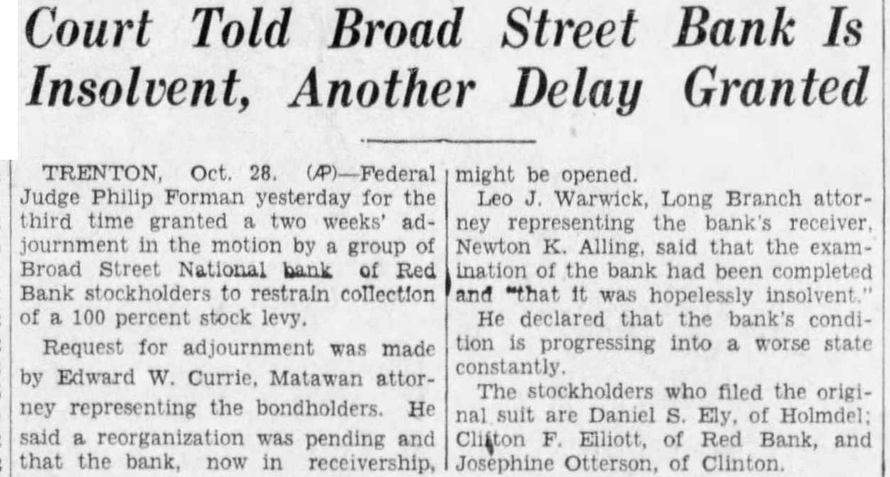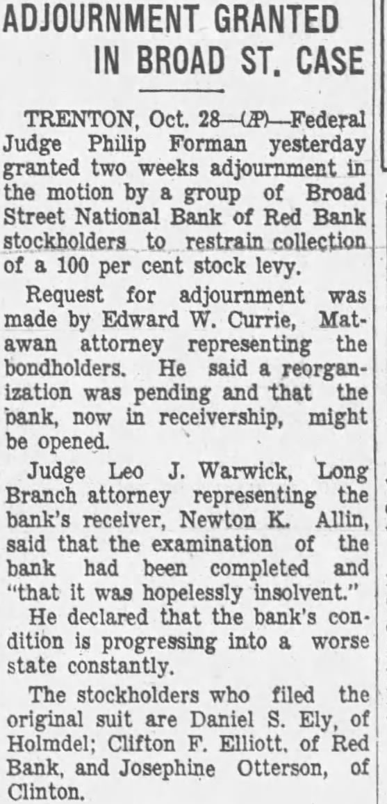 Oct. 28. Judge Philip Forman yesterday for the third granted two weeks' adjournment the motion by group Broad Street National bank of Red collection 100 percent stock levy. Request for adjournment was made by Edward W. Currie, Matawan attorney representing the bondholders. He said was pending that the bank, now in receivership, might be Leo Warwick, Long Branch attorney representing the receiver Newton K. Alling, said that the examination the bank had completed "that was insolvent He declared the bank's condiprogressing into worse state The who filed the origisuit are Daniel Ely, Holmdel: Clifton of Bank, and Josephine Otterson, of