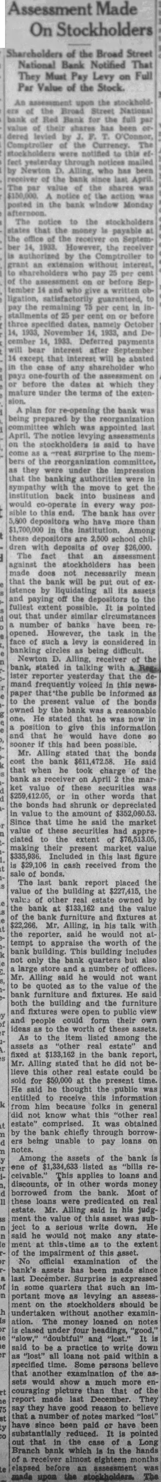 An upon the stockhold the Street National bank Red Bank full value has been dered Comptroller The through mailed Newton Alling, been the since last The shares $150,000. posted the bank window Monday The notice to the stockholders that money payable the the receiver Septemthe receiver by the Comptroller grant an interest, pay per the before tember and written ligation, the cent stallments of cent before three namely October 14, 1933, 1933, and De14, 1933. Deferred payments bear interest after September except that interest will be abated the case of any shareholder the before dates which they mature under the terms of the extenplan for re-opening the bank was being the which April. notice the stockholders said to have come the memthe reorganization they were under the impression that the were with move get the back and would co-operate every way posbank have than the institution. Among are 2,500 with deposits of over $26,000. The against stockholders been necessarily real for $50,000 the present he thought public receive information that another examination the would show much more Branch which in the hands