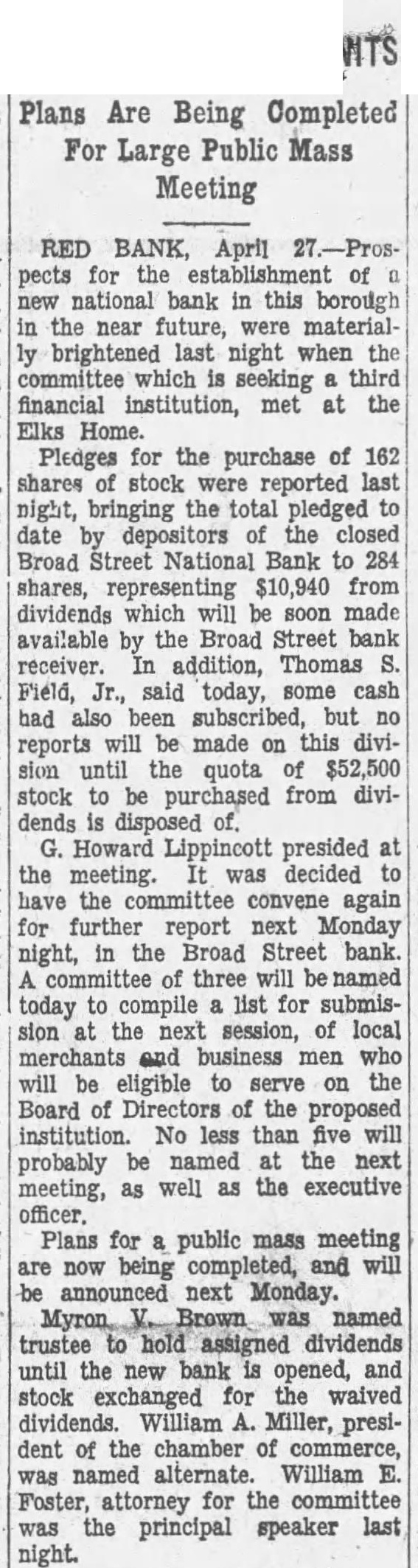 RED BANK, April pects for the establishment of national bank in this borough the near future, were materialbrightened night when the committee which seeking financial institution, met at the Elks Home. Pledges for the purchase of 162 shares reported last night, bringing the total pledged date by the closed Broad Street National Bank to shares, representing $10,940 from dividends which be soon made available Broad Street bank receiver. addition, Thomas Field, Jr., said today, some cash had also been subscribed, but reports will be made on division until the quota of $52,500 stock to purchased from dividends is disposed Howard Lippincott presided the meeting. decided have the committee convene again for further report next Monday night, the Broad Street bank. committee of three will named today to compile list for submission the next session, of local merchants and business men who will be eligible to serve on Board of of the proposed institution. No less than five will probably be named the next meeting, as well as the executive officer. Plans for public mass meeting now and will announced next Monday. Brown was named trustee to hold assigned dividends until new bank is opened, and stock exchanged for the waived dividends. William Miller, president of the chamber of commerce, named alternate. William Foster, attorney for the committee the principal speaker last night.