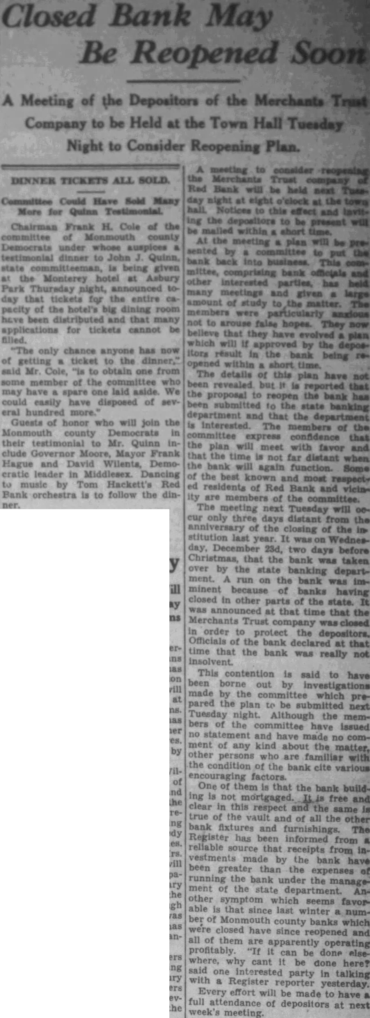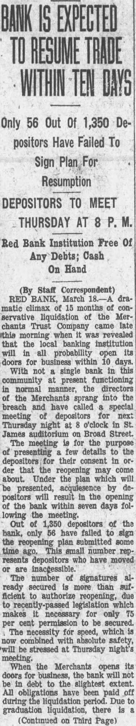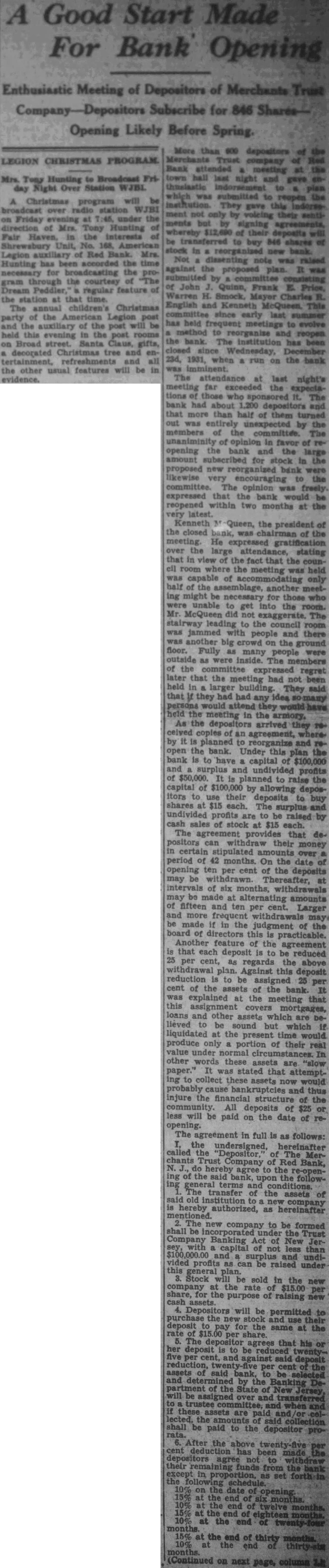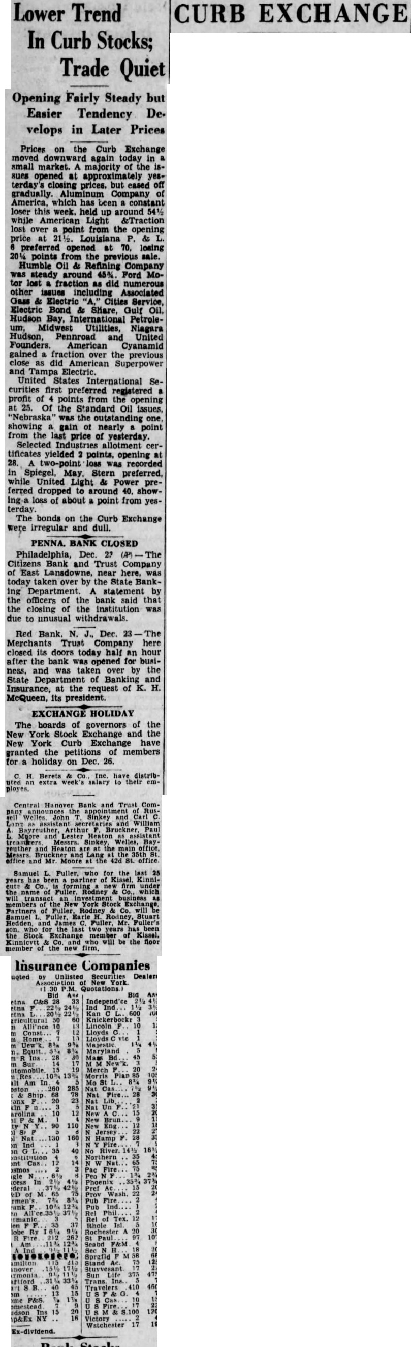 Lower Trend In Curb Stocks; Trade Quiet CURB EXCHANGE Opening Fairly Steady but Easier Tendency De. velops in Later Prices Prices on the Curb Exchange moved downward again today in small market. A majority of the issues opened at approximately yesterday's closing prices. but eased off gradually Aluminum Company of America, which has been constant loser this week. held up around 541/2 while American Light &Traction lost over point from the opening price at 21 Louisiana P. & L. preferred opened at 70. losing points from the previous sale. Humble Oil & Refining Company was steady around 45%. Ford Motor lost fraction as did numerous other issues including Associated Gass & Electric "A," Cities Service, Electric Bond & Share, Gulf Oil, Hudson Bay, International Petroleum, Midwest Utilities, Niagara Hudson, Pennroad and United Founders. American Cyanamid gained fraction over the previous close as did American Superpower and Tampa Electric. United States International Securities first preferred registered profit of points from the opening at Of the Standard Oil issues, "Nebraska" was the outstanding one showing gain of nearly a point from the last price of yesterday Selected Industries allotment certificates yielded points, opening at 28. two-point loss was recorded in Spiegel, May. Stern preferred, while United Light & Power preferred dropped to around 40, showIng loss of about a point from yesterday. The bonds on the Curb Exchange were irregular and dull. PENNA. BANK CLOSED Philadelphia, Dec. 23 (AP) The Citizens Bank and Trust Company of East Lansdowne, near here, was today taken over by the State Banking Department. A statement by the officers of the bank said that the closing the institution was due to unusual withdrawals. Red Bank. N. J., Dec. 23 The Merchants Trust Company here closed its doors today half an hour after the bank was opened for business, and was taken over by the State Department of Banking and Insurance, at the request of K. H. McQueen, its president. EXCHANGE HOLIDAY The boards of governors of the New York Stock Exchange and the New York Curb Exchange have granted the petitions of members for a holiday on Dec. 26. Berets Inc. distribextra em- Bank and Trust Sinkey Welles, reuther and Heaton the Samuel business Partners Stuart Hedden and last will the floor