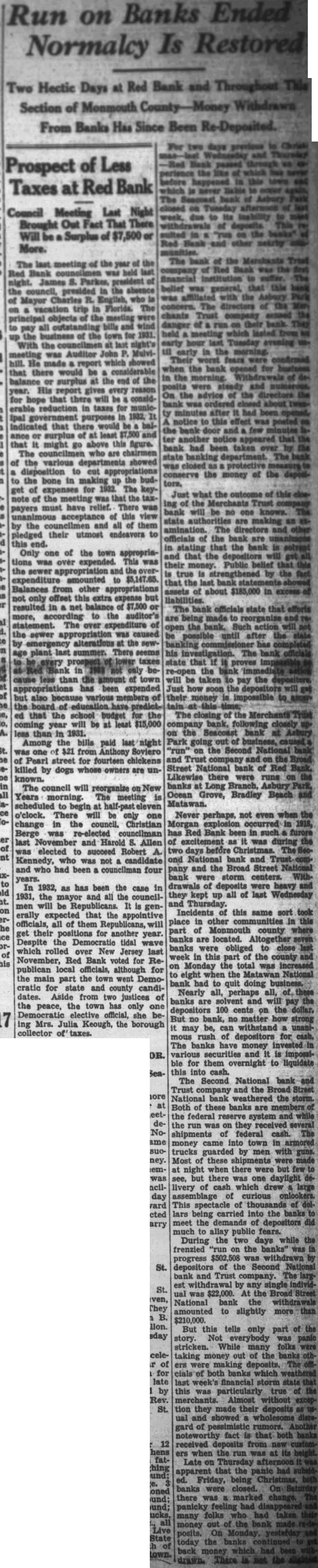Run on Banks Ended Normalcy Is Restored Red Bank and Throughout This Two Hectic Days at Section of From Banks Has Since Been of Less Prospect Taxes Red Bank at Council Meeting Last Out There Brought More. The Red was held the of Mayor Florida. and wind pay the town for the last was Auditor hill. He made showed that there be surplus the end His report for that there will considin taxes for municthat least that might go figure. councilmen who are the various showed cut the bone the get of for The note of the was the have relief. There payers this the and them their utmost to this Only one of the town appropriawas This the amounted to $5,147.65. Balances from other not offset this extra expense but in net the auditor's more, The the sewer was caused alterations the sewplant summer. There seems taxes only cause less amount has been expended but also ed that the school budget for be at $15,000 than 1931. Among the bills paid $21 Soviero one Pearl street for fourteen killed by dogs whose owners are unThe council will reorganize Years The meeting begin o'clock. There will be only one change in the council. Christian Berge last and Allen elected to Robert was not and who had been four In 1932, as has been the case in 1931, the and all the councilwill be erally that the appointive officials, all of their for another year the which rolled over New Jersey last Red Bank voted for publican officials, although for the main part the town went Demofor state county candidates. two justices of the peace, the has only she ing Mrs. Julia Keough, the borough collector The The financial belief general, the directors chants danger held early hour the minutes notice this another bank been taken state banking was closed protective conserve the money of the what the the Merchants no one state are The directors officials the bank in stating the bank that depositors their Public true that assets of about The officials state are made the his the will be to pay the Just how impossible The the bank, the bank Park the and Trust the Street bank of Likewise there were runs banks Branch, Ocean Grove, Bradley Beach Matawan. Never perhaps, not even when has Bank been in such was days ond bank and and the Broad Street storm centers. drawals of deposits were heavy they kept up all of last Wednesday Thursday. Incidents this same sort other in part of Monmouth county banks are located. Altogether banks were obliged to close week this the county on Monday total was increased eight the Matawan National had to quit doing Nearly perhaps banks will 100 cents on the no bank, no matter strong be, withstand rush depositors The banks have money various securities is impossible for them overnight to liquidate this into The Second National bank Trust company and the Broad National bank weathered the storm. Both these banks members the federal reserve system and the they received shipments federal cash. money town in armored trucks guarded men with Most these when there were but there one daylight delivery of which curious This of carried into the banks meet the demands did fears. During two days the frenzied the progress the Second National Trust by any was $22,000. Street National bank the amounted to slightly more $210,000. But this tells only part stricken. many taking out ers deposits. both banks which financial by particularly true tion they made their deposits ual showed fact that received when the Late Thursday apparent the panic had Friday, being there out today drawn.