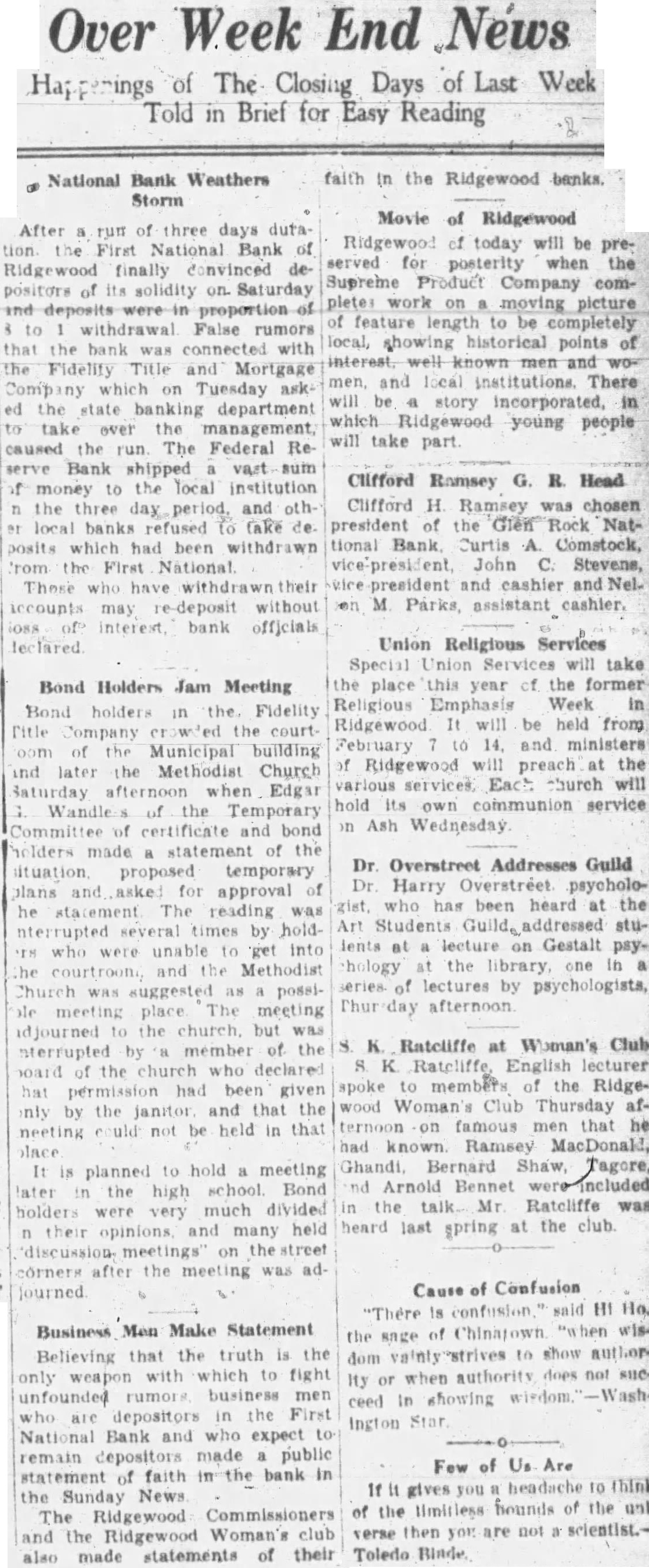 Over Week End News penings of The Closing Days of Last Week Told in Brief for Easy Reading National Bank Weathers Storm After run of three days duta tion. the First National Bank of Ridgewood finally donvinced depositors of its solidity on Saturday and in to withdrawal False rumors that the bank connected with the Fidelity Title and Mortgage Company which on Tuesday asked the state banking department take over the caused the run. The Federal Reserve Bank shipped vast sum money to the local institution the three day period, and othlocal banks refused to take de posits which had been withdrawn 'rom the First National Those who have withdrawn their accounts may re-deposit without Bond Holders Jam Meeting Bond holders in the Fidelity Title Company the court of the Municipal building and later the Methodist Church Saturday afternoon when Edgar Wandle of the Temporary Committee of certificate and bond holders made a statement of the ituation proposed temporary plans and aske for approval of he tatement The reading was interrupted several times by hold who were unable to get into he courtroom and the Methodist Church WAS suggested as posside meeting place The meeting to the church but was interrupted by member of the of the church who declared hat permission had been given by the and that the neeting not be held in place It planned to hold meeting later the high school Bond holders were very much divided and many held corners after the was ad- Business Men Make Statement Believing that the truth is the only weapon with which to fight unfounded rumors business men depositors in the First are National Bank and expect to remain depositors made public statement of faith in the bank in the Sunday News The Ridgewood Commissioners and the Ridgewood Woman's club also made statements of their faith in the Ridgewood banks Movie of Ridgewood Ridgewood of today will be preserved for posterity when the Supreme Product Company comwork on moving picture of feature length to be completely local, showing historical points of interest well men and men, and local institutions. There will be story incorporated, in which Ridgewood young people will take part Clifford Ramsey G. R. Head Clifford H. Ramsey was chosen president of the Glen Rock Nattional Bank Curtis A. Comstock, vice John C: Stevene, vice president and cashier and Nel. on M. Parks, assistant cashier. Union Religious Services Special Union Services will take the place this year the former Religious Emphasis Week in Ridgewood It will be held from February to 14. and ministers of Ridgewood will preach at the hold its own communion service on Ash Wednesday Dr Overstreet Addresses Guild Dr Harry Overstreet psychologist who has been heard at the Art Students Guild, addressed stulents at a lecture on Gestalt paychology at the library one in a series. of lectures by psychologists, Thur afternoon K. Ratcliffe at Woman's Club spoke to members the Ridgewood Woman's Club Thursday afternoon on famous men that he had known Ramsey MacDonald, Ghandi, Bernard Shaw, Tagore, nd Arnold Bennet were-included in the talk. Mr Ratcliffe was heard last spring at the club. Cause of Confusion "There is confusion said HI Ho. the of Chinajown sage authority does not Ity or when ceed in showing Few of Us Are If It gives you headache to think of the limitless hounds of the unlverse then you are not a Toledo Binde