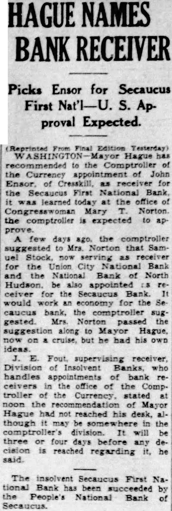 HAGUE NAMES BANK RECEIVER Picks Ensor for Secaucus First Nat'I-U. S. Approval Expected. Reprinted From Final Edition Testerday) ASHINGTON- Mayor Hague has recommended to the Comptroller of the Currency appointment of John Ensor. of Cresskill, as receiver for the Secaucus First National Bank, it learned today at the office of Congresswoman Mary T. Norton the comptroller 18 expected to ap A few days ago, the comptroller suggested to Mrs. Norton that Samuel Stock, now serving as receiver for the Union City National Bank the National Bank of North ceiver for the Secaucus Bank. It would work an economy for the Se caucus bank, the comptroller sug. gested. Mrs Norton passed the suggestion along to Mayor Hague, now on a cruise, but he had his OWD J. E. Fout supervising receiver Division of Insolvent Banks, who handles of bank receivers in the office of the Comptroller of the Currency, stated at noon the recommendation of Mayor Hague had not reached his desk, although it may be in the comptroller division. It will be three or four days before any decision is reached regarding it, he said. The insolvent Secaucus First Na. tional Bank has been succeeded by the People's National Bank of Secaucus.