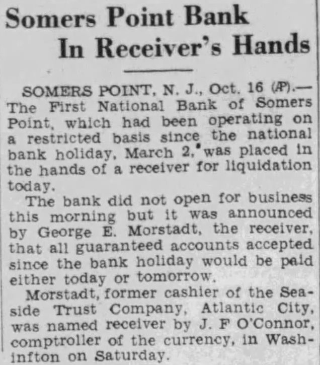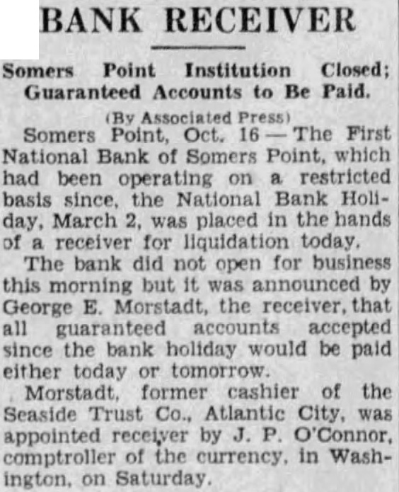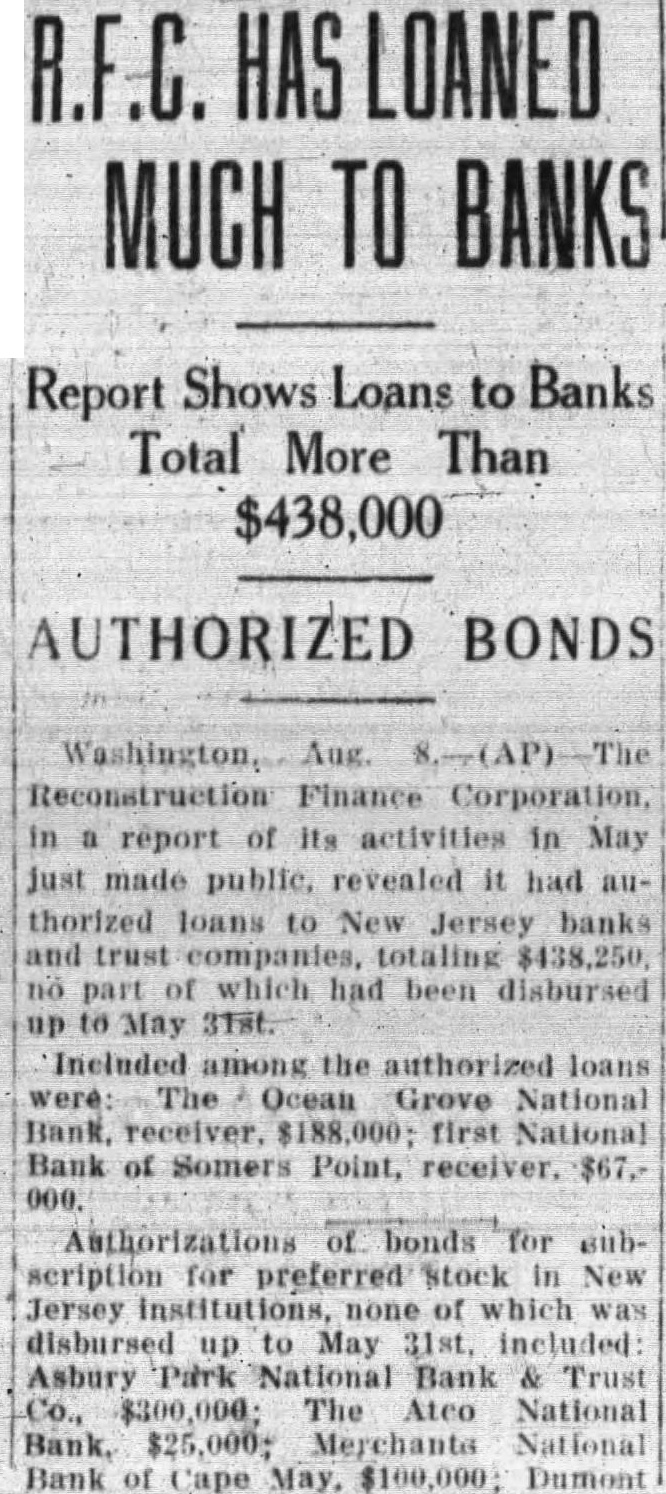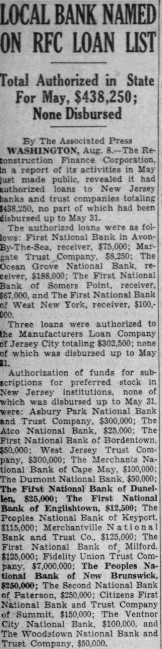 Associated Press Aug. construction Finance Corporation, report its activities in made public, revealed had authorized loans New Jersey banks trust totaling no which had been part disbursed 31. The authorized loans were First National Bank Avonreceiver, MarTrust Company, $8,250; The Ocean Grove National Bank, ceiver, $188,000; The First National Bank Somers Point, receiver, First National Bank West New York, receiver, $100,Three loans authorized the Manufacturers Loan Company Jersey totaling which was disbursed May