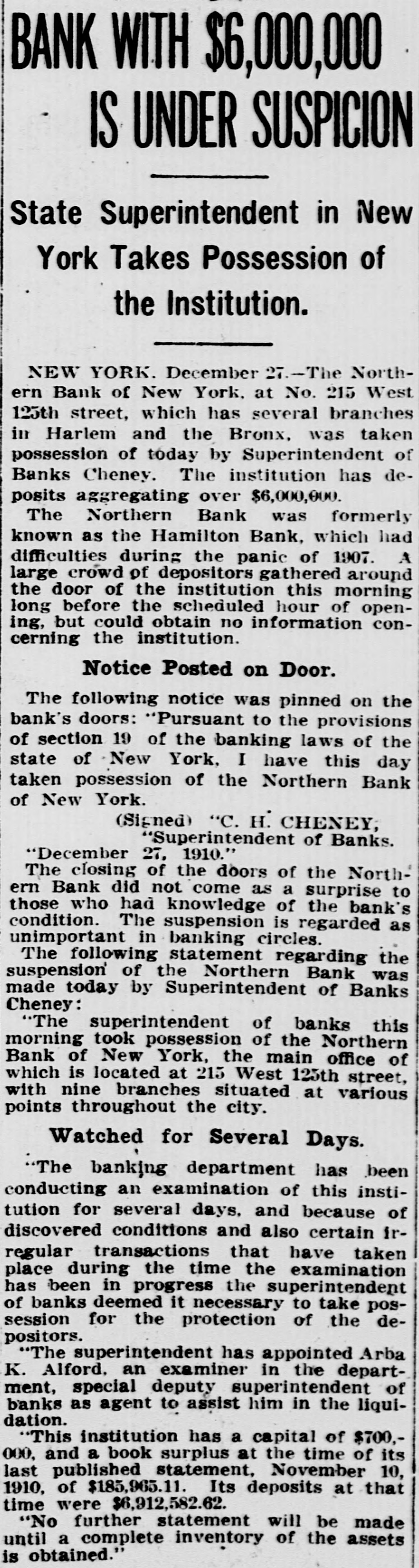 EARING HOUSE CERTIFICATES TO STRENGTHEN BANKS Association Decides to Adopt Strong Measures and Relief Is Certain. NEW YORK, Oct. 26. With the unan imous decision of the New York Clearing House Association today to issue clearing house certificates for the settlement of debit balances by the banks, leading financiers believe that the final steps have been taken to restore conditions in financial circles to their wonted calm. The issue of these certificates will release for general circulation a large sum of currency, and the scarcity of money new the only cloud that lingers on the horizon. s Of scarcely less importance as tending to restore confidence was the introduction of a resolution in the meeting of the Clearing House Association providing for the readmission of trust companies to membership in this assoclation. This will place the trust companies under the rules of the clearing house, and tend to prevent recurrence of the situation which brought about the slump last week. News of Gold Imports Aid. Announcement of the early arrival of gold imports from Europe further improved the situation today. There is a balance of $60,000,000 in our favor in the trading between Europe and the United States, and an influx of the yellow metal from Europe at this time will serve to hasten the return to normal conditions in the financial world. Heidelbach, Ikelheimer & Co., of 37 William street, today announced that the first of the gold imports, $1,500,000 in amount, will arrive here Wednesday. With all these agencies operating to restore confidence, the reaction set in Friday continued unabated today, and the sun began to shine on Wall Street again. Except for the suspension of the Terminal Bank, in Brooklyn, a small Jenkins institution, whose closing had no effect on the situation, every report that went out over the ticker was fa. vorable. Stock Market Firm. The stock market continued firm and money was comparatively easier. The Trust Company of America, the Lincoln Trust, and the other institutions which were imperiled by runs rode the storm and their officials announced at the close of the day that their concerns would resume business Monday in capital shape to meet any demands that might be made upon them. It is understood that for the reason that Europe might get the idea that conditions are worse in New York than they reall are. J. P. Morgan and bankers in friendly association with them, opposed the issue of clearing house cer tificates, but gave way to the majority after the matter had been thoroughly threshed out. A committee headed by Vice President Cannon, of the Fourth National Bank was appointed to arrange the details for the issue. Banks will be permitted to avail themselves of the certificates to the amount of 75 per cent of their debit balances Financial men almost without exception declared after the adjournment of the meeting that this measure will undoubtedly bring to the situation the relief that is needed to restore confidence and stability to the market The final act of the meeting of the clearing house association was the adoption of a resolution thanking Secretary of the Treasury Cortelyou and J. Pierpent Morgan for their services during the time of the crisis. Surplus Was Wiped Out. The regular weekly bank statement issued today showed that the surplus which the banks had at the close of last week was entirely wiped out by the flurry, and that a deficit of $1,233,300 was created instead. A surprising feature of the statement was an increase of loans of $10,864,700. It had been expected that the enormous liquidation in the market during the week would have resulted in a considerable decrease in this item. While the skles were clearing in Wali Street, frightened depositors in- the Mechanics and Traders' Bank, 565 Broadway, with twelve branches in Manhattan and Brooklyn, and in the Broadway Trust Company, Broadway and Eighth street, made a descent upon the two institutions, and there were lively withdrawals for some time. All demands were met by the two concerns however. In a run on the Northern Bank of New York, Broadway and Fourth street, there was so much disorder that the police had to be called. The Broadway Trust Company adopted a rule that those who were withdrawing funds to pay off employes should lave the first call today. General approval was given to the action of the presidents of the savings banks, all of which today put into effect the rule which compels the filing of sixty days' notice of an intention to withdraw funds.