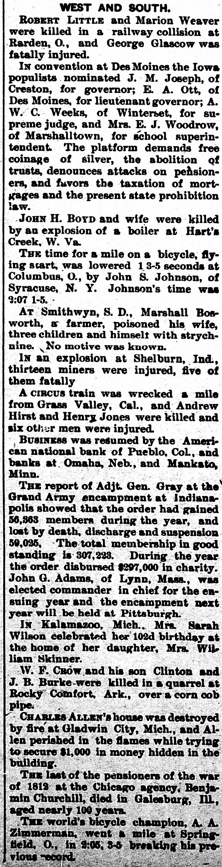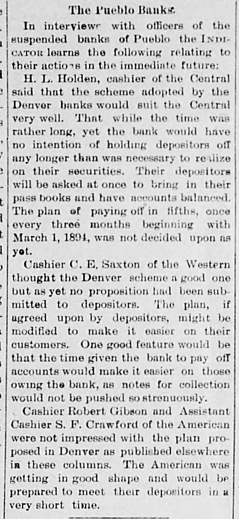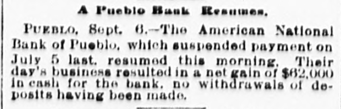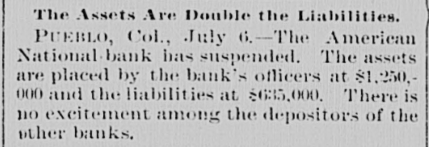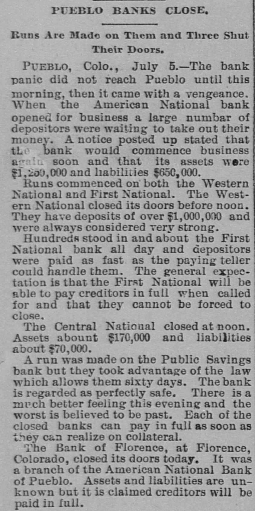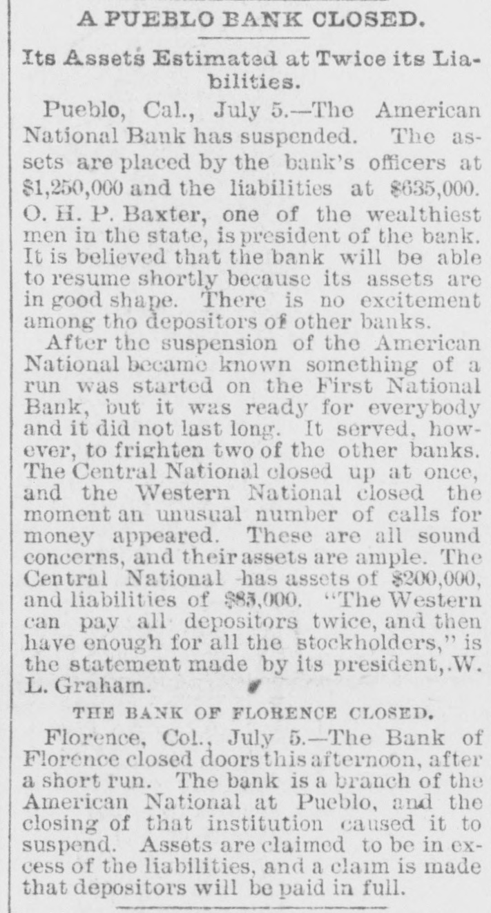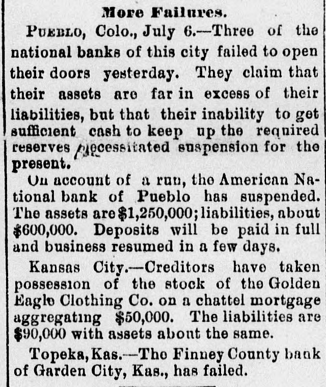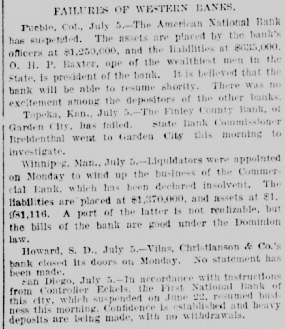 FAILURES OF WESTERN BANKS. Pueble, Col., July 5.-The American National Bank has suspended. The assets are placed by the bank's officers at $1,250,000. and the liabilities at $635,000. O. H. P. Baxter, ope of the wealthiest men in the State, is president of the bank. It is believed that the bank will be able to resume shortly. There was no excitement among the depositors of the other banks. Topeka, Kan., July 5.-The Finley County Bank, of Garden City, has failed. State Bank Commissioner Breidenthal went to Garden City this morning to investigate. Winnipeg Man., July 5.-Liquidators were appointed on Monday to wind up the business of the Commerclal Bank. which has been declared insolvent. The liabilities are placed at $1,370,000, and assets at $1. 981,116. A part of the latter is not realizable, but the bills of the bank are good under the Dominion law. Howard, S. D., July 5.-Vilas, Christianson & Co.'s bank closed Its doors on Monday. No statement has been made. San Diego, July 5.-Im accordance with instructions from Controller Eckels. the First National Bank of this city, which suspended on June 22. resumed bust ness this morning. Confidence is established and heavy deposits are being made, with no withdrawals.