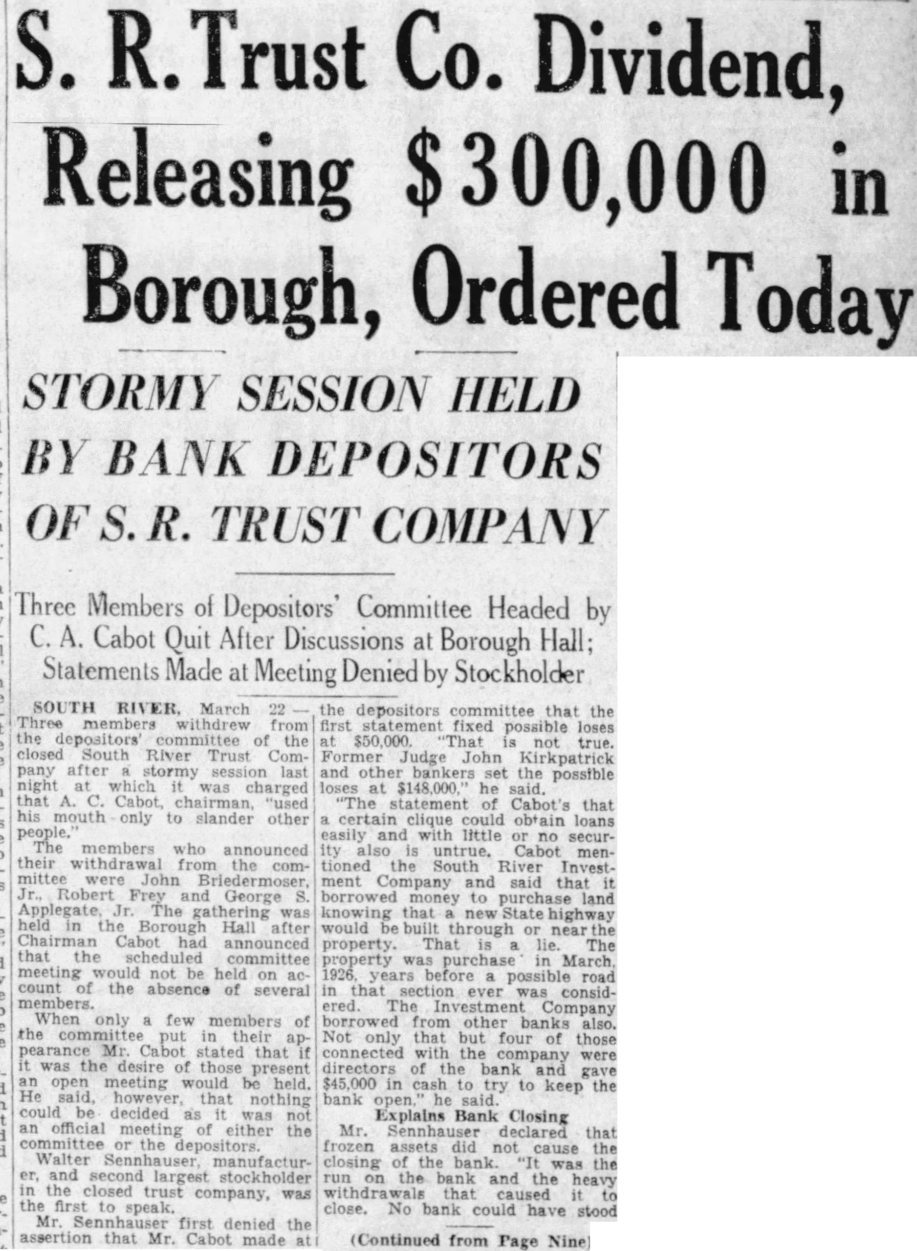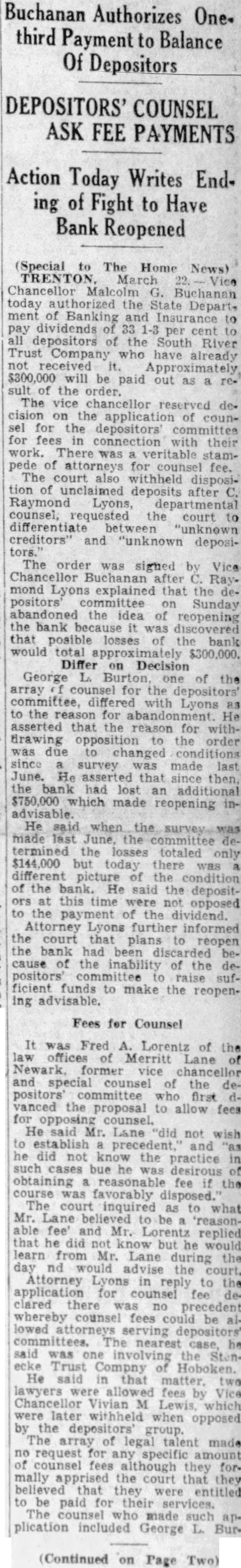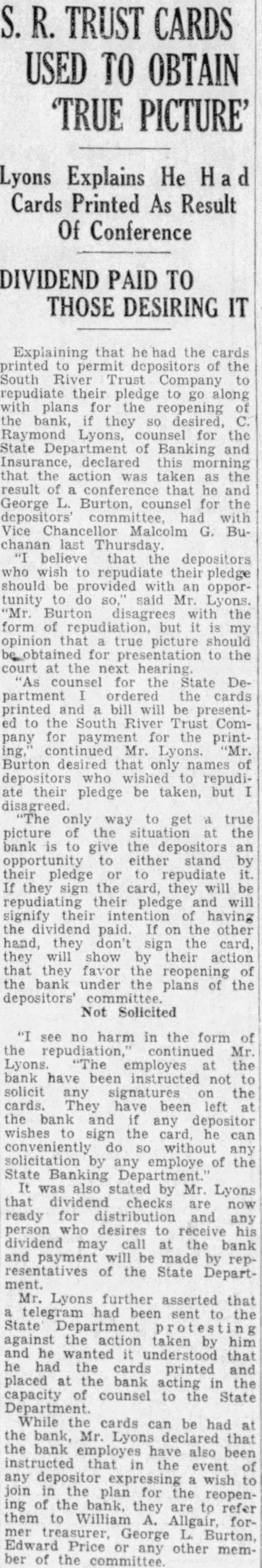 Explaining that had the cards to permit depositors of the South River Trust Company repudiate their pledge to go along plans reopening bank, they Lyons, for the State and declared this the action result that George Burton, counsel for Malcolm Bubelieve that depositors who to pledge should be provided with opportunity said Mr. Lyons. Burton disagrees with the form repudiation, but my opinion picture should the hearing for State Department ordered the printed bill will be present the South River Company for payment for the printcontinued Lyons. Burton desired that only names of ate their pledge be taken, but only way picture the situation bank give the depositors opportunity either stand pledge to repudiate the they will their pledge and will signify having the dividend paid. the other hand, they sign card will show by their action that they favor the reopening bank under plans of the depositors' Not Solicited see no harm in the form the Lyons. employes bank have instructed not solicit signatures the cards. They have the bank any wishes sign the he can conveniently without any solicitation by any employe of the State Banking was also stated by Mr. Lyons checks are ready for distribution any person desires dividend may at the and payment made representatives of the State DepartMr. Lyons further asserted that telegram had sent Department against the action taken by and that cards printed and placed bank the capacity counsel to the State Department. While the cards can be had bank, Mr. Lyons declared that bank also instructed that the event any depositor the for the reopenof the bank, they to them to William Allgair, forGeorge Burton, Price other member of the committee.