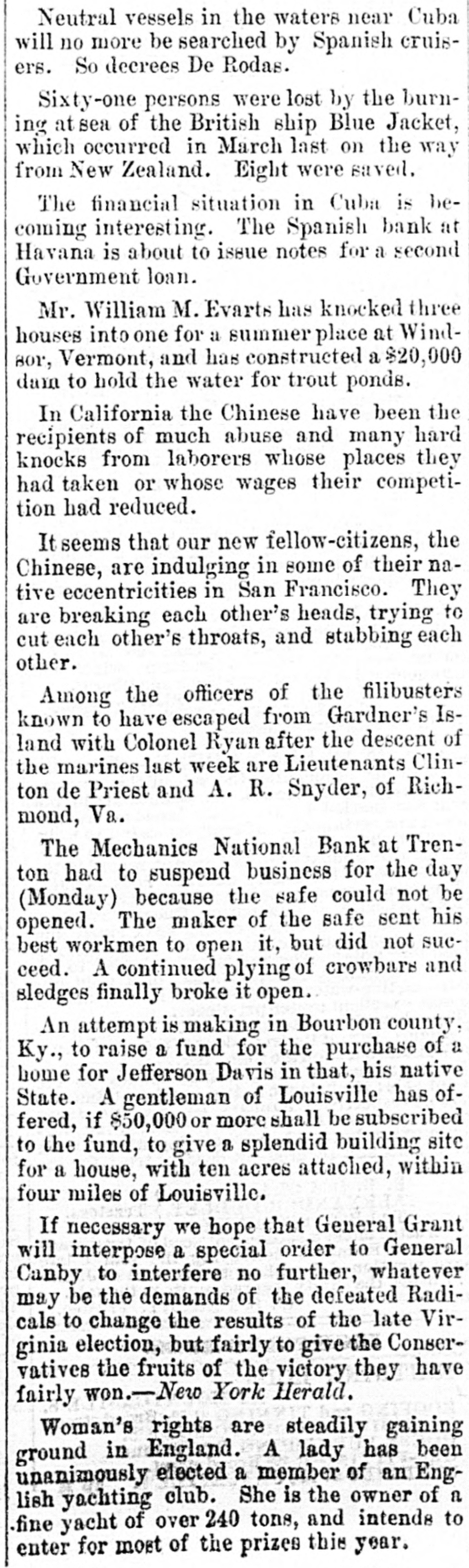 THE NEWS. Europe. The cable news is dated July 19. Political news in England is dull. The first general meeting or the Women's Franchise Society was held yesterday. The French regard the present Cabinet only as a temporary one. South America. We have dates to June 23 from Rio Janetro. A correspondence of some interest has been going on between Lopez and the Comte D'Eu, in which the former demands that the allies prohibit the use of the Paraguayan flag by the native battalions in the allied army. D'Eu had advanced with his army to Pirayú, about seven miles from Lopez's headquarters. Miscellaneous. President Grant, with his family and suite, arrived at Long Branch yesterday morning, and took rooms at the Stetson House. Colonel Whittlesey and a number of Virginia radicals are in Washington getting up documents to prove that the election in Virginia was carried by fraud. Amdavits are being prepared and will be placed before the Reconstruction Committee at the meeting of Congress. It is hoped by this to have the election set aside or else have an investigation held, and thus delay the admission of the State. The republicans in New Hanover county, N. C., (the Wilmington district) are divided on a choice for a legislator to succeed Colonel Estes. The white carpet-baggers have nominated a negro for the position, and the negro radicals, who have bolted from the carpet-baggers, have nominated a white man. Mayor Bowen, of Washington, has recommended to his city Council that the public schools of that city be open to children of both races alike. He also nominates Professor Vashon (colored) to be a member of the present white Board of School Trustees. Two Frenchmen employed in the silk mills at Pat. erson, N. J., fought a duel near the depot in that city at about half-past niné o'clock on Saturday evening. about some trivial matter that occurred in the mille. Their seconds failed to appear on time, and the two went to work without them. The weapons were pistols and the distance ten paces. At the first fire one was slightly wounded in the lip. Another fire was demanded, and both were severely wounded in the right arm. They then declared themselves satisfied, shook hands and swore to say nothing about the duel. They had to tell the surgeon, however, and the affair thus leaked out. The conservative negroes in Washington are raising a subscription to deiray the expenses of indicting certain radical negroes for mobbing them and inciting to riot at the recent election in that city. Ben Wade is in Washington. He highly lauds Sec. retary Boutwell's policy, is sore over the result 01 the Virginia election, thinks we ought to enter a wedge for the separation of Cuba from Spanish rule, and says he will probably stump Ohio for Governor Hayes. The Canadian government has decided to release Father McMahon, the Feman prisoner in Kingston Penitentary. He was tried sometime in the rall of 1866 for complicity in the Fentan raid at Niagara Falls and sentenced to twenty years in the Peniten. tiary. Several efforts were made by Secretary Sew. ard to have him released, but without avail. The present action of the Canadian government is taken without any reference of the matter to the English authorities. The Mechanics National Bank at Trenton had to suspend business for the day yesterday because the safe could not be opened. The maker of tbe safe sent his best workman to open it, but he did not suc ceed. A continued plying of crowbars and sledges finally broke it open. A fatal case of genuine Astatic cholera, not infectious, is reported in Newark. Miss Ella Rice, one of the young ladies named in connection with the Far Rockaway difficulty, denies all the allegations in reference to her being insulted on the beach or complaining to Corser. The new ten and fitteen cent currency has made its appearance. The twenty.five and fifty cent bills will be out shortly. The guage of the Missouri Pacific Railway was recently changed in twelve hours without the delay of a single train. Additional particulars of General Carr's victory over the Indians are received. Among the killed is a noted Indian chief. Mrs. Weizel is the name of al white woman who was rescued. Three Sioux Indians were killed by the Pawnee scouts on Republican river. General Eastman was wounded by Indians near Fort Benton on the 16th, and when the citizens of the fort heard it they killed three Indians who happened to be in the town at the time. A Pennsylvanian signing himself "Honesty, sends $400 to the Treasury Department, as a part his income tax, which he wishes to pay that way in preference to having the full amount of his income published in his coonty paper. A railroad bridge over the Marats des Cygnes, in Kansas, feti in ON Sunday, and four mea were killed. The valuation of taxable property in Necraska is $42,000,000, SIX times greater than *111 1862. or Mill