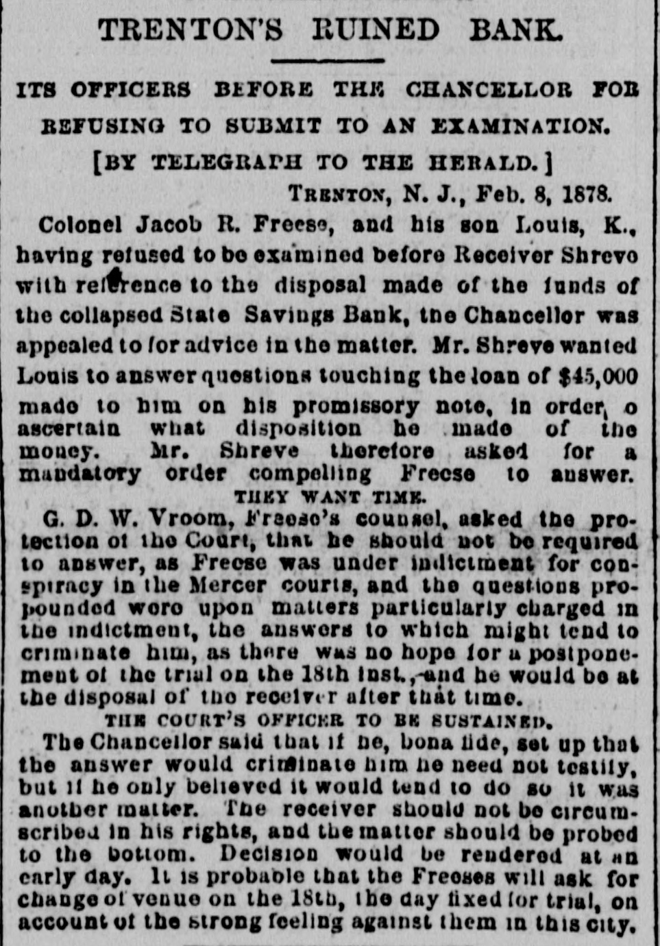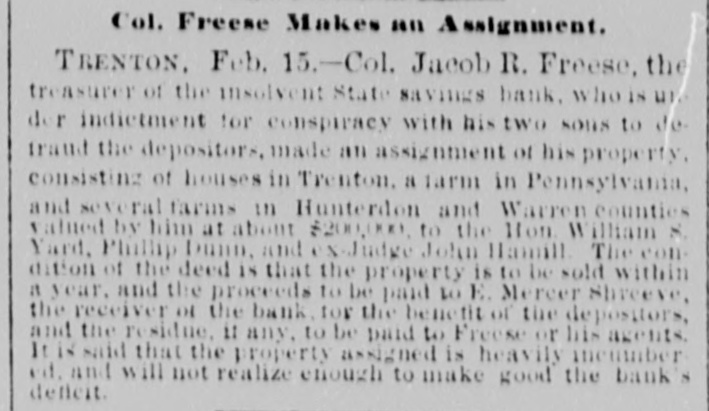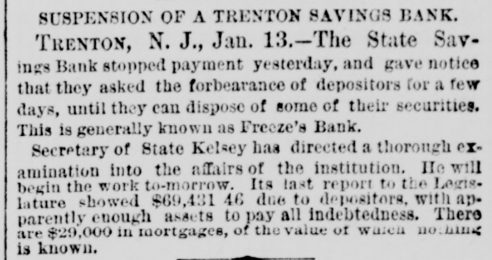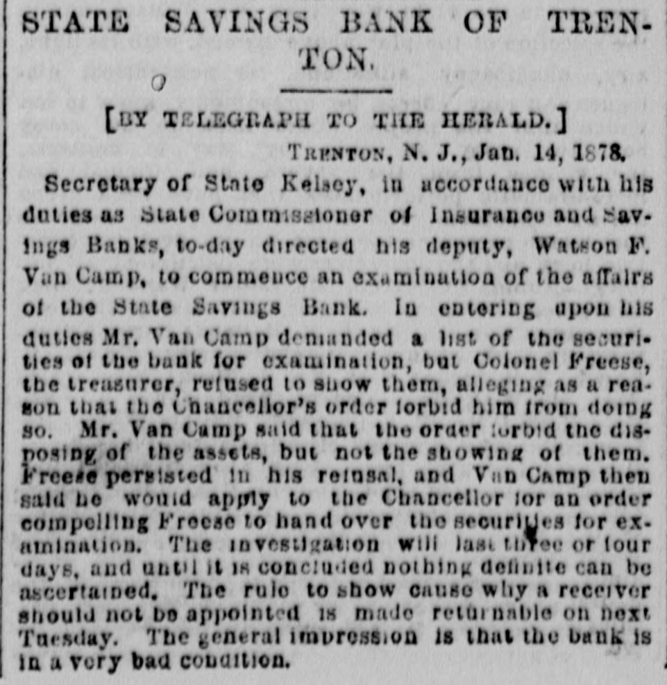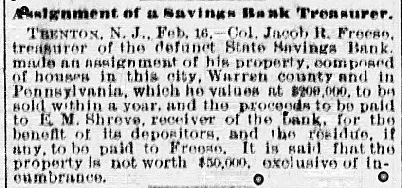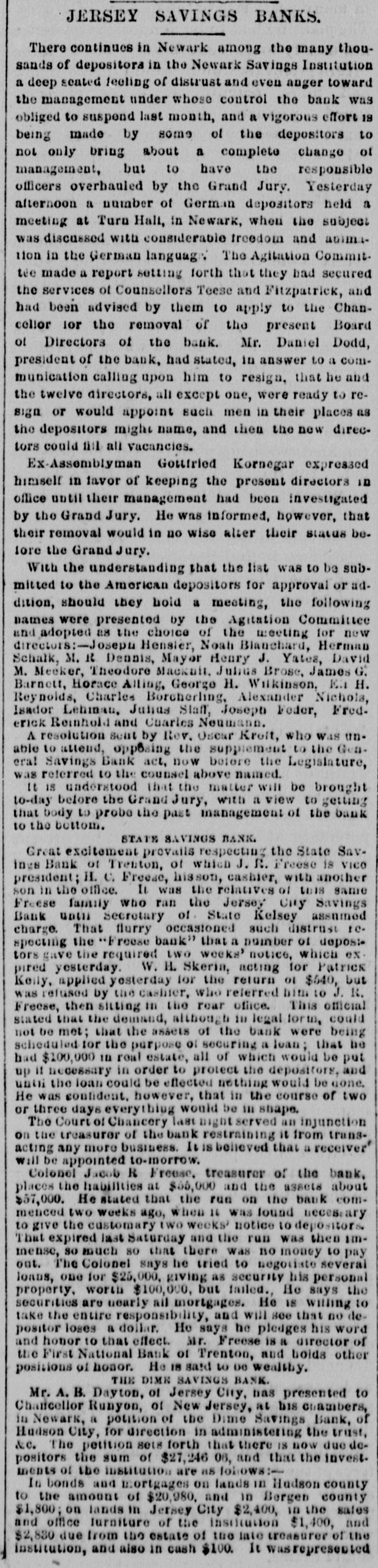 JERSEY SAVINGS BANKS. There continues in Newark among the many thousands of depositora in the Newark Savings Institution a deep seated feeling of distrust and even anger toward the management under whose control the bank was obliged to suspend last month, and a vigorous effort 19 being made by some of the depositors to not only bring about a complete change of management, but to have the responsible officers overbauled by the Grand Jury. Yesterday afternoon a number of German depositors held a meeting at Turn Hall, in Newark, when the subject was discussed with considerable freedom and anima110n in the German language The Agitation Committée made a report setting forth that they bad secured the services of Counsellors Teese and Fitzpatrick, and had been advised by them to apply to the Chancellor lor the removal of the present Board of Directors of the bank. Mr. Daniel Dodd, president of the bank, had stated, in answer to a communication calling upon him to resign, that he and the twelve directors, all except one, were ready to resign or would appoint such men in their places as the depositors might name, and then the new direc. tors could fill all vacancies. Ex-Assemblyman Gottfried Kornegar expressed himself in favor of keeping the present directors ID office until their management had been investigated by the Grand Jury. He was informed, however, that their removal would in no wise alter their status be. lore the Grand Jury. With the understanding that the list was to be submitted to the American depositors for approval or addition, should they hold a meeting, the following names were presented by the Agitation Committee and adopted as the choice of the meeting for new directors:-Jose Hensier, Noah Blanchard, Herman Schalk, M. R Dennis, Mayor Henry J. Yates, David M. Meeker, Theodore Macknit, Julius Brose, James G. Barnett, Horace Alling, George H. Wilkinson. EN H. Reynolds, Charles Borcherling, Alexander Nichola, Isador Lehinau, Julius Staff, Joseph Feder, Fred. erick Reinhold and Cuarles Neumann. A resolution Scat by Rev. Oscar Kroit, who was un. able to attend, opposing the supplement to the Geaera! Savings Bank act, now before the Legislature, was referred to the counsel above named. It IS understood that the matter will be brought to-day before the Grand Jury, with a view to getting that body to probe the past management of the bank to the bottom. STATE SAVINGS BANK. Great excitement prevails respecting the State Savings Bank of Trenton, of which J. R. Freese is VICO president; H. C. Freeae, hisson, cashier, with another son in the office. It was the relatives of this same Freese family who ran the Jersey City Savings Bank until Secretary of State Kelsey assumed charge. That flurry occasioned such distrust tespecting the "Freese bank" that a number of depositors gave the required two weeks' notice, which ex pired yesterday. W. H. Skeria, acting for Patrick Kelly, applied yesterday for the return of $540, but was refused by the cashier, who referred hith to J. R. Freese, then sitting in the rear office. This official stated that the demand, although in legal form, could not be met; that the assets of the bank were being scheduled for the purpose of securing a loan; that be had $100,000 in roal estate, all of which would be put up it necessary in order to protect the depositors, and until the loan could be effected nothing would be done. He was confident. however, that in the course of two or three days everything would be in shape. The Court of Chancery last night served an injunction on the treasurer of the bank restraining it from transacting any more business. It IS believed that a receiver' will be appointed to-morrow. Colonel Jacob R Freese, treasurer of the bank, places the habilities at $65,000 and the assets about $57,000. He stated that the run on the bank commenced two weeks ago, when 16 was found necessary to give the customary two weeks' notice to depositors. That expired last Saturday and the run was then 1m. mense, so much so that there was no money to pay out. The Colonel says he tried to negotiate several loans, one for $25,000, giving as security his personal property, worth $100,000, but failed., He says the securities are nearly all mortgages. He 18 willing to take the entire responsibility, and will see that no depositor loses a dollar. He says he pledges his word and honor to that effect. Mr. Freese is director of the First National Bank of Trenton, and holds other positions of honor. He 18 said to DO wealthy. THE DIME SAVINGS BANK. Mr. A. B. Dayton, of Jersey City, has presented to Chancellor Runyon, of New Jersey, at his chambers, in Newark, a potition of the Dime Savings Bank, of Hudson City, for direction in administering the trust, &c. The petition 8018 forth that there 18 now due de positors the sum of $27,246 06, and that the invest. ments of the institution are as follows:In bonds and mortgages on lands in Hudson county to the amount of $20,980. and in Bergen county $1,800;on lands in Jersey City $2,400, in the sales and office furniture of the institution 1,400, and $2,830 due from the estate of the late treasurer of the institution, and also in cash $100. It was represented