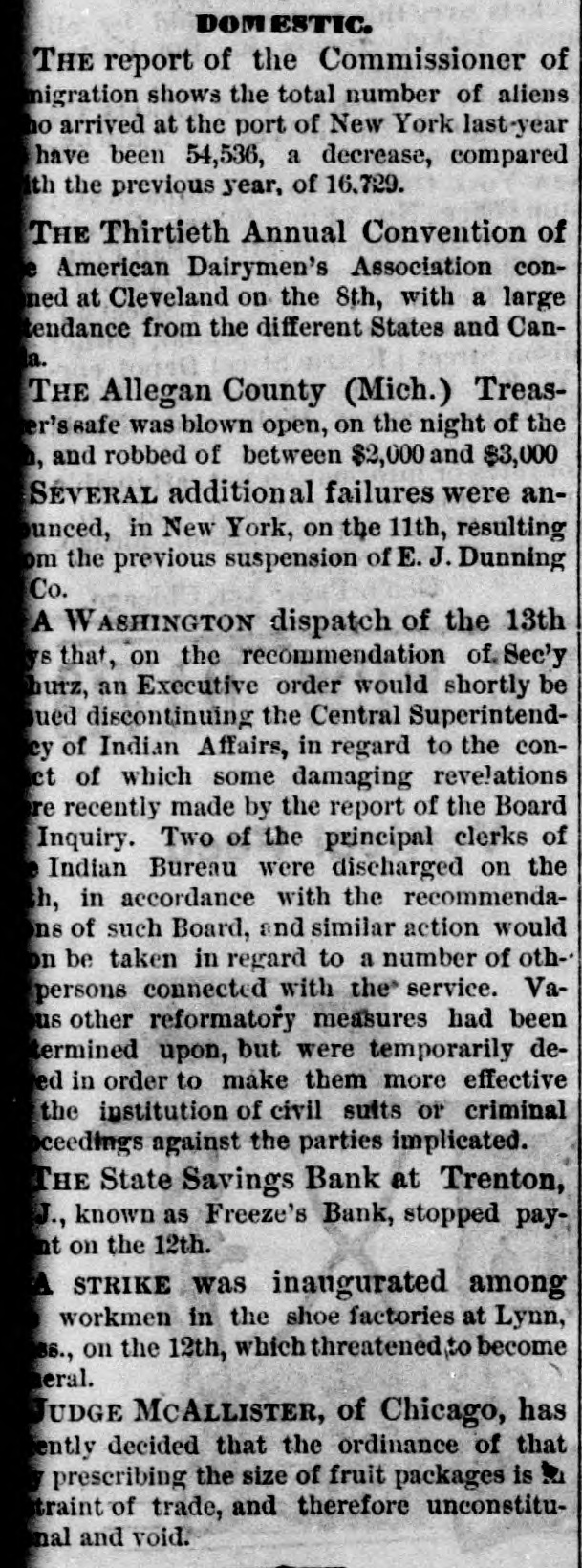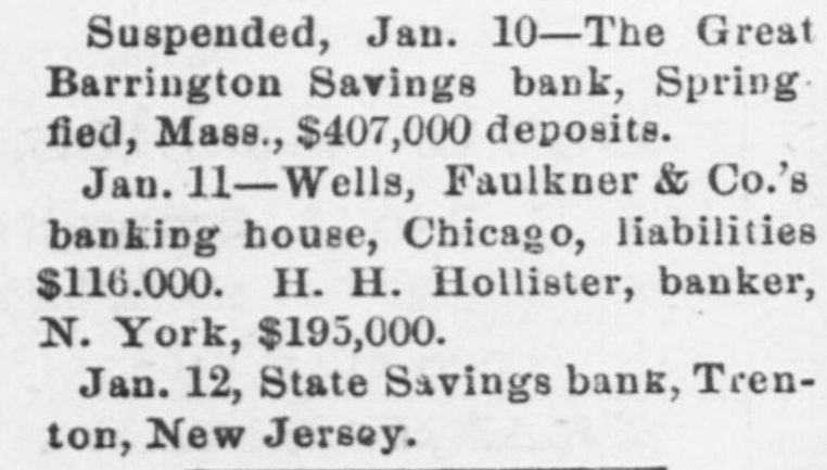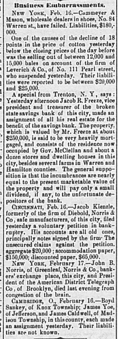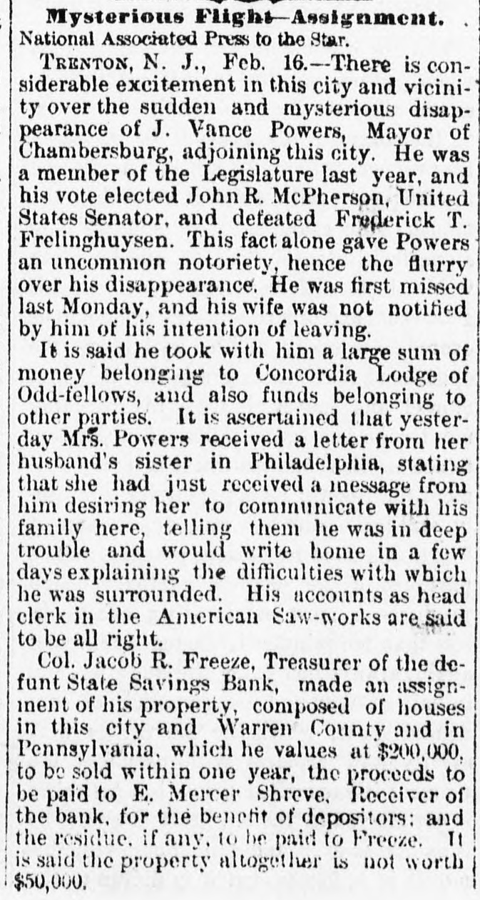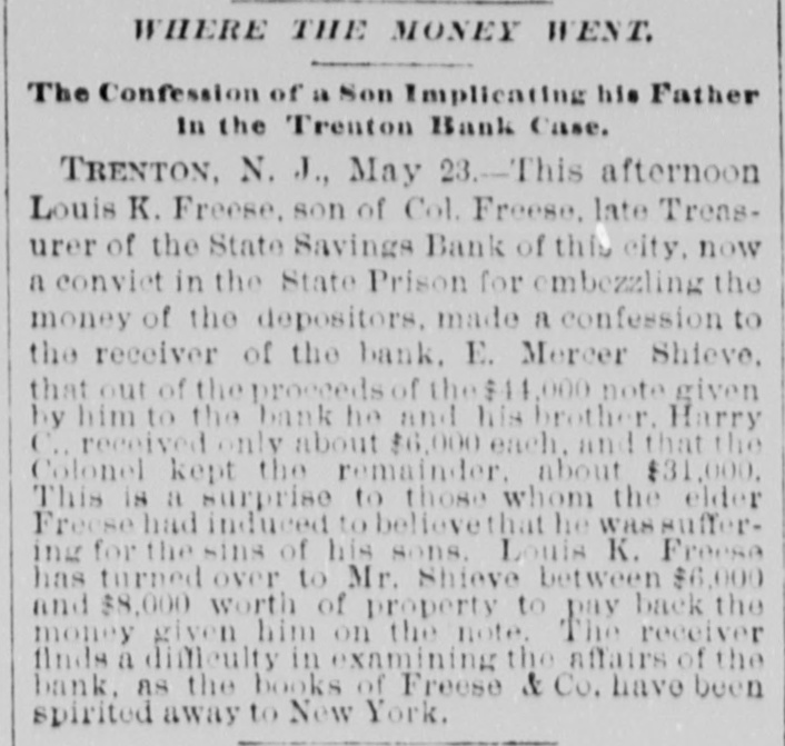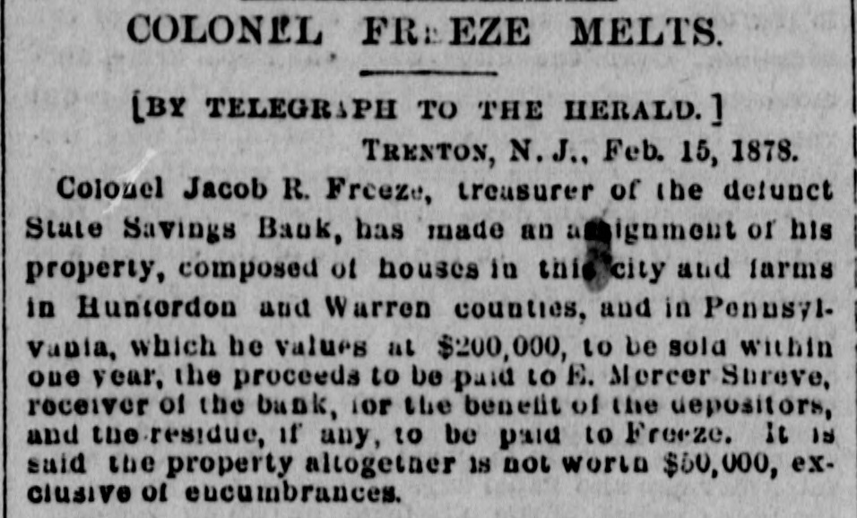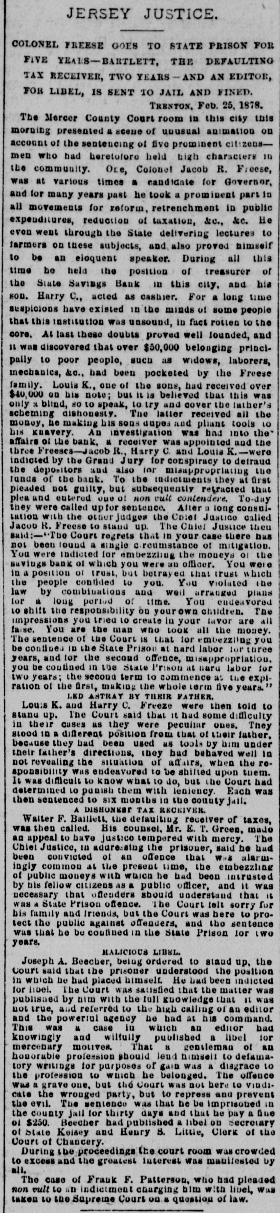 JERSEY SAVINGS BANKS. There continues in Newark among the many thousands of depositora in the Newark Savings Institution a deep seated feeling of distrust and even anger toward the management under whose control the bank was obliged to suspend last month, and a vigorous effort 19 being made by some of the depositors to not only bring about a complete change of management, but to have the responsible officers overbauled by the Grand Jury. Yesterday afternoon a number of German depositors held a meeting at Turn Hall, in Newark, when the subject was discussed with considerable freedom and anima110n in the German language The Agitation Committée made a report setting forth that they bad secured the services of Counsellors Teese and Fitzpatrick, and had been advised by them to apply to the Chancellor lor the removal of the present Board of Directors of the bank. Mr. Daniel Dodd, president of the bank, had stated, in answer to a communication calling upon him to resign, that he and the twelve directors, all except one, were ready to resign or would appoint such men in their places as the depositors might name, and then the new direc. tors could fill all vacancies. Ex-Assemblyman Gottfried Kornegar expressed himself in favor of keeping the present directors ID office until their management had been investigated by the Grand Jury. He was informed, however, that their removal would in no wise alter their status be. lore the Grand Jury. With the understanding that the list was to be submitted to the American depositors for approval or addition, should they hold a meeting, the following names were presented by the Agitation Committee and adopted as the choice of the meeting for new directors:-Jose Hensier, Noah Blanchard, Herman Schalk, M. R Dennis, Mayor Henry J. Yates, David M. Meeker, Theodore Macknit, Julius Brose, James G. Barnett, Horace Alling, George H. Wilkinson. EN H. Reynolds, Charles Borcherling, Alexander Nichola, Isador Lehinau, Julius Staff, Joseph Feder, Fred. erick Reinhold and Cuarles Neumann. A resolution Scat by Rev. Oscar Kroit, who was un. able to attend, opposing the supplement to the Geaera! Savings Bank act, now before the Legislature, was referred to the counsel above named. It IS understood that the matter will be brought to-day before the Grand Jury, with a view to getting that body to probe the past management of the bank to the bottom. STATE SAVINGS BANK. Great excitement prevails respecting the State Savings Bank of Trenton, of which J. R. Freese is VICO president; H. C. Freeae, hisson, cashier, with another son in the office. It was the relatives of this same Freese family who ran the Jersey City Savings Bank until Secretary of State Kelsey assumed charge. That flurry occasioned such distrust tespecting the "Freese bank" that a number of depositors gave the required two weeks' notice, which ex pired yesterday. W. H. Skeria, acting for Patrick Kelly, applied yesterday for the return of $540, but was refused by the cashier, who referred hith to J. R. Freese, then sitting in the rear office. This official stated that the demand, although in legal form, could not be met; that the assets of the bank were being scheduled for the purpose of securing a loan; that be had $100,000 in roal estate, all of which would be put up it necessary in order to protect the depositors, and until the loan could be effected nothing would be done. He was confident. however, that in the course of two or three days everything would be in shape. The Court of Chancery last night served an injunction on the treasurer of the bank restraining it from transacting any more business. It IS believed that a receiver' will be appointed to-morrow. Colonel Jacob R Freese, treasurer of the bank, places the habilities at $65,000 and the assets about $57,000. He stated that the run on the bank commenced two weeks ago, when 16 was found necessary to give the customary two weeks' notice to depositors. That expired last Saturday and the run was then 1m. mense, so much so that there was no money to pay out. The Colonel says he tried to negotiate several loans, one for $25,000, giving as security his personal property, worth $100,000, but failed., He says the securities are nearly all mortgages. He 18 willing to take the entire responsibility, and will see that no depositor loses a dollar. He says he pledges his word and honor to that effect. Mr. Freese is director of the First National Bank of Trenton, and holds other positions of honor. He 18 said to DO wealthy. THE DIME SAVINGS BANK. Mr. A. B. Dayton, of Jersey City, has presented to Chancellor Runyon, of New Jersey, at his chambers, in Newark, a potition of the Dime Savings Bank, of Hudson City, for direction in administering the trust, &c. The petition 8018 forth that there 18 now due de positors the sum of $27,246 06, and that the invest. ments of the institution are as follows:In bonds and mortgages on lands in Hudson county to the amount of $20,980. and in Bergen county $1,800;on lands in Jersey City $2,400, in the sales and office furniture of the institution 1,400, and $2,830 due from the estate of the late treasurer of the institution, and also in cash $100. It was represented