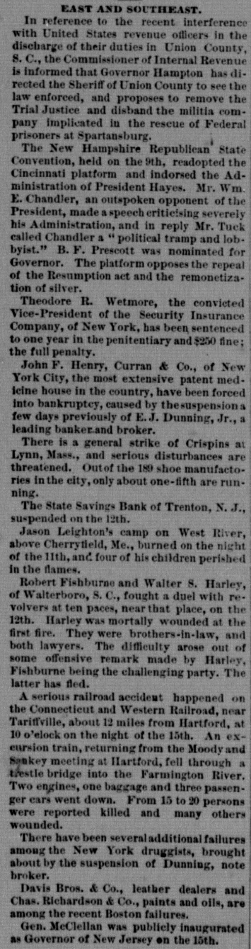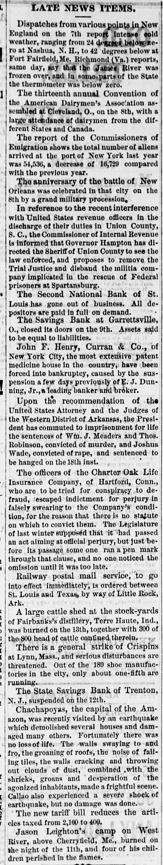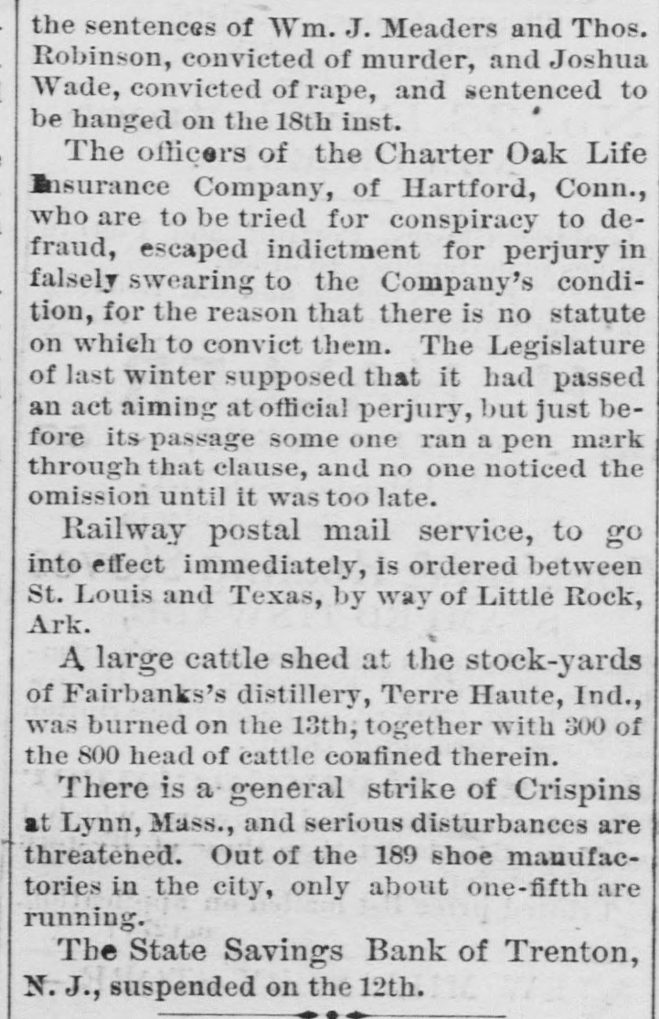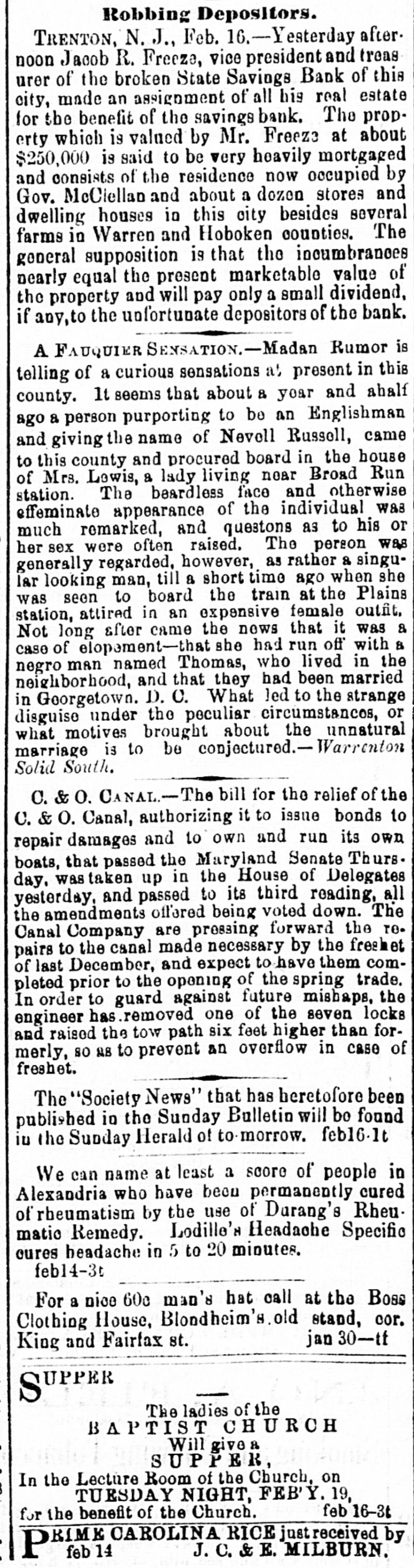 JERSEY SAVINGS BANKS. There continues in Newark among the many thousands of depositora in the Newark Savings Institution a deep seated feeling of distrust and even anger toward the management under whose control the bank was obliged to suspend last month, and a vigorous effort 19 being made by some of the depositors to not only bring about a complete change of management, but to have the responsible officers overbauled by the Grand Jury. Yesterday afternoon a number of German depositors held a meeting at Turn Hall, in Newark, when the subject was discussed with considerable freedom and anima110n in the German language The Agitation Committée made a report setting forth that they bad secured the services of Counsellors Teese and Fitzpatrick, and had been advised by them to apply to the Chancellor lor the removal of the present Board of Directors of the bank. Mr. Daniel Dodd, president of the bank, had stated, in answer to a communication calling upon him to resign, that he and the twelve directors, all except one, were ready to resign or would appoint such men in their places as the depositors might name, and then the new direc. tors could fill all vacancies. Ex-Assemblyman Gottfried Kornegar expressed himself in favor of keeping the present directors ID office until their management had been investigated by the Grand Jury. He was informed, however, that their removal would in no wise alter their status be. lore the Grand Jury. With the understanding that the list was to be submitted to the American depositors for approval or addition, should they hold a meeting, the following names were presented by the Agitation Committee and adopted as the choice of the meeting for new directors:-Jose Hensier, Noah Blanchard, Herman Schalk, M. R Dennis, Mayor Henry J. Yates, David M. Meeker, Theodore Macknit, Julius Brose, James G. Barnett, Horace Alling, George H. Wilkinson. EN H. Reynolds, Charles Borcherling, Alexander Nichola, Isador Lehinau, Julius Staff, Joseph Feder, Fred. erick Reinhold and Cuarles Neumann. A resolution Scat by Rev. Oscar Kroit, who was un. able to attend, opposing the supplement to the Geaera! Savings Bank act, now before the Legislature, was referred to the counsel above named. It IS understood that the matter will be brought to-day before the Grand Jury, with a view to getting that body to probe the past management of the bank to the bottom. STATE SAVINGS BANK. Great excitement prevails respecting the State Savings Bank of Trenton, of which J. R. Freese is VICO president; H. C. Freeae, hisson, cashier, with another son in the office. It was the relatives of this same Freese family who ran the Jersey City Savings Bank until Secretary of State Kelsey assumed charge. That flurry occasioned such distrust tespecting the "Freese bank" that a number of depositors gave the required two weeks' notice, which ex pired yesterday. W. H. Skeria, acting for Patrick Kelly, applied yesterday for the return of $540, but was refused by the cashier, who referred hith to J. R. Freese, then sitting in the rear office. This official stated that the demand, although in legal form, could not be met; that the assets of the bank were being scheduled for the purpose of securing a loan; that be had $100,000 in roal estate, all of which would be put up it necessary in order to protect the depositors, and until the loan could be effected nothing would be done. He was confident. however, that in the course of two or three days everything would be in shape. The Court of Chancery last night served an injunction on the treasurer of the bank restraining it from transacting any more business. It IS believed that a receiver' will be appointed to-morrow. Colonel Jacob R Freese, treasurer of the bank, places the habilities at $65,000 and the assets about $57,000. He stated that the run on the bank commenced two weeks ago, when 16 was found necessary to give the customary two weeks' notice to depositors. That expired last Saturday and the run was then 1m. mense, so much so that there was no money to pay out. The Colonel says he tried to negotiate several loans, one for $25,000, giving as security his personal property, worth $100,000, but failed., He says the securities are nearly all mortgages. He 18 willing to take the entire responsibility, and will see that no depositor loses a dollar. He says he pledges his word and honor to that effect. Mr. Freese is director of the First National Bank of Trenton, and holds other positions of honor. He 18 said to DO wealthy. THE DIME SAVINGS BANK. Mr. A. B. Dayton, of Jersey City, has presented to Chancellor Runyon, of New Jersey, at his chambers, in Newark, a potition of the Dime Savings Bank, of Hudson City, for direction in administering the trust, &c. The petition 8018 forth that there 18 now due de positors the sum of $27,246 06, and that the invest. ments of the institution are as follows:In bonds and mortgages on lands in Hudson county to the amount of $20,980. and in Bergen county $1,800;on lands in Jersey City $2,400, in the sales and office furniture of the institution 1,400, and $2,830 due from the estate of the late treasurer of the institution, and also in cash $100. It was represented