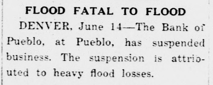 FLOOD FATAL TO FLOOD DENVER. June 14-The Bank of Pueblo, at Pueblo, has suspended business. The suspension is attriouted to heavy flood losses.