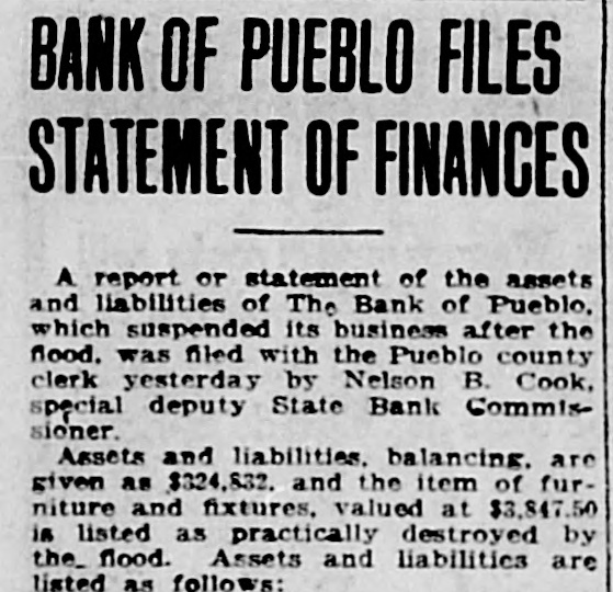 BANK OF PUEBLO FILES STATEMENT OF FINANCES A. report or statement of the assets and liabilities of The Bank of Pueble. which suspended its business after the flood. was filed with the Pueblo county clerk yesterday by Nelson B. Cook, special deputy State Bank Commissioner. Assets and liabilities. balancing. are given as $324,832. and the item of furniture and fixtures. valued at $3,847.50 is listed as practically destroyed by the_ flood. Assets and liabilities are listed as follows: