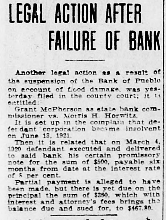 LEGAL ACTION AFTER FAILURE OF BANK Another legal action as a result of the suspension of the Bank of Pneblo on account of food damage. was yesterday filed in the county court; it 1.4 entitled Grant McPherson as state bank commissioner vs. Morris H Horwitz It is set up in the complain that defer dant corporation became insolvent on June 13. 1921. Then it is related that on March 4. 1920 defendant executed and delivered to said bank his certain promissory note for the sum of $500, payable six months from date at the interest rate of & per cent. Partial payment is alleged to have been made. but there is yet due on the principal the sum of $350. which with interest and attorney's fees brings the balance due and sued for, to $467.80.