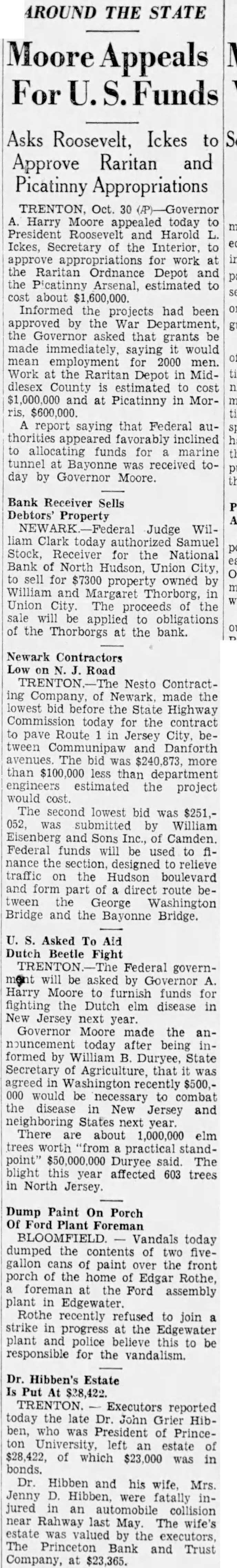 TRENTON, Oct. Harry Moore appealed today President Roosevelt Harold ed Ickes, Secretary the approve for work Raritan Ordnance Depot the Picatinny Arsenal, estimated cost about Informed projects had been approved the War the asked that grants made would employment for 2000 men. Work the Raritan Depot Middlesex County estimated and Picatinny in Mor$600,000. report saying that Federal thorities appeared inclined funds marine tunnel Bayonne was received day by Governor Moore.