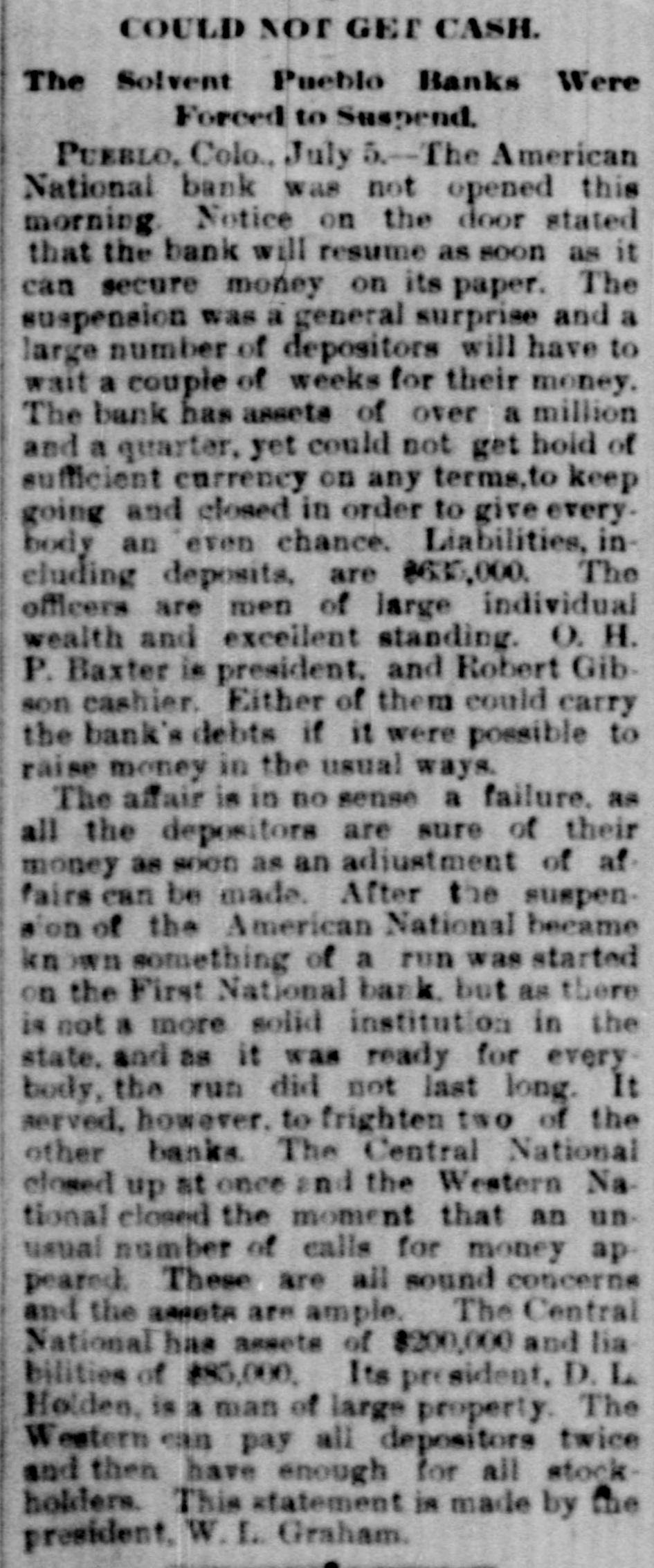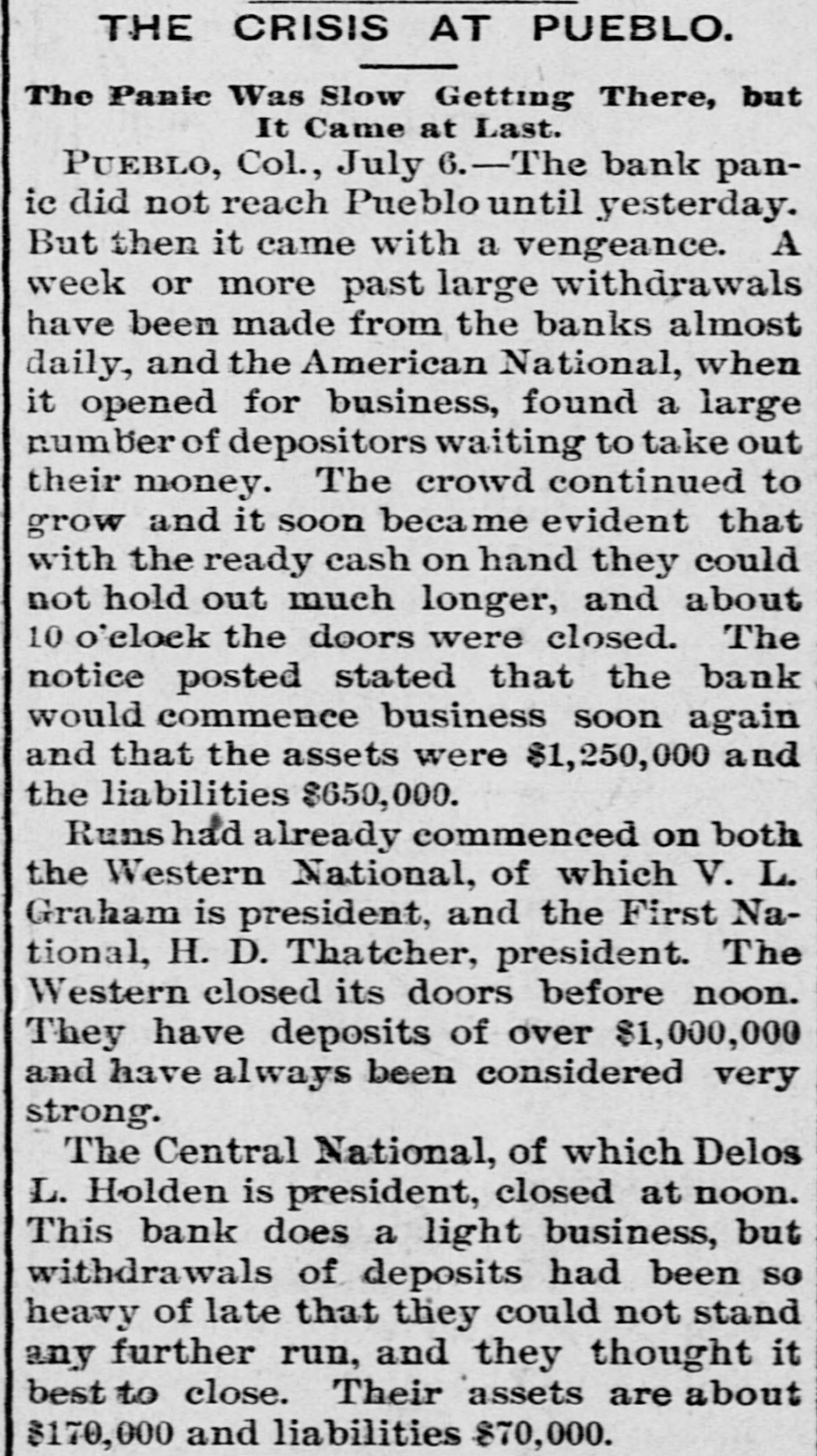 THE CRISIS AT PUEBLO. The Panic Was Slow Getting There, but It Came at Last. PUEBLO, Col., July The bank panic did not reach Pueblo until yesterday. But then it came with a vengeance. A week or more past large withdrawals have been made from the banks almost daily, and the American National, when it opened for business, found a large number of depositors waiting to take out their money. The crowd continued to grow and it soon became evident that with the ready cash on hand they could not hold out much longer, and about 10 o'elock the doors were closed. The notice posted stated that the bank would commence business soon again and that the assets were $1,250,000 and the liabilities $650,000. Runs had already commenced on both the Western National, of which V. L. Graham is president, and the First National, H. D. Thatcher, president. The Western closed its doors before noon. They have deposits of over $1,000,000 and have always been considered very strong. The Central National, of which Delos L. Holden is president, closed at noon. This bank does a light business, but withdrawals of deposits had been so heavy of late that they could not stand any further run, and they thought it best to close. Their assets are about $170,000 and liabilities $70,000.