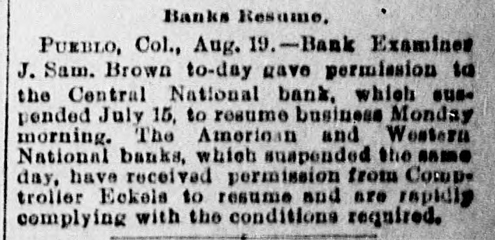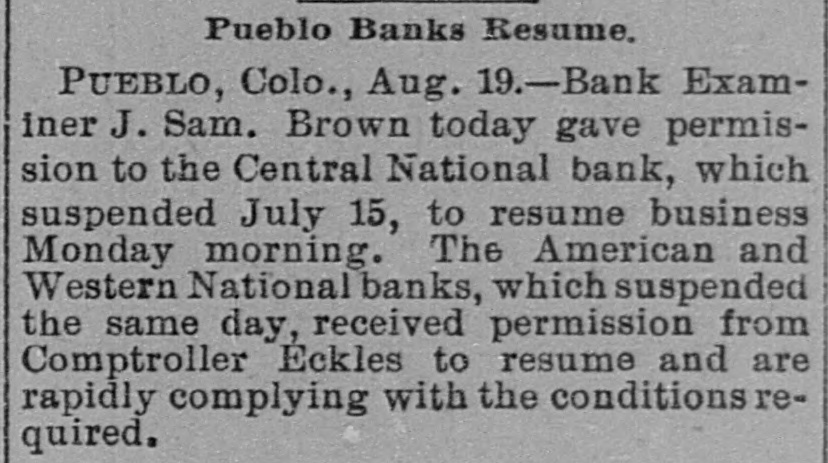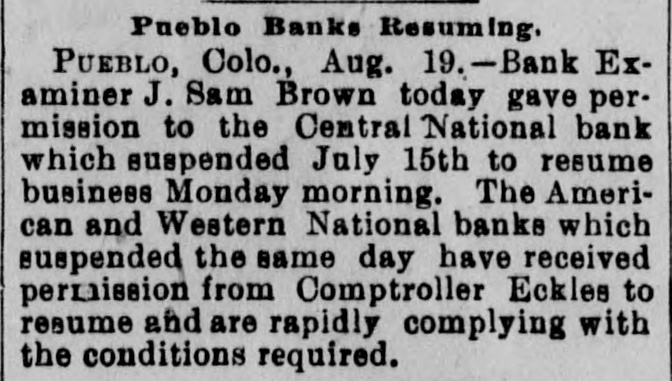 Pueblo Banks Resume. PUEBLO, Colo., Aug. 19.-Bank Examiner J. Sam. Brown today gave permission to the Central National bank, which suspended July 15, to resume business Monday morning. The American and Western National banks, which suspended the same day, received permission from Comptroller Eckles to resume and are rapidly complying with the conditions required.