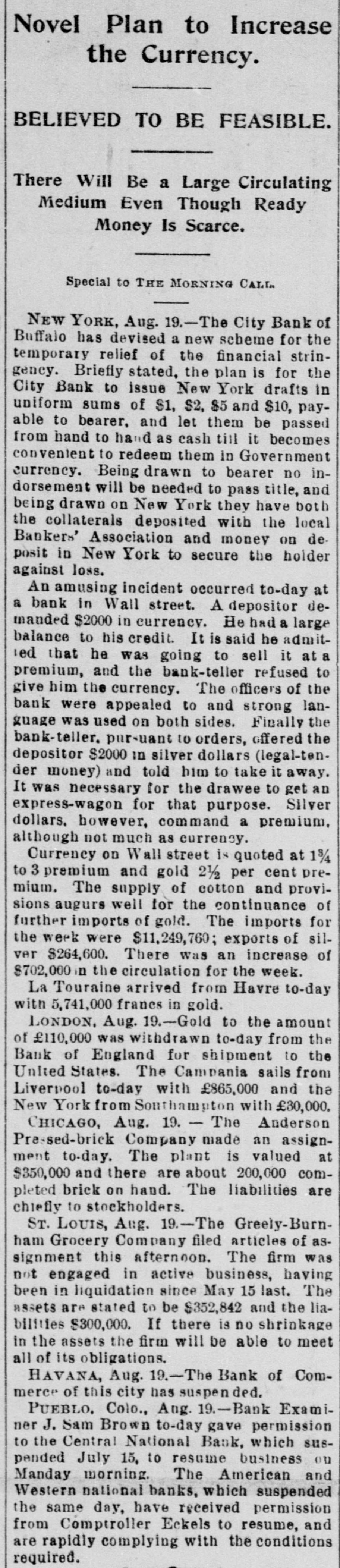 Novel Plan to Increase the Currency. BELIEVED TO BE FEASIBLE. There Will Be a Large Circulating Medium Even Though Ready Money Is Scarce. Special to THE MORNING CALL NEW YORK, Aug. 19.-The City Bank of Buffalo has devised a new scheme for the temporary relief of the financial stringency. Briefly stated, the plan is for the City Bank to issue New York drafts in uniform sums of $1, $2, $5 and $10, payable to bearer, and let them be passed from hand to hand as cash till it becomes convenient to redeem them in Government currency. Being drawn to bearer no indorsement will be needed to pass title, and being drawn on New York they have both the collaterals deposited with the local Bankers' Association and money on deposit in New York to secure the holder against loss. An amusing incident occurred to-day at a bank in Wall street. A depositor demanded $2000 in currency. He had a large balance to his credit. It is said he admited that he was going to sell it at a premium, and the bank-teller refused to give him the currency. The officers of the bank were appealed to and strong language was used on both sides. Finally the bank-teller. pur-uant to orders, offered the depositor $2000 in silver dollars (legal-tender money) and told him to take it away. It was necessary for the drawee to get an express-wagon for that purpose. Silver dollars. however, command a premium, although not much as currency. Currency on Wall street is quoted at 18/4 to 3 premium and gold 2 1/2 per cent premium. The supply of cotton and provisions augurs well for the continuance of further imports of gold. The imports for the week were $11,249,760; exports of silver $264,600. There was an increase of $702,000 in the circulation for the week. La Touraine arrived from Havre to-day with 5,741,000 francs in gold. LONDON, Aug. 19.-Gold to the amount of £110,000 was withdrawn to-day from the Bank of England for shipment to the United States. The Campania sails from Liverpool to-day with £865,000 and the New York from Sonthampton with £30,000. CHICAGO, Aug. 19. - The Anderson Pre-sed-brick Company made an assignment to-day. The plant is valued at $350,000 and there are about 200,000 completed brick on hand. The liabilities are chiefly to stockholders. ST. LOUIS, Aug. 19.-The Greely-Burnham Grocery Company filed articles of assignment this afternoon. The firm was not engaged in active business, having been in liquidation since May 15 last. The assets are stated to be $352,842 and the liabilities $300,000. If there is no shrinkage in the assets the firm will be able to meet all of its obligations. HAVANA, Aug. 19.-The Bank of Commerce of this city has suspended. PUEBLO. Colo., Aug. 19.-Bank Examiner J. Sam Brown to-day gave permission to the Central National Bank, which suspended July 15, to resume business ou Manday morning. The American and Western national banks, which suspended the same day, have received permission from Comptroller Eckels to resume, and are rapidly complying with the conditions required.