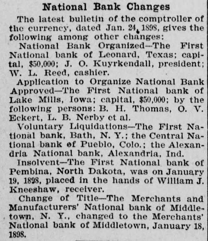National Bank Changes The latest bulletin of the comptroller of the currency, dated Jan. 24 1898, gives the following among other changes: National Bank Organized-The First National bank of Leonard, Texas; capital, $50,000; J. O. Kuyrkendall, president; W. L. Reed, cashier. Application to Organize National Bank Approved-The First National bank of Lake Mills, Iowa; capital, $50,000; by the following persons: B. H. Thomas, O. V. Eckert, L. B. Nerby et al. Voluntary Liquidations-The First National bank, Bath, N. Y. ; the Central National bank of Pueblo, Colo.; the Alexandria National bank, Alexandria, Ind. Insolvent-The First National bank of Pembina, North Dakota, was on January 19, 1898, placed in the hands of William J. Kneeshaw, receiver. Change of Title-The Merchants and Manufacturers' National bank of Middletown, N. Y., changed to the Merchants' National bank of Middletown, January 18, 1898.
