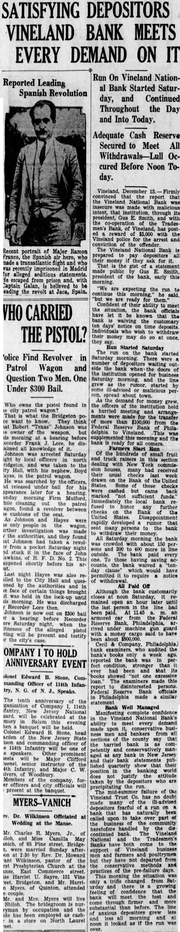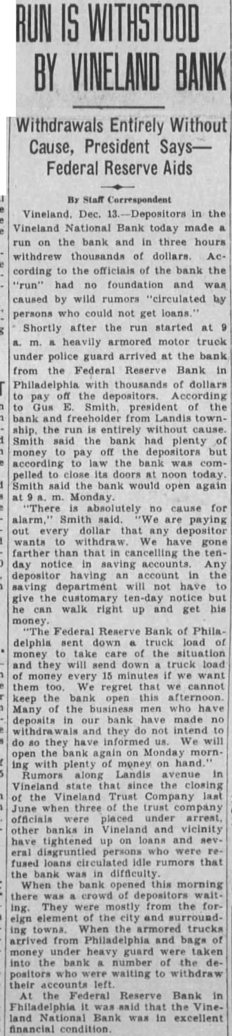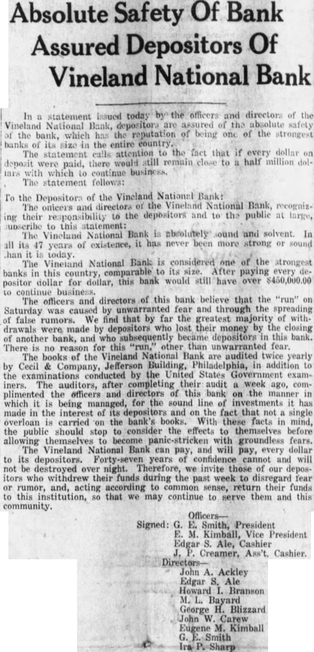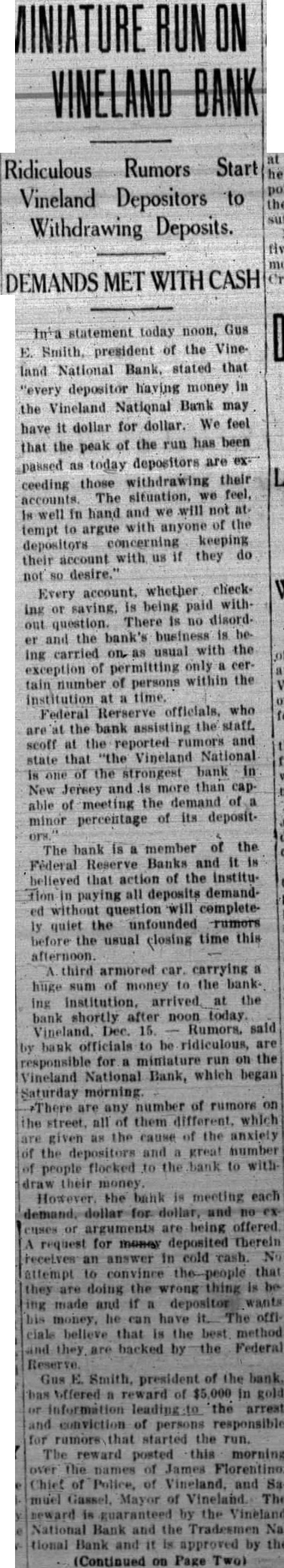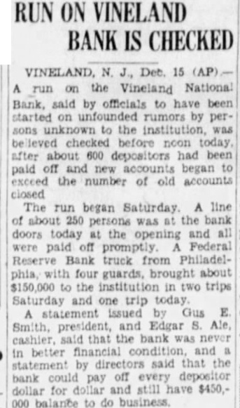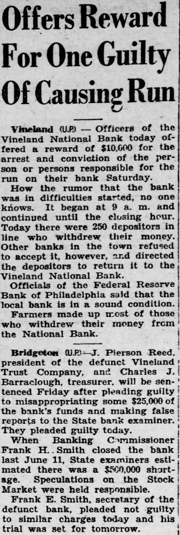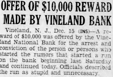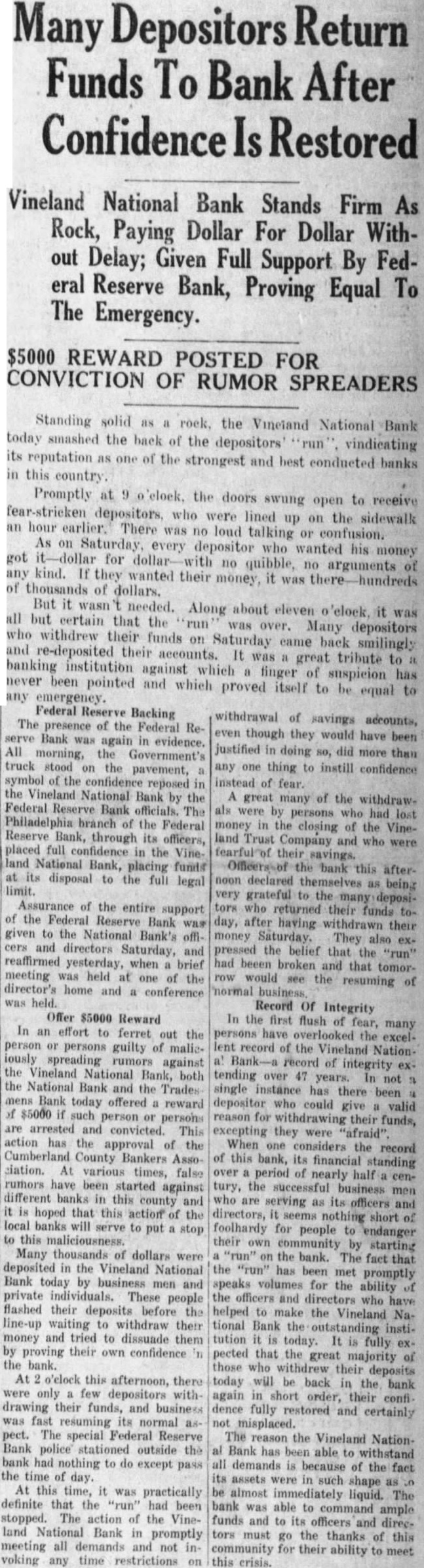 Offer $5000 Reward In an effort to ferret out the person persons guilty of maliciously spreading rumors against the Vineland National Bank, both the National Bank and the Trades mens Bank today offered reward $5000 such person are arrested and convicted. This action has the approval of the Cumberland County Bankers ciation. At various times, false rumors have been started against different banks in this county and is hoped that this action the local banks will stop this maliciousness. Many thousands of dollars deposited in the Vineland National Bank today by business men and private individuals. These people flashed their before deposits line-up waiting withdraw their money and tried to dissuade them proving their own confidence bank. At o'elock this afternoon, only few depositors withdrawing their funds, and business was fast resuming its normal The special Federal Reserve Bank police stationed outside the bank had nothing to do except pass the time of day. At this time, was practically definite that the "run" had been stopped. action of the Vineland National Bank in promptly meeting all demands and not voking any time restrictions withdrawal of savings accounts, though they would have been justified in doing so, did more than any one thing to instill confidence instead of fear. great many of the withdrawwere by persons who had lost money in the closing of the Vineland Trust Company and who were their savings. Officers of bank this after noon declared themselves being grateful to the many depositors returned their funds day, after having withdrawn their money Saturday. They also pressed the belief that the had beeen broken and that tomorrow would see the resuming normal Record Of Integrity In the first flush of fear, many persons have overlooked the record of the Vineland Nation record of integrity tending over 47 years. single instance has there been depositor who could valid give reason for withdrawing their funds, excepting they "afraid". When one considers the record this bank, its financial standing over period of nearly tury, the business are serving officers and directors, nothing short foolhardy for people endanger their own community starting the bank. The fact that has been met promptly speaks volumes for the ability officers and directors who have helped make the Vineland tional Bank the outstanding tution today. fully pected that the great majority those who their deposits today will back in the bank again short order, their confi dence fully restored and certainly misplaced. The reason the Vineland NationBank has been able to withstand all demands because of the fact assets were in such shape almost immediately liquid. The bank was able to command ample funds and to its officers and directors must the thanks of this community for their ability to meet this crisis.