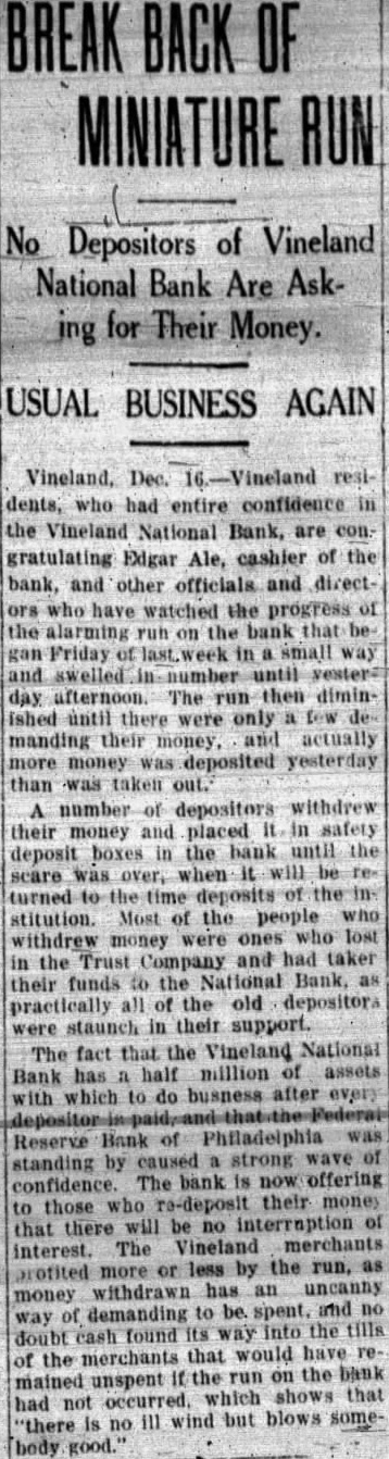Vineland National Bank Stands Firm As Rock, Paying Dollar For Dollar Without Delay; Given Full Support By Federal Reserve Bank, Proving Equal To The Emergency.