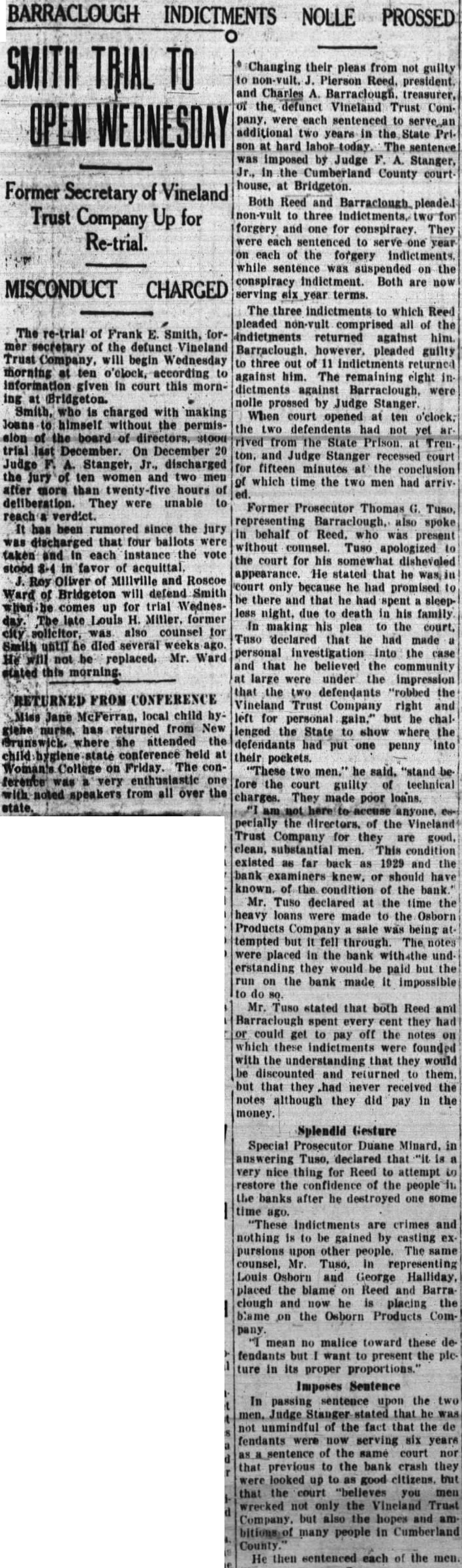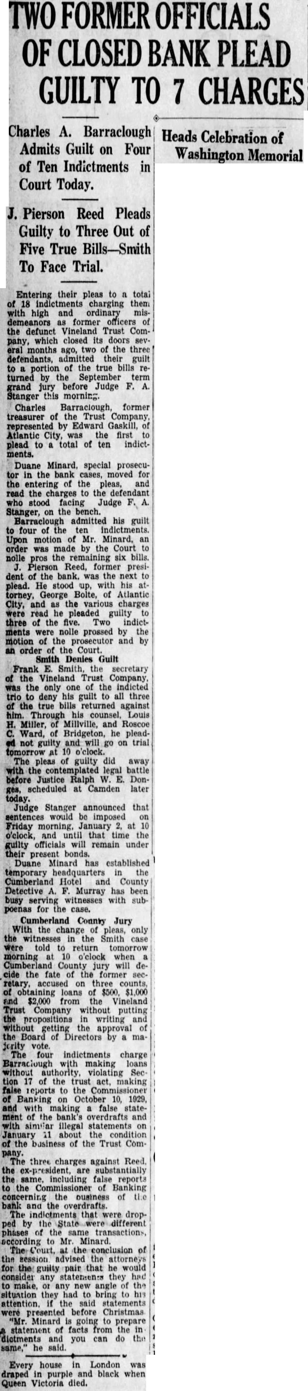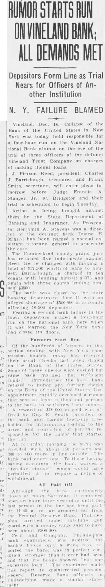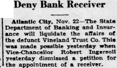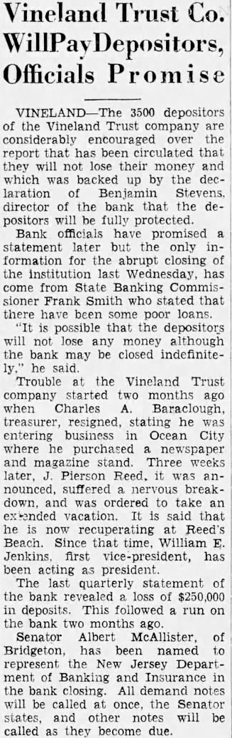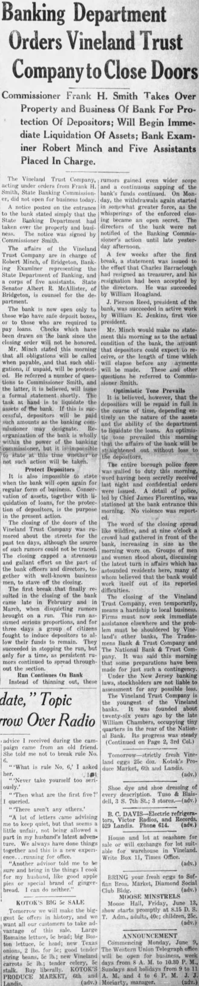 The Vineland Trust Company, under orders from Frank Smith, State Banking Commissiondid not open for business today. notice posted on the entrance to the bank stated simply that the State Banking Department had taken over the property and business. The notice was signed by Commissioner Smith. The affairs of the Vineland Trust Company are in charge of Robert Minch, of Bridgeton, Banking Examiner representing the State Department of Banking, and corps of five assistants. State Senator Albert R. McAllister, of Bridgeton, is counsel for the department. The bank is now open only to those who have safe deposit boxes, or to those who are required to pay loans. Checks which have been drawn on the bank since the closing order will not be honored. Mr. Minch stated this morning that all obligations will be called when payable, and that such obligations, unpaid, will be protestHe referred number of questions to Commissioner Smith, and the latter, it is believed, will issue formal statement shortly. The task at hand is to liquidate the assets of the bank. If this is suecessful, depositors will paid such amounts as the banking commissioner may designate. organization the bank wholly within the power of the banking state this time not such action will be taken. Protect Depositors It is also impossible state when the bank will open again for regular form of business. Conservation of assets, together with quidation of loans, for the protection of depositors, is the purpose in the present action. The closing of the doors of the Vineland Trust Company was rumored about the streets for the past ten days, although the source of such rumors could not be traced. The closing capped strenuous and gallant effort the part the bank officers and directors, together with business men, to stave off the closing. The first break that finally sulted in the closing of the bank came late in February and in March, when disquieting rumors brought on run. This run assumed serious proportions, and for three days group of citizens fought to induce depositors to low their funds to remain. They succeeded in stopping the run, but only for time, as persistent rumors continued to spread throughout the section. Run Continues On Bank Instead of thinning out, these rumors gained even wider scope and continuous sapping of the bank's funds continued. On Monday, the withdrawals again started in somewhat greater force, as the whisperings of the enforced closing became an open secret. The directors of the bank were not notified the Banking Commissioner's action until late yesterday afternoon. few weeks after the first break, statement was issued to the effect that Charles Barraelough had resigned as treasurer, and his resignation had been accepted by the directors. He was succeeded by William Hoagland. Pierson Reed, president of the bank, was succeeded in active work by William E. Jenkins, first vice president. Mr. Minch would make no statement this morning as to the actual condition of the bank, the amount that depositors could expect to receive, or the length of time which will elapse before any ayments will be made. These and other questions he referred to Commissioner Smith.