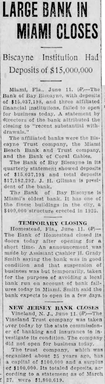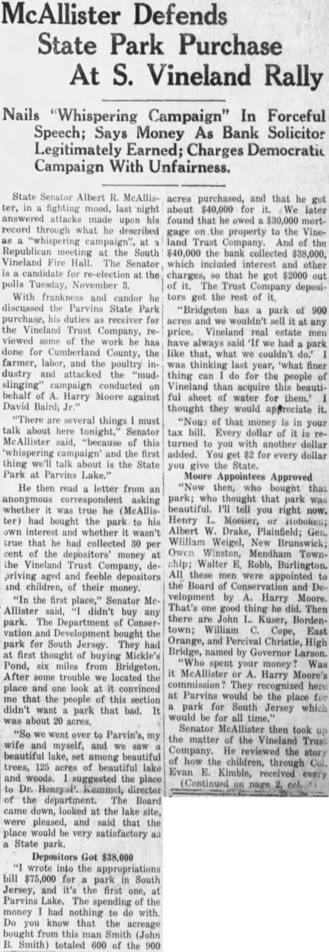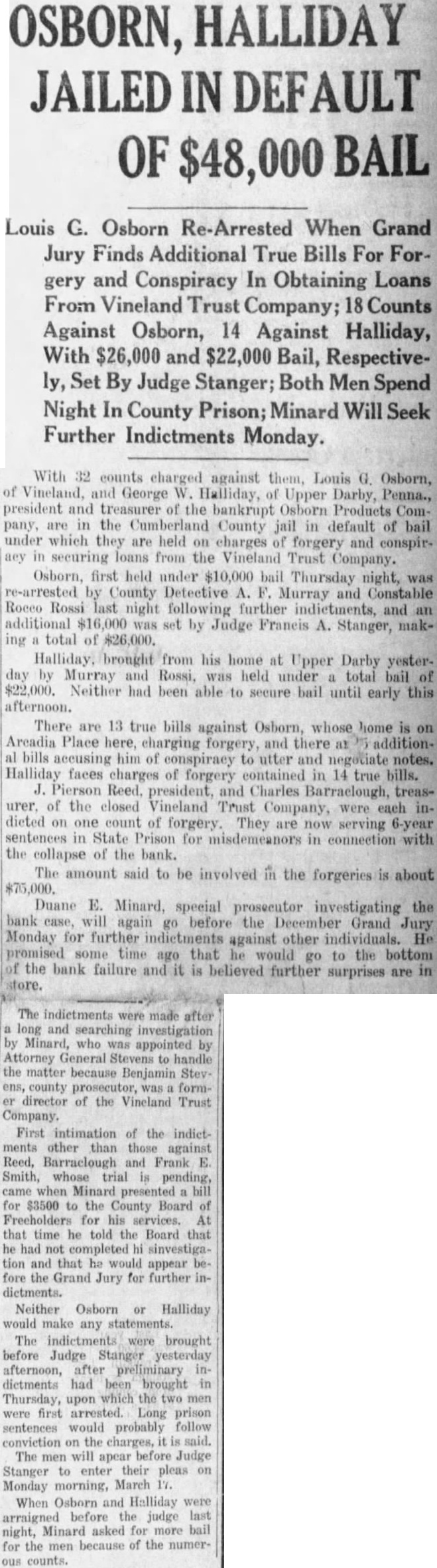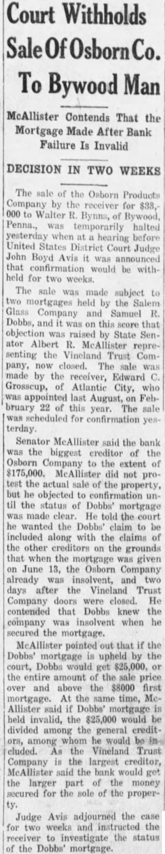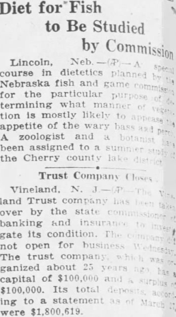The Vineland Trust Company, under orders from Frank Smith, State Banking Commissiondid not open for business today. notice posted on the entrance to the bank stated simply that the State Banking Department had taken over the property and business. The notice was signed by Commissioner Smith. The affairs of the Vineland Trust Company are in charge of Robert Minch, of Bridgeton, Banking Examiner representing the State Department of Banking, and corps of five assistants. State Senator Albert R. McAllister, of Bridgeton, is counsel for the department. The bank is now open only to those who have safe deposit boxes, or to those who are required to pay loans. Checks which have been drawn on the bank since the closing order will not be honored. Mr. Minch stated this morning that all obligations will be called when payable, and that such obligations, unpaid, will be protestHe referred number of questions to Commissioner Smith, and the latter, it is believed, will issue formal statement shortly. The task at hand is to liquidate the assets of the bank. If this is suecessful, depositors will paid such amounts as the banking commissioner may designate. organization the bank wholly within the power of the banking state this time not such action will be taken. Protect Depositors It is also impossible state when the bank will open again for regular form of business. Conservation of assets, together with quidation of loans, for the protection of depositors, is the purpose in the present action. The closing of the doors of the Vineland Trust Company was rumored about the streets for the past ten days, although the source of such rumors could not be traced. The closing capped strenuous and gallant effort the part the bank officers and directors, together with business men, to stave off the closing. The first break that finally sulted in the closing of the bank came late in February and in March, when disquieting rumors brought on run. This run assumed serious proportions, and for three days group of citizens fought to induce depositors to low their funds to remain. They succeeded in stopping the run, but only for time, as persistent rumors continued to spread throughout the section. Run Continues On Bank Instead of thinning out, these rumors gained even wider scope and continuous sapping of the bank's funds continued. On Monday, the withdrawals again started in somewhat greater force, as the whisperings of the enforced closing became an open secret. The directors of the bank were not notified the Banking Commissioner's action until late yesterday afternoon. few weeks after the first break, statement was issued to the effect that Charles Barraelough had resigned as treasurer, and his resignation had been accepted by the directors. He was succeeded by William Hoagland. Pierson Reed, president of the bank, was succeeded in active work by William E. Jenkins, first vice president. Mr. Minch would make no statement this morning as to the actual condition of the bank, the amount that depositors could expect to receive, or the length of time which will elapse before any ayments will be made. These and other questions he referred to Commissioner Smith.