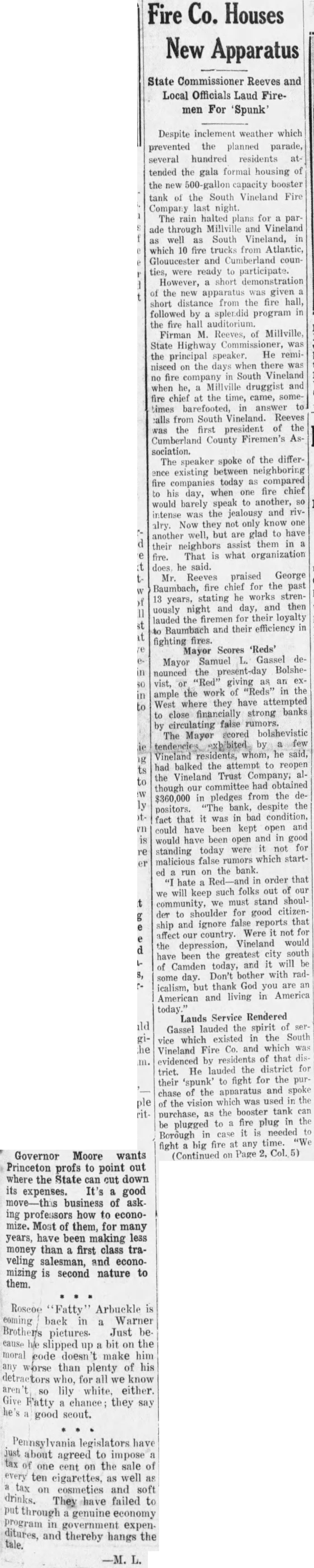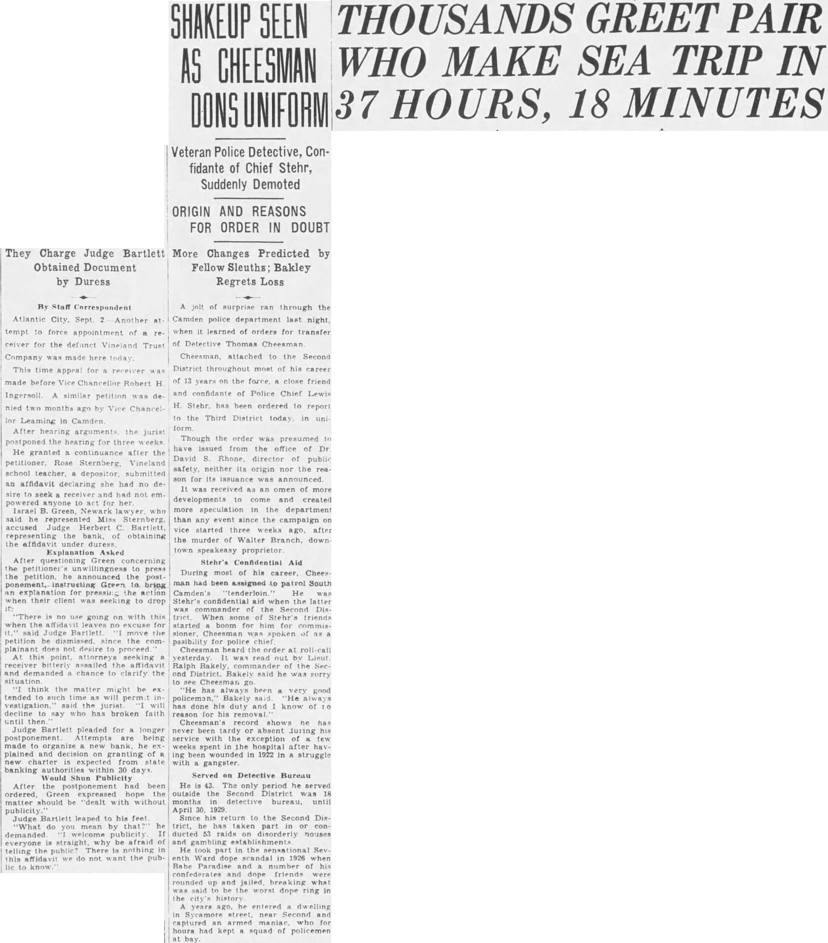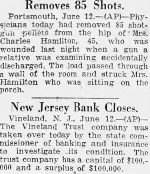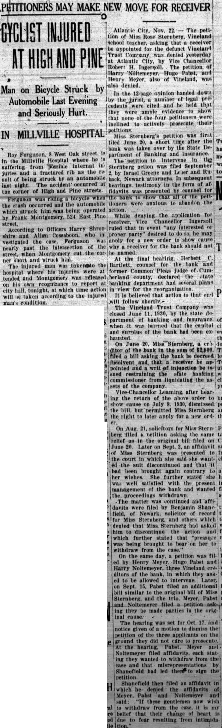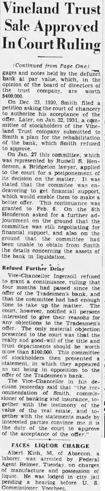 Optimistic Tone Prevails It is believed, however, that the depositors will be repaid in full in the course of time, depending entirely on the nature of the assets and the ability of the department to liquidate the loans. An optimistic tone prevailed this morning that the affairs of the bank will be out without loss the depositors. The entire borough police force called to duty this morning, having been secretly received last night and confidential orders issued. A detail of police, led by Chief James Florentino, was stationed at the bank entrance this morning. No violence was reportThe word of the closing spread like wildfire, and at nine o'clock crowd had gathered in front of the bank, increasing in size the morning wore Groups of men and women stood about, discussing the latest turn in affairs which has astounded residents here, many of whom believed that the bank would work itself out of its reported difficulties. The closing of the Vineland Trust Company, even temporarily, means hardship to local business. Firms must now seek immediate assistance elsewhere and the problem must be shouldered by Vineland's other banks, The Tradesmens Bank & Trust Company and The National Bank & Trust Company. It was said this morning that some preparations have been made for just such contingency. Under New Jersey banking laws, stockholders are not liable assessment for any possible loss. The Vineland Trust Company the youngest of the Vineland banks. It was founded about twenty-six years ago by the late William Chambers, occupying tiny quarters in the rear of the NationBank. Its progress was steady (Continued on Page 3rd Col.) fresh Vineland eggs 25c doz. Kotok's Produce Market, 6th and Landis. (adv.)