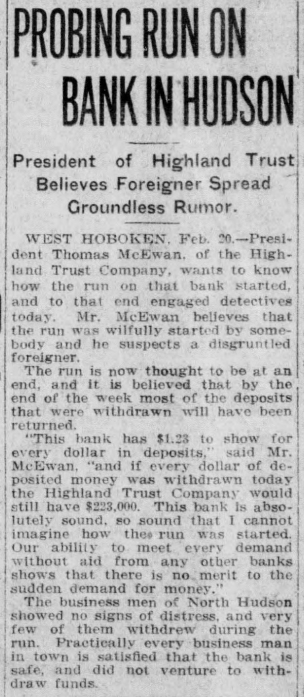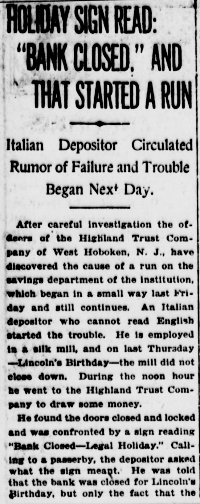HOLIDAY SIGN READ: "BANK CLOSED." AND THAT STARTED A RUN Italian Depositor Circulated Rumor of Failure and Trouble Began Next Day. After careful investigation the ofGeers of the Highland Trust Company of West Hoboken, N. J., have discovered the cause of a run on the savings department of the institution, which began in a small way last Friday and still continues. An Italian depositor who cannot read English started the trouble. He is employed in a silk mill, and on last Thursday -Lincoln's Birthday-the mill did not close down. During the noon hour he went to the Highland Trust Company to draw some money. He found the doors closed and locked and was confronted by a sign reading "Bank Closed-Legal Holiday." Calling to a passerby, the depositor asked what the sign meant. He was told that the bank was closed for Lincoln's Birthday, but only the fact that the
