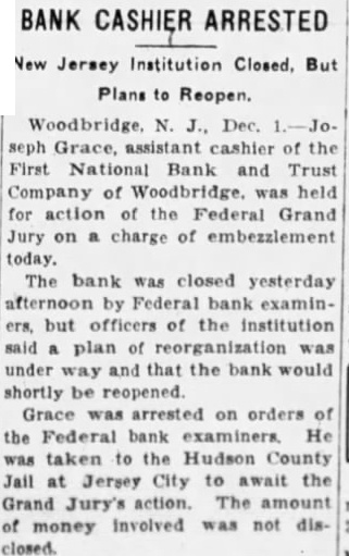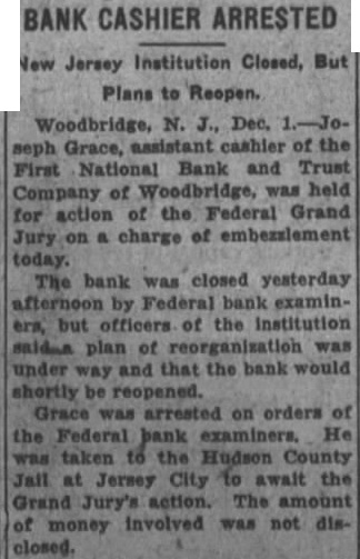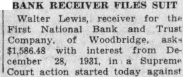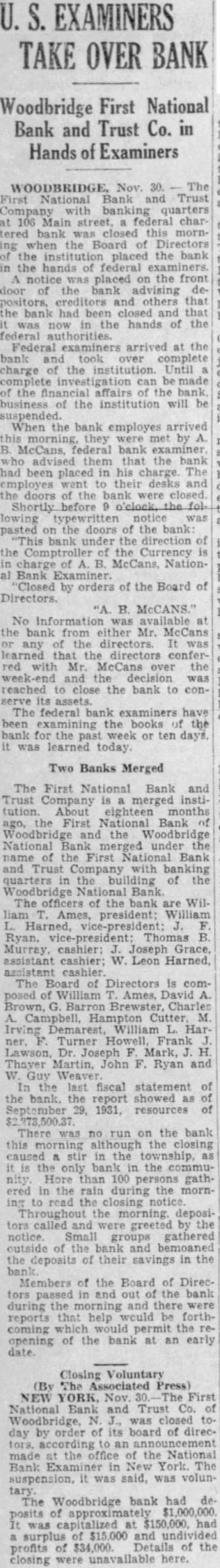EXAMINERS TAKE OVER BANK Woodbridge First National Bank and Trust Co. in Hands of Examiners Nov. The First National Bank and Trust Company quarters 106 street, charbank closed morning the Board Directors the institution placed the bank in the hands of federal examiners. notice was placed on the front door of the bank advising deand others that the bank had and that now the hands of the Federal examiners arrived at the took over charge the institution. Until can made the affairs bank the institution will be suspended. When the bank employes arrived they met by McCans, federal bank examiner them that the had been placed his charge The went desks and the doors bank were closed. Shortly before notice was pasted the doors of the bank bank the direction the the Currency is charge of Nation Bank Closed by orders of the Board of Directors. "A. B. McCANS. No at the either Mr. McCans the It learned conferwith Mr. McCans the week-end and decision was reached to the bank to conThe federal examining the books the for the or ten days, was learned today. Two Banks Merged The First National Bank and Trust Company is instiAbout eighteen months ago, the First National Bank Woodbridge and the Woodbridge National under name First Bank quarters the building of the Woodbridge Bank The officers of the bank Wilpresident; William cashier: Joseph Grace, assistant W. Leon Harned, assistant cashier The Board of Directors is of William Brown, M. Demarest, William HarTurner Frank Dr. Joseph Mark, H Thayer Martin, John F. Ryan and Guy Weaver last fiscal statement the the report showed 29, 1931, resources There was run on the bank this although the closing caused stir in the the the nity. Hore than 100 the rain during the morning read the morning. depositors called and were greeted by the Small groups gathered outside the deposits of their savings in the Members of the Board of Direcpassed out the during the and there reports that help would be forthcoming the opening of the bank at an early date. Closing Voluntary (By The Press) NEW YORK, Nov. The National Bank and Trust Co. Woodbridge, was closed today by of its board of the the National in New York. The suspension, It was said, was volun- The Woodbridge bank had deapproximately was capitalized $150,000. had $15,000 profits of $34,000. Details of the closing were unavailable