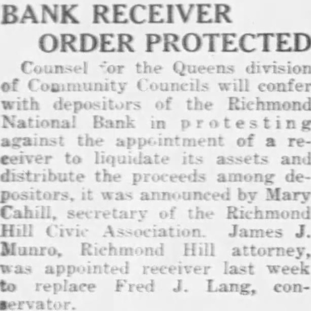 Newspaper articles (Nov 1933 onward) report appointment of a conservator and then a receiver and describe liquidation of the Richmond National Bank of Richmond Hill. There is no mention of a depositor run prior to suspension; the bank was placed in conservatorship/receivership by the Controller of the Currency and later liquidated. Dates use publication dates when specific action timing is described in the article.