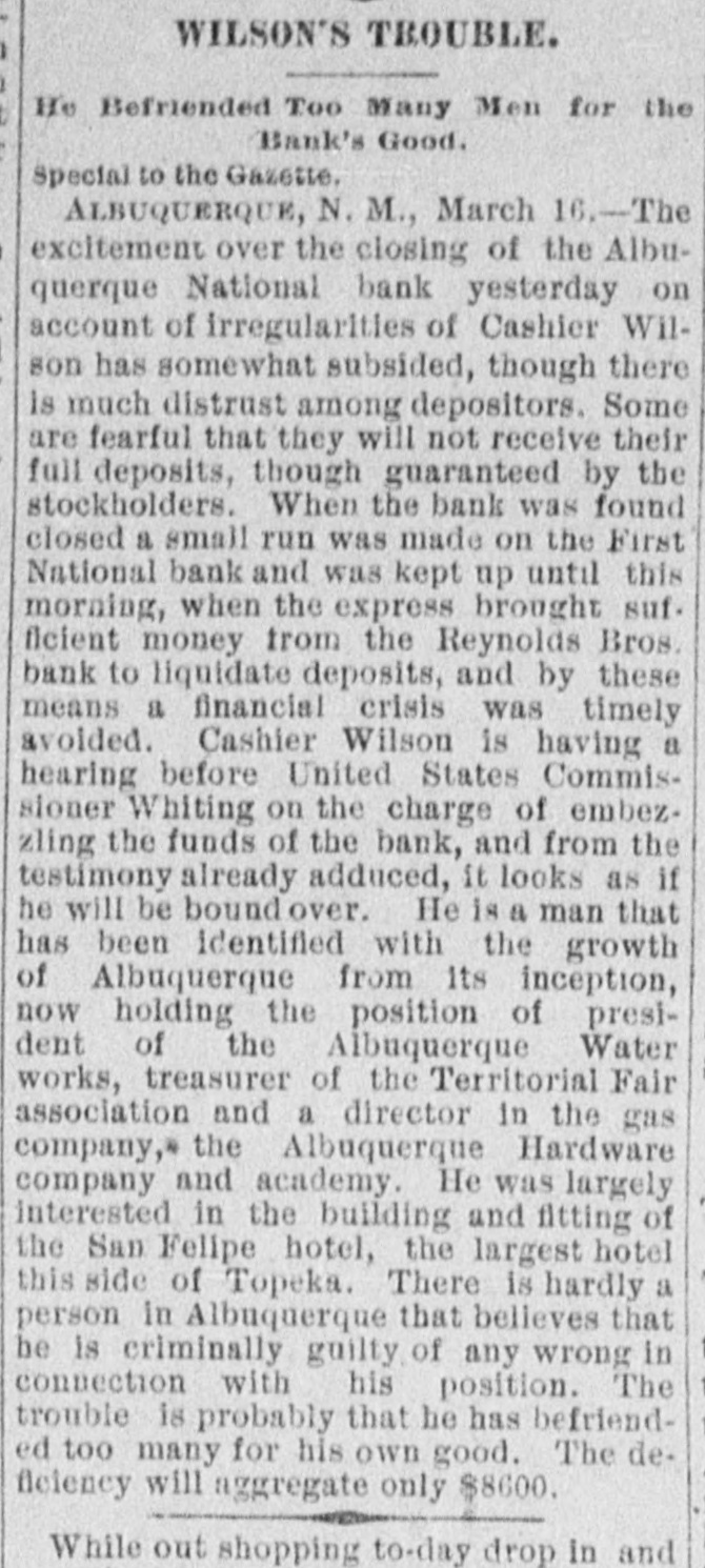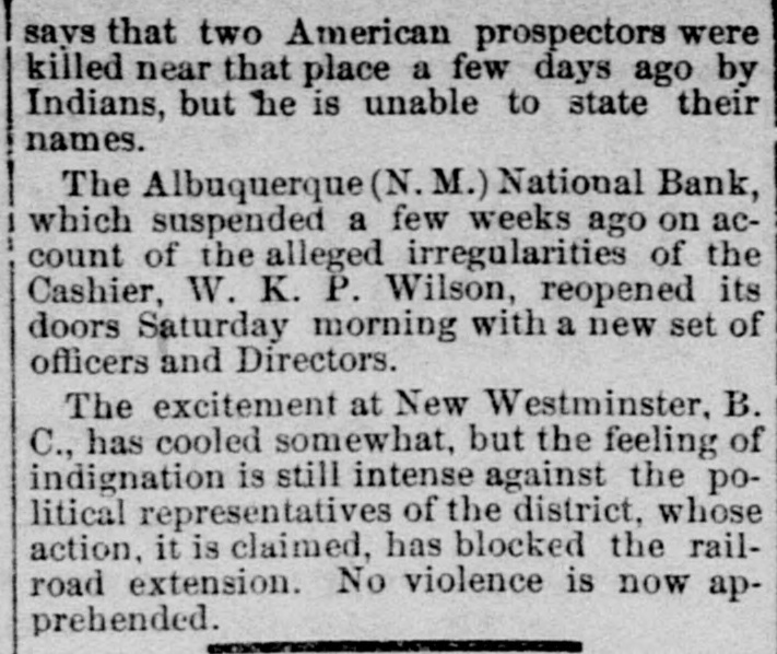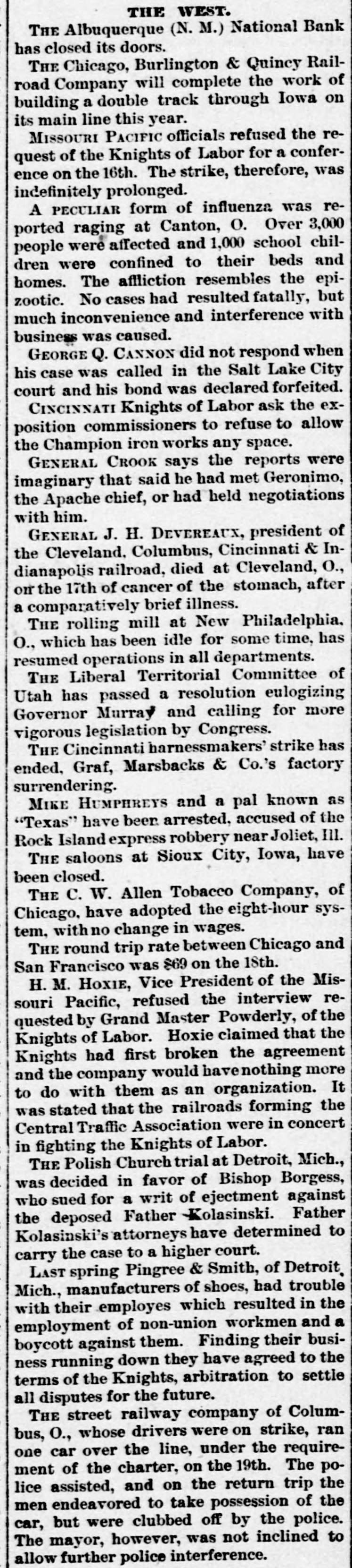 THE WEST. THE Albuquerque (N. M.) National Bank has closed its doors. THE Chicago, Burlington & Quincy Railroad Company will complete the work of building a double track through Iowa on its main line this year. MISSOURI PACIFIC officials refused the request of the Knights of Labor for a conference on the 16th. The strike, therefore, was indefinitely prolonged. A PECULIAR form of influenza was reported raging at Canton, O. Over 3,000 people were affected and 1,000 school children were confined to their beds and homes. The affliction resembles the epizootic. No cases had resulted fatally, but much inconvenience and interference with business was caused. GEORGE Q. CANNON did not respond when his case was called in the Salt Lake City court and his bond was declared forfeited. CINCINNATI Knights of Labor ask the exposition commissioners to refuse to allow the Champion iron works any space. GENERAL CROOK says the reports were imaginary that said he had met Geronimo, the Apache chief, or had held negotiations with him. GENERAL J. H. DEVEREAUX, president of the Cleveland. Columbus, Cincinnati & Indianapolis railroad, died at Cleveland, O., on the 17th of cancer of the stomach, after a comparatively brief illness. THE rolling mill at New Philadelphia, O., which has been idle for some time, has resumed operations in all departments. THE Liberal Territorial Committee of Utah has passed a resolution eulogizing Governor Murray and calling for more vigorous legislation by Congress. THE Cincinnati harnessmakers' strike has ended, Graf, Marsbacks & Co.'s factory surrendering. MIKE HUMPHREYS and a pal known as "Texas" have been arrested, accused of the Rock Island express robbery near Joliet, III. THE saloons at Sioux City, Iowa, have been closed. THE C. W. Allen Tobacco Company, of Chicago, have adopted the eight-hour system, with no change in wages. THE round trip rate between Chicago and San Francisco was $69 on the 18th. H. M. HOXIE, Vice President of the Missouri Pacific, refused the interview requested by Grand Master Powderly, of the Knights of Labor. Hoxie claimed that the Knights had first broken the agreement and the company would havenothing more to do with them as an organization. It was stated that the railroads forming the Central Traffic Association were in concert in fighting the Knights of Labor. THE Polish Church trial at Detroit, Mich., was decided in favor of Bishop Borgess, who sued for a writ of ejectment against the deposed Father Kolasinski. Father Kolasinski's attorneys have determined to carry the case to a higher court. LAST spring Pingree & Smith, of Detroit Mich., manufacturers of shoes, had trouble with their employes which resulted in the employment of non-union workmen and a boycott against them. Finding their business running down they have agreed to the terms of the Knights, arbitration to settle all disputes for the future. THE street railway company of Columbus, O., whose drivers were on strike, ran one car over the line, under the requirement of the charter, on the 19th. The police assisted, and on the return trip the men endeavored to take possession of the car, but were clubbed off by the police. The mayor, however, was not inclined to allow further police interference.