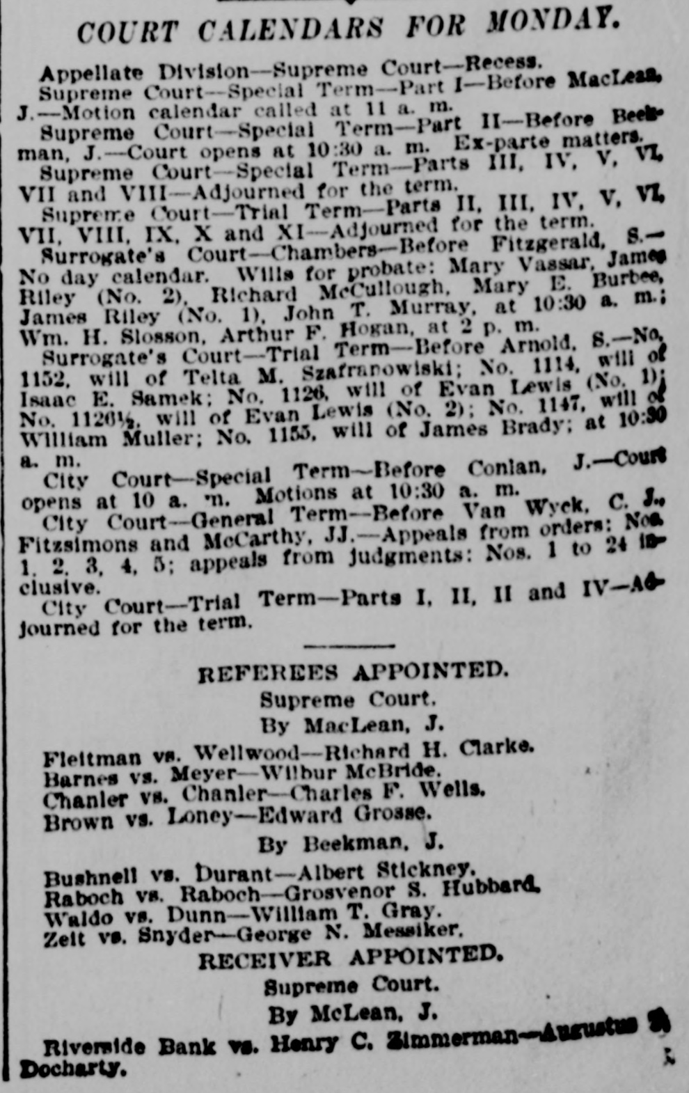 COURT CALENDARS FOR MONDAY. Appellate Division-Supreme Court-Recess. Supreme Court Special Term-Part I-Before MacLean J.-Motion calendar called at 11 a. m. Supreme Court-Special Term-Part II-Before Beek J.-Court opens at 10:30 a. m. Ex-parte matters. man, Supreme Court-Special Term-Parts III, IV, V, VL VII and VIII-Adjourned for the term. Supreme Court-Trial Term-Parts II, III. IV, V. VL VII, VIII, IX, X and X1-Adjourned for the term. Surrogate's Court--Chambers-Before Fitzgerald, S.No day calendar. Wills for probate: Mary Vassar, James (No. 2), Richard McCullough, Mary E. Burbee, m.; Riley James Riley (No. 1). John T. Murray, at 10:30 a. Wm. H. Slosson, Arthur F. Hogan, at 2 p. m. Court-Trial Term-Before Arnold. S.-No. of 1152. Surrogate's will of Telta M. Szafranowiski; No. 1114, (No. will 1); Samek: No. 1126, will of Evan Lewis Isaac E. will of Evan Lewis (No. 2): No. 1147, will 10:30 of No. William 11201/2. Muller; No. 1155. will of James Brady: at a. City m. Court-Special Term-Before Conian, J.-Court opens at 10 a. n. Motions at 10:30 a. m. Court-General Term-Before Van Wyck, C. Noa 3., City and McCarthy, .-Appeals from orders: in Fitzsimons 1. 2. 3, 4, 5: appeals from judgments: Nos. 1 to 24 clusive. City Court-Trial Term-Parts I, II, II and IV-AG journed for the term. REFEREES APPOINTED. Supreme Court. By MacLean, J. Fleitman VR. Wellwood - Richard H. Clarke. Barnes vs. Meyer-Wl!bu McBride. Chanler vs. Chanler-Charles F. Wells. Brown vs. Loney-Edward Grosse. By Beekman, J. Bushnell vs. Durant-Albert Stickney. Raboch vs. Raboch-Grosvenor S. Hubbard Waldo vs. Dunn-William T. Gray. Zelt vs. Snyder-George N. Messiker, RECEIVER APPOINTED. Supreme Court. By McLean. J. Riverside Bank vs. Henry c. Docharty.