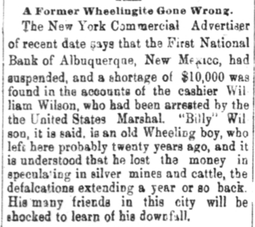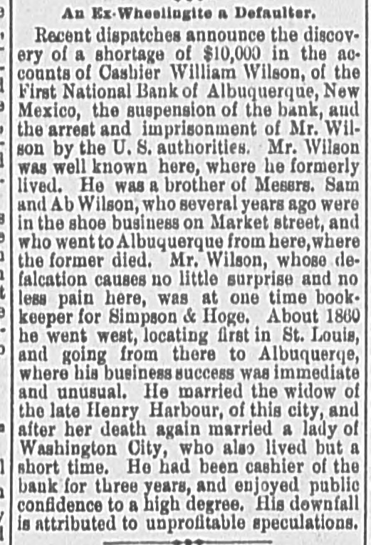 WILSON'S TROUBLE. He Befriended Too Many Men for the Bank's Good. Special to the Gazette. ALBUQUERQUE, N. M., March 16.-The excitement over the closing of the Albuquerque National bank yesterday on account of irregularities of Cashier Wilson has somewhat subsided, though there is much distrust among depositors. Some are fearful that they will not receive their full deposits, though guaranteed by the stockholders. When the bank was found closed a small run was made on the First National bank and was kept up until this morning, when the express brought sufficient money from the Reynolds Bros. bank to liquidate deposits, and by these means a financial crisis was timely avoided. Cashier Wilson is having a hearing before United States Commissioner Whiting on the charge of embezzling the funds of the bank, and from the testimony already adduced, it looks as if he will be bound over. He is a man that has been identified with the growth of Albuquerque from its inception, now holding the position of president of the Albuquerque Water works, treasurer of the Territorial Fair association and a director in the gas company,* the Albuquerque Hardware company and academy. He was largely interested in the building and fitting of the San Felipe hotel, the largest hotel this side of Topeka. There is hardly a person in Albuquerque that believes that be is criminally guilty of any wrong in connection with his position. The trouble is probably that he has befriended too many for his own good. The defleiency will aggregate only $8600. While out shopping to-day drop in and