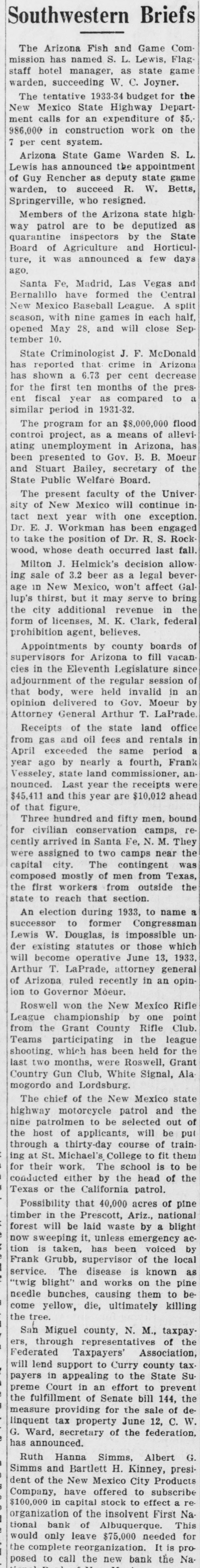Southwestern Briefs The Arizona Fish and Game Com mission has named S. L. Lewis, Flagstaff hotel manager, as state game warden, succeeding W. C. Joyner. The tentative 1933-34 budget for the Mexico State Highway Departcalls for an ment New expenditure on of $5.- the 986,000 in construction work 7 per cent system. Arizona State Game Warden S. L. has announced the appointment of Rencher as deputy game to succeed R. warden, Lewis Guy state W. Betts, Springerville, who resigned. Members of the Arizona state highpatrol are to be deputized as inspectors by Agriculture and quarantine Board way of the few Horticul- State days ture, it was announced a ago. Santa Fe, Madrid, Las Vegas and Bernalillo have formed the Central New Mexico Baseball League. A split season, with nine games in each half, opened May 28, and will close September 10. State Criminologist J. F. McDonald has reported that crime in Arizona has shown a 6.73 per cent decrease for the first ten months of the present fiscal year as compared to similar period in 1931-32. The program for an $8,000,000 flood controi project, as a means of allevi- has ating unemployment in Arizona, to Gov. B. B. Moeur Stuart Bailey, the and been presented secretary Board. of State Public Welfare The present faculty of the University of New Mexico will continue inyear with one exception. J. Workman has tact Dr. E. next been S. engaged Rockto take the position of Dr. R. wood, whose death occurred last fall. Milton J. Helmick's decision allow of 3.2 beer as a legal beverNew Mexico, won't age lup's ing sale in thirst, affect to bring Galbut it may serve the the city additional revenue in form of licenses, M. K. Clark, federal prohibition agent, believes. Appointments by county boards of supervisors for Arizona to fill vacancies in the Eleventh Legislature since adjournment of the regular session of that body, were held invalid in an delivered to Gov. Moeur by General Arthur T. Attorney opinion LaPrade. office Receipts of the state land from gas and oil fees and rentals in April exceeded the same period a year ago by nearly a fourth, Frank Vesseley, state land commissioner, an nounced. Last year the receipts were $45,411 and this year are $10,012 ahead of that figure. Three hundred and fifty men, bound for civilian conservation camps, recently arrived in Santa Fe, N. M. They were assigned to two camps near the city. The contingent was mostly of men Texas, the composed capital outside from the first workers from state to reach that section. An election during 1933, to name to former Congressman W. Douglas, is unsuccessor Lewis impossible those der existing statutes or which operative June 13, 1933. T. LaPrade, will Arthur become attorney general opinof Arizona ruled recently in an ion to Governor Moeur. Roswell won the New Mexico Rifle championship by one point Grant County in Teams from League the participating held Rifle the for league Club. the shooting. which has been last two months, were Roswell, Grant Ala Country Gun Club, White Signal, mogordo and Lordsburg. The chief of the New Mexico state motorcycle patrol and the to be of of applicants, nine the highway host patrolmen selected will of be out train- put through a thirty-day course ing at St. Michael's College to fit them be for their work. The school is to conducted either by the head of the Texas or the California patrol. that 40,000 acres of pine in the Prescott, Ariz., will be laid waste by a timber forest Possibility national blight acsweeping it, unless emergency has been supervisor of tion Frank now is Grubb, taken, voiced known the local by The disease is as and works on causing service. "twig needle blight" bunches, them the killing to pine become yellow, die, ultimately the tree. San Miguel county, N. M., taxpay- the ers, through representatives of Federated Taxpayers' Association, will lend support to Curry county taxpayers in appealing to the State Supreme Court in an effort to prevent the the fulfillment of Senate bill 144, measure providing for the sale of de- W. linquent tax property June 12, C. G. Ward, secretary of the federation, has announced. Ruth Hanna Simms, Albert G. and Bartlett H. the New Mexico City Simms dent of Kinney, Products presiCompany, have offered to subscribe $100,000 in capital stock to effect a reorganization of the insolvent First Na. tional bank of Albuquerque. This leave $75,000 for prowould the complete only reorganization. needed It the is posed to call the new bank Na.